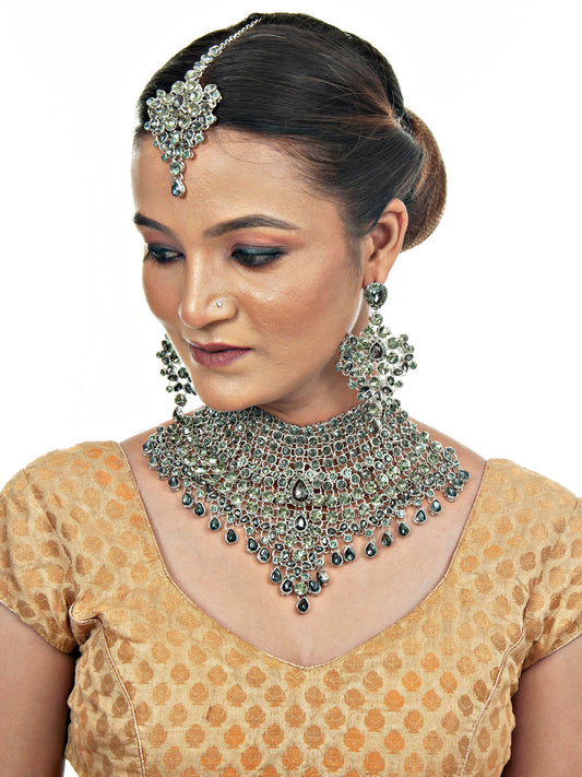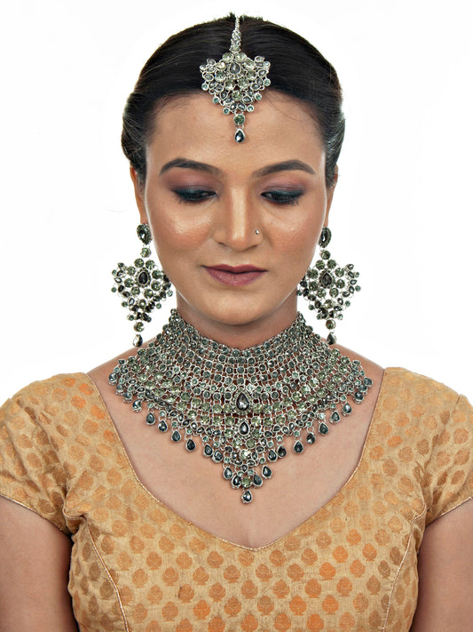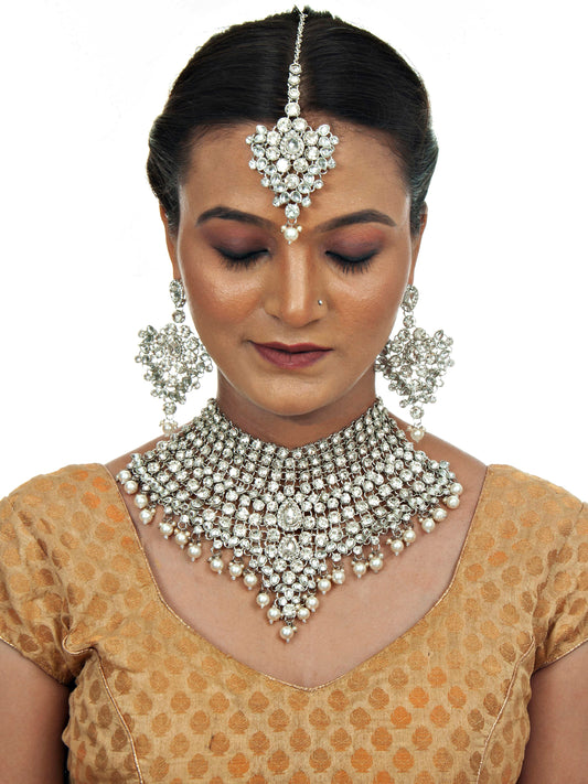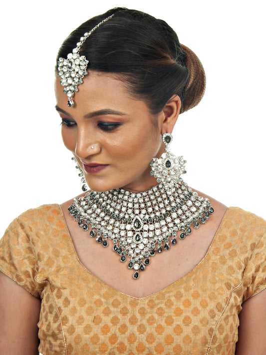 Platinum Plated Silver Polish Stone Mini Bridal Choker Set for Women & Girls