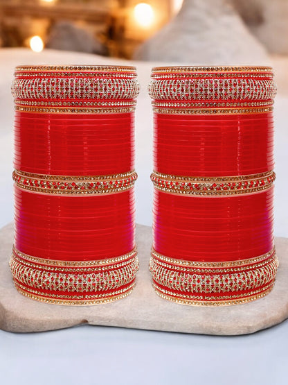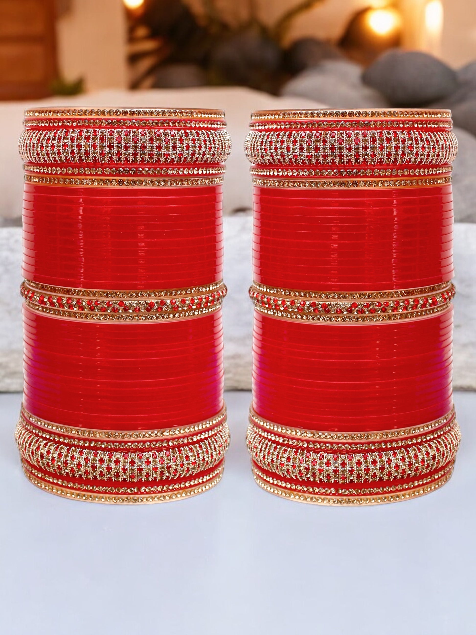 Lucky Jewellery Bridal Bangle Set Red Designer Chura Wedding Punjabi Choora Fashion Jewellery Chuda Set Celebrate your special day with the timeless elegance of our Bridal Punjabi Chura. This stunning set of traditional red bangles, adorned with intricate, symbolizes prosperity and marital bliss. Each bangle is crafted with meticulous attention to detail, blending classic artistry with modern flair to create a truly unique accessory. Perfectly capturing the essence of Punjabi heritage, this chura will not only enhance your bridal ensemble but also serve as a cherished keepsake of your beautiful journey. Make an admirable gift for your Mother, Sister, Wife and Girlfriend. | Ideal For Party, Office & Daily Wear | Can Be Used On Birthday, Marriage, Engagement, Shadi Any Occassion. |