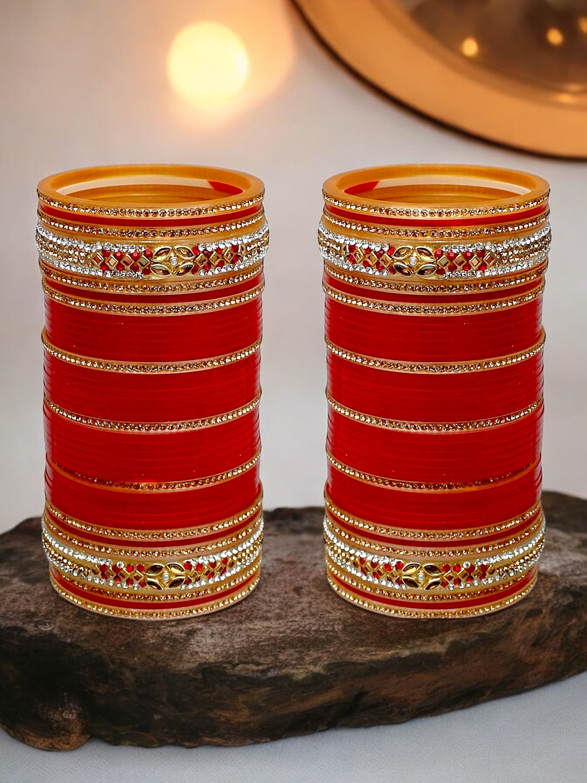Lucky Jewellery Bridal Bangle Set Red Designer Chura Dulhan Wedding Punjabi Choora Fashion Jewellery Chuda For Women Celebrate your special day with the timeless elegance of our Bridal Punjabi Chura. This stunning set of traditional red bangles, adorned with intricate, symbolizes prosperity and marital bliss. Each bangle is crafted with meticulous attention to detail, blending classic artistry with modern flair to create a truly unique accessory. Perfectly capturing the essence of Punjabi heritage, this chura will not only enhance your bridal ensemble but also serve as a cherished keepsake of your beautiful journey. Make an admirable gift for your Mother, Sister, Wife and Girlfriend. | Ideal For Party, Office & Daily Wear | Can Be Used On Birthday, Marriage, Engagement, Shadi Any Occassion. |