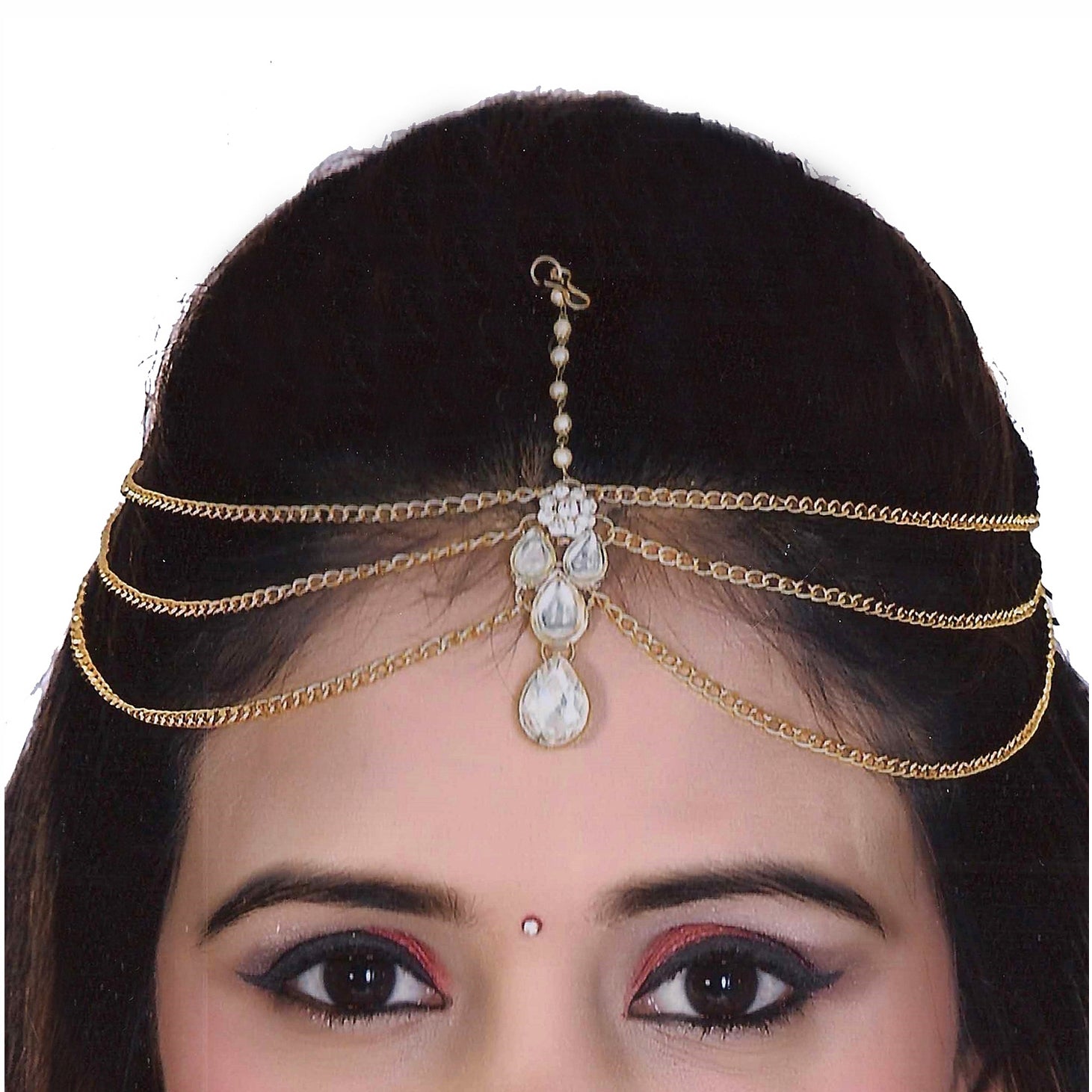 Complete your stunning look by adorning this beautiful style maang tika that will enhance your beauty. Alloy has been used in the making of this stunner, which has been embellished with perfectly cut and stones. The extra layers of maatha patti attached to it, adds to its elegance. Beautiful matha patti for women to wear on all festive occasions and weddings to accentuate their beauty.