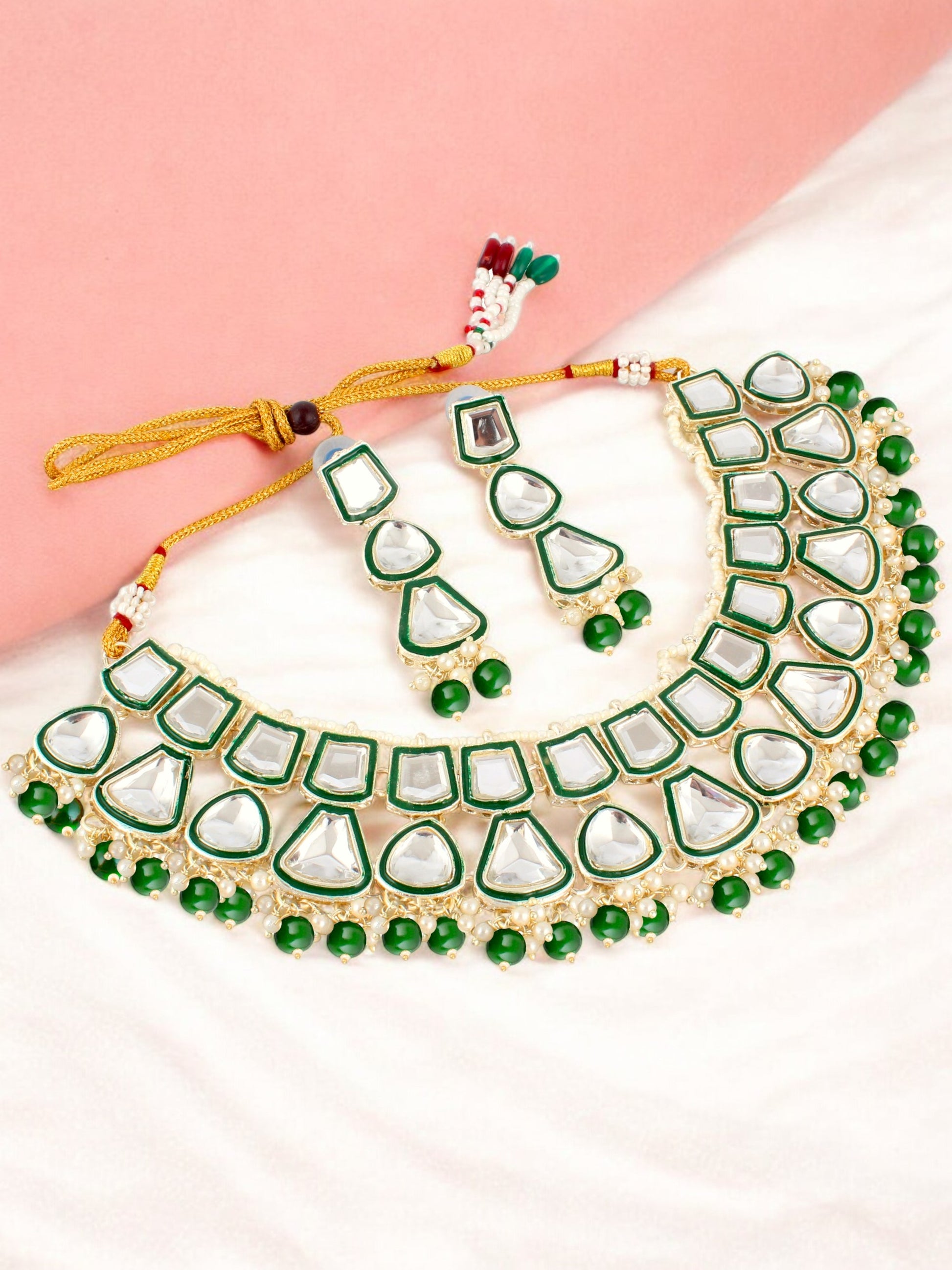 Designer White Gold-Plated Kundan Choker Necklace Set for Women & Girls – Green Meenakari Work(842-ISK-2031-G)