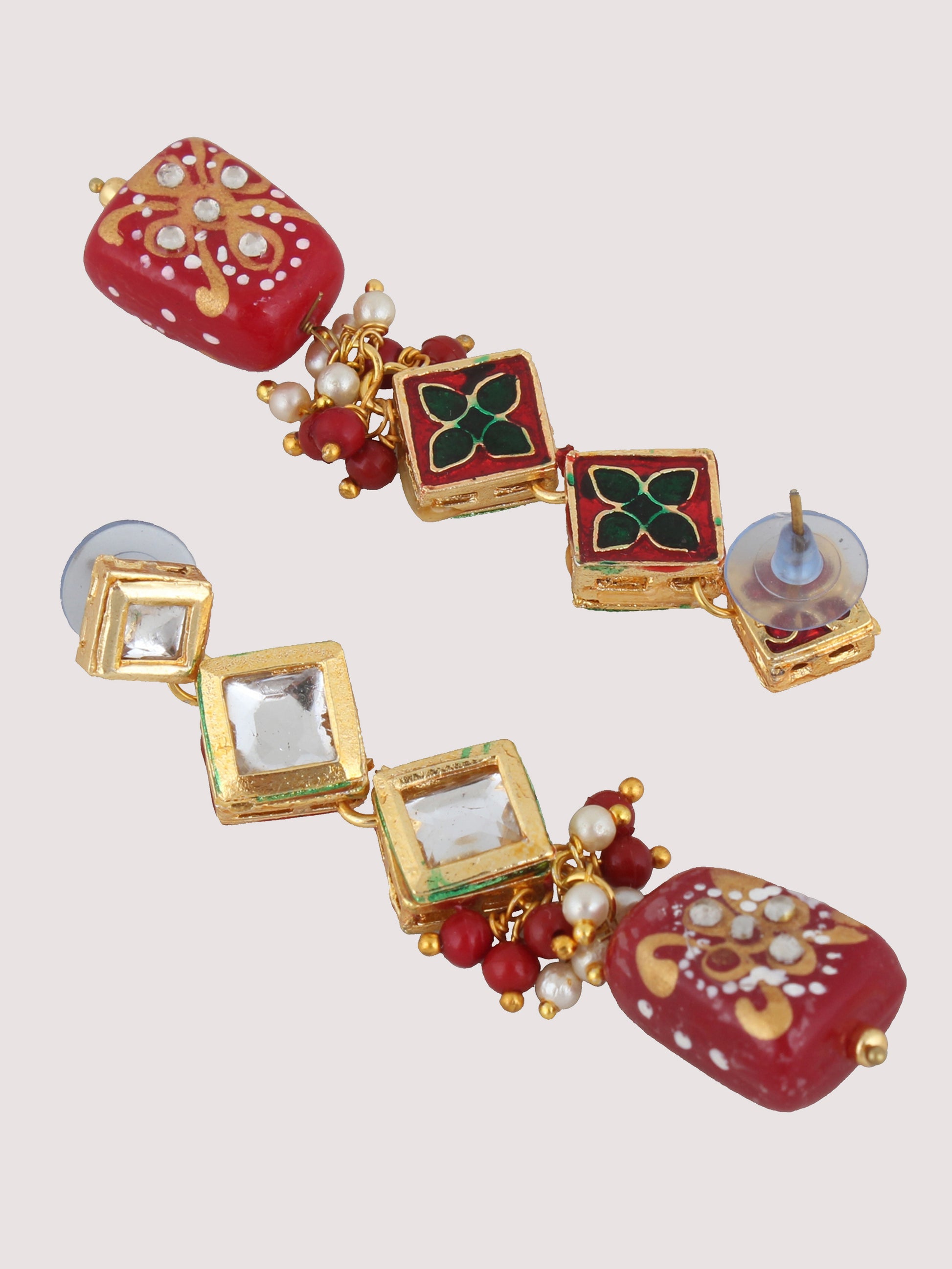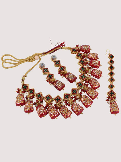 | LUCKY JEWELLERY Back Meenakari 18k Gold Plated Maroon Color Tika Earring Combo Uncut Big Faux Kundan Choker Necklace set This stunning Necklace set from LUCKY JEWELLERY will certainly delight all the lovely Indian girls, who are ready to get married. This Necklace set includes matching earrings, one Necklace Set. Further, this set is studded with finest quality of coloured and white stones that render amazing look.