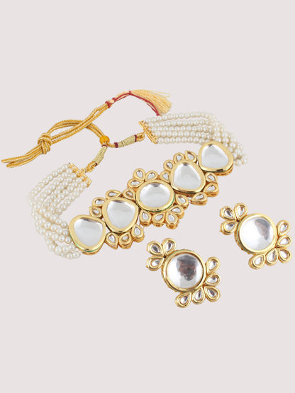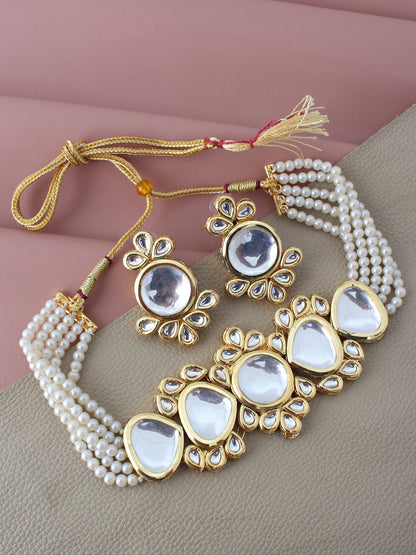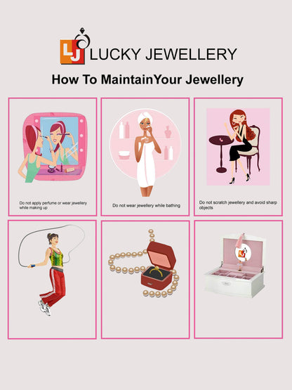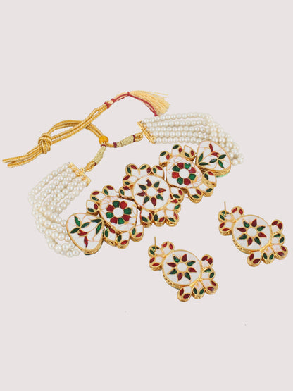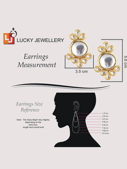 | LUCKY JEWELLERY Back Meenakari 18k Gold Plated White Color Earring Combo Uncut Big Faux Kundan Choker Necklace set This stunning Necklace set from LUCKY JEWELLERY will certainly delight all the lovely Indian girls, who are ready to get married. This Necklace set includes matching earrings, one Necklace Set. Further, this set is studded with finest quality of coloured and white stones that render amazing look.