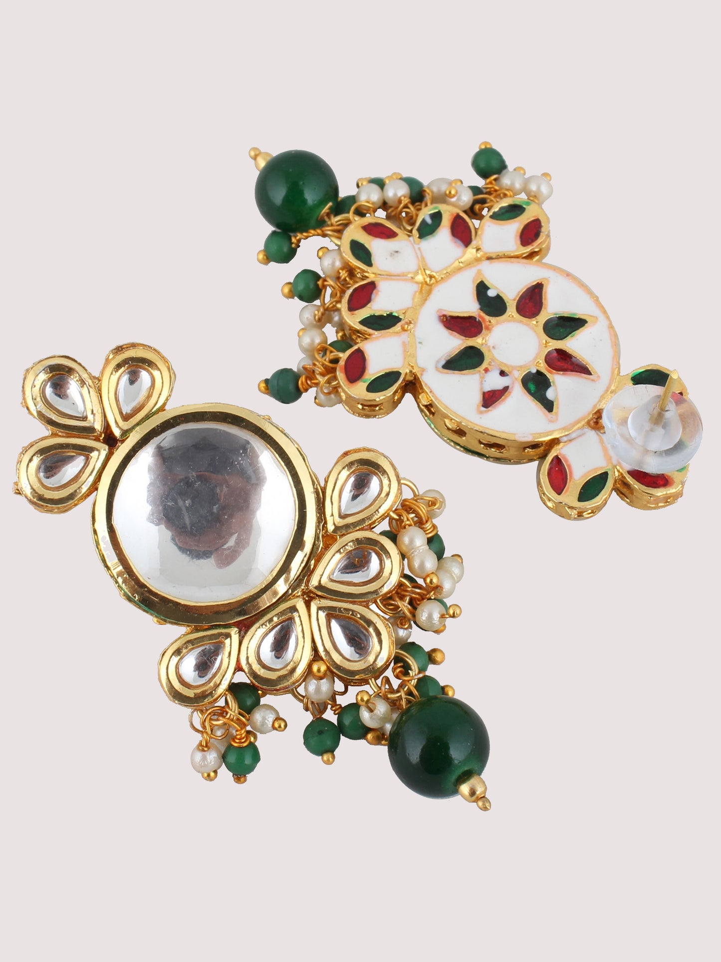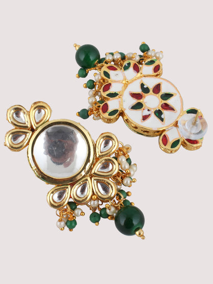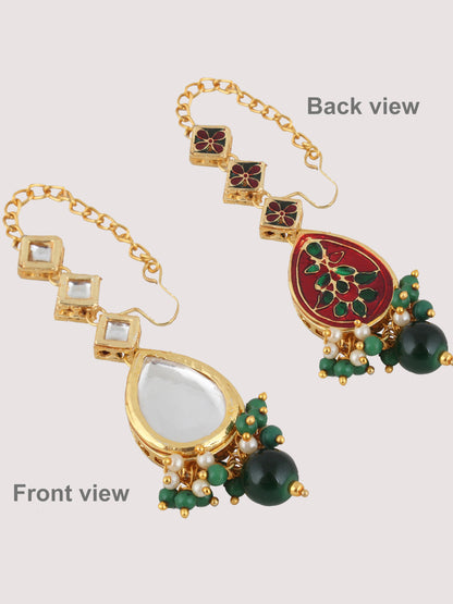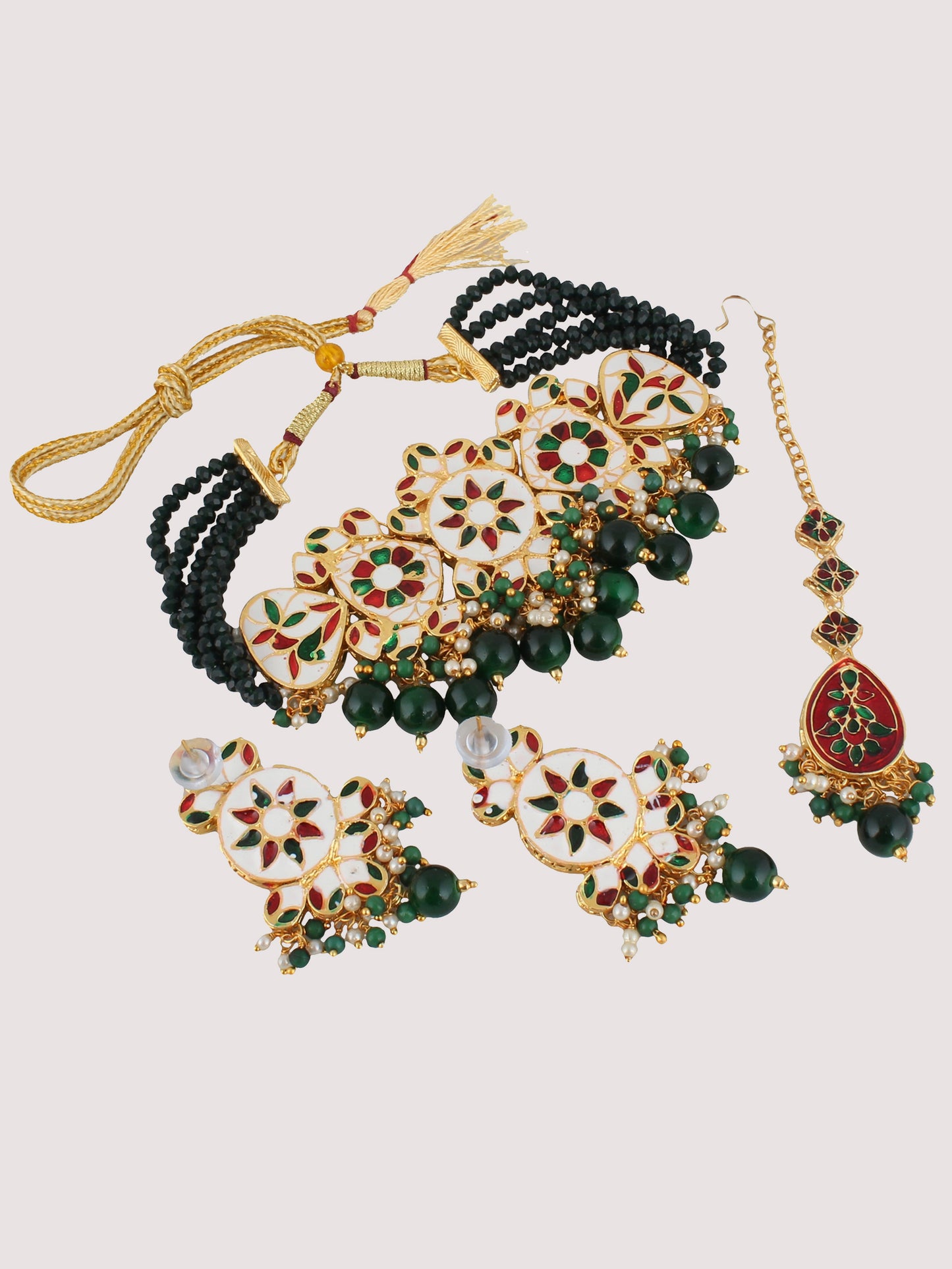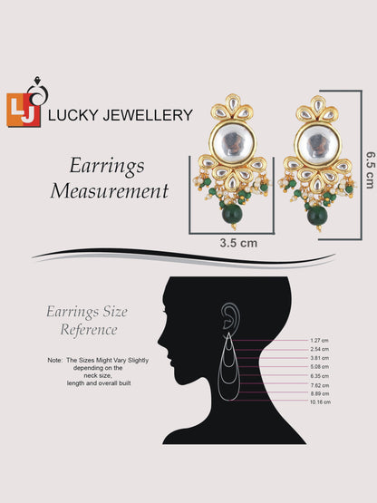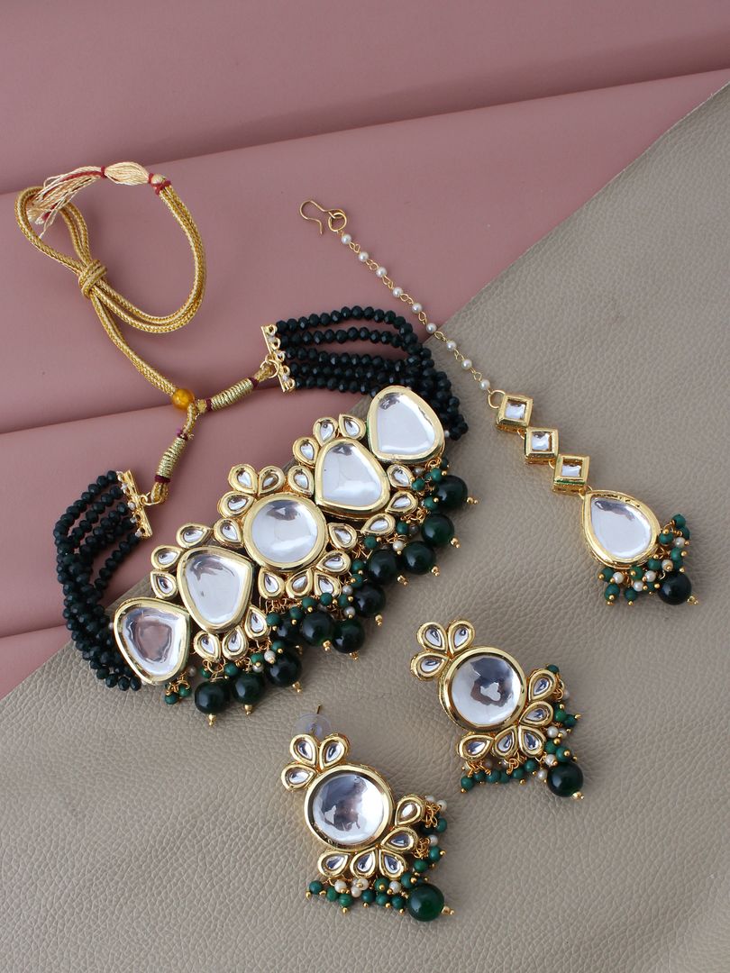| LUCKY JEWELLERY Back Meenakari 18k Gold Plated Green Color Tika Earring Combo Uncut Big Faux Kundan Choker Necklace set This stunning Necklace set from LUCKY JEWELLERY will certainly delight all the lovely Indian girls, who are ready to get married. This Necklace set includes matching earrings, one Necklace Set. Further, this set is studded with finest quality of coloured and white stones that render amazing look.