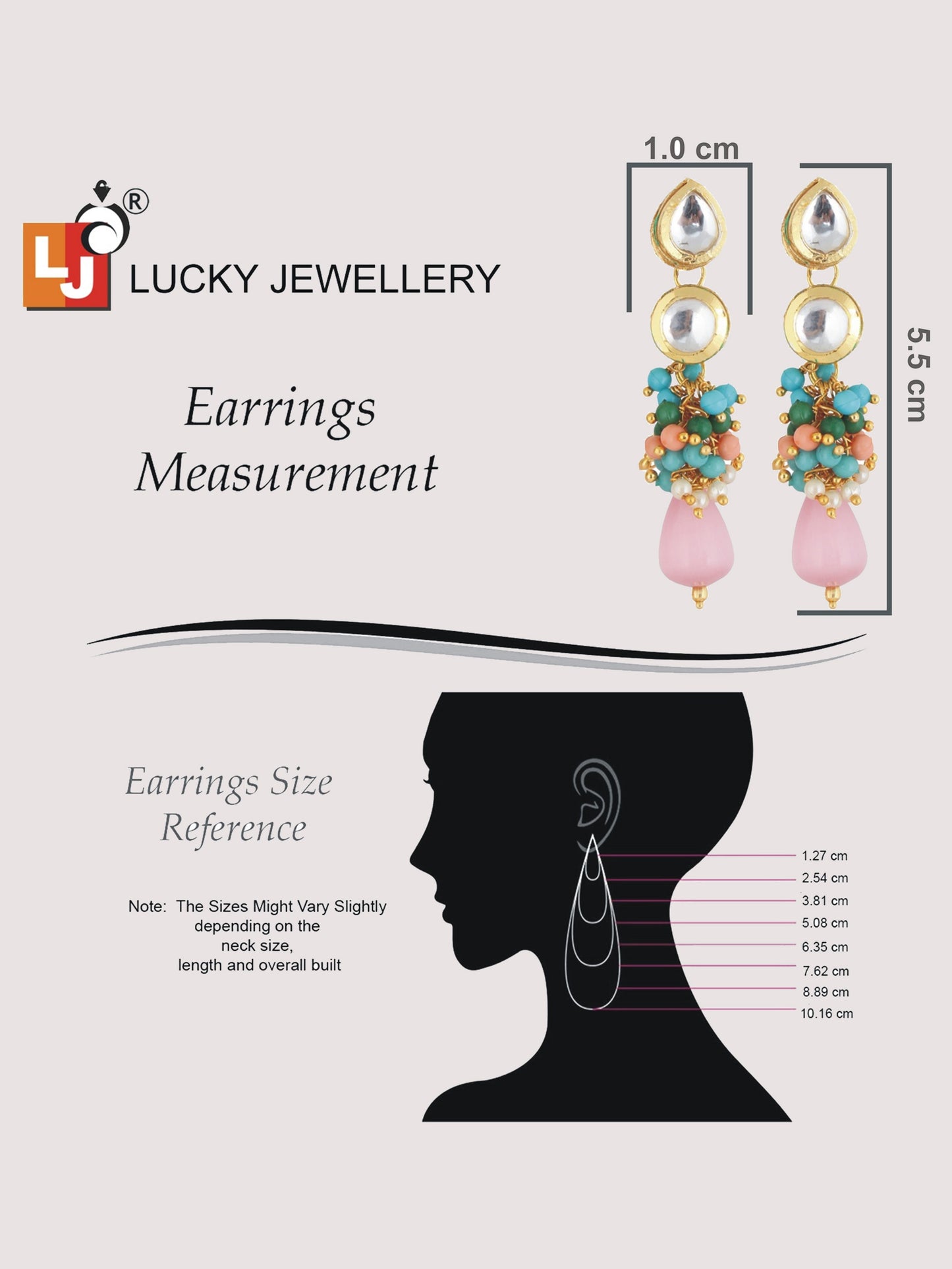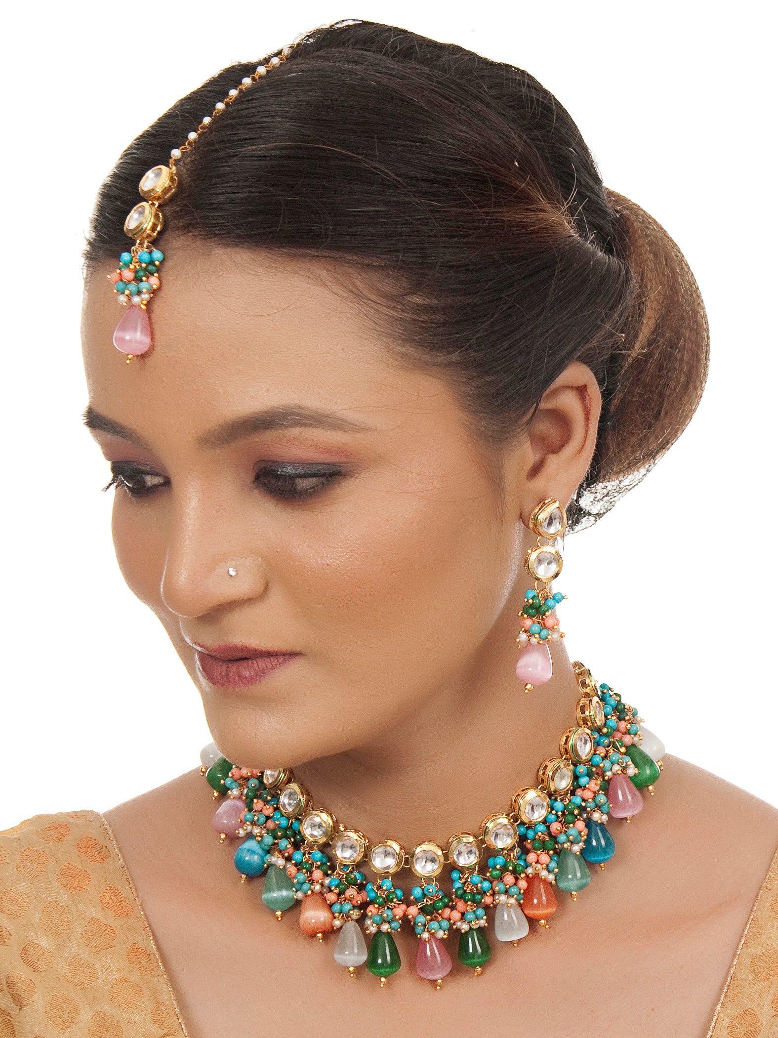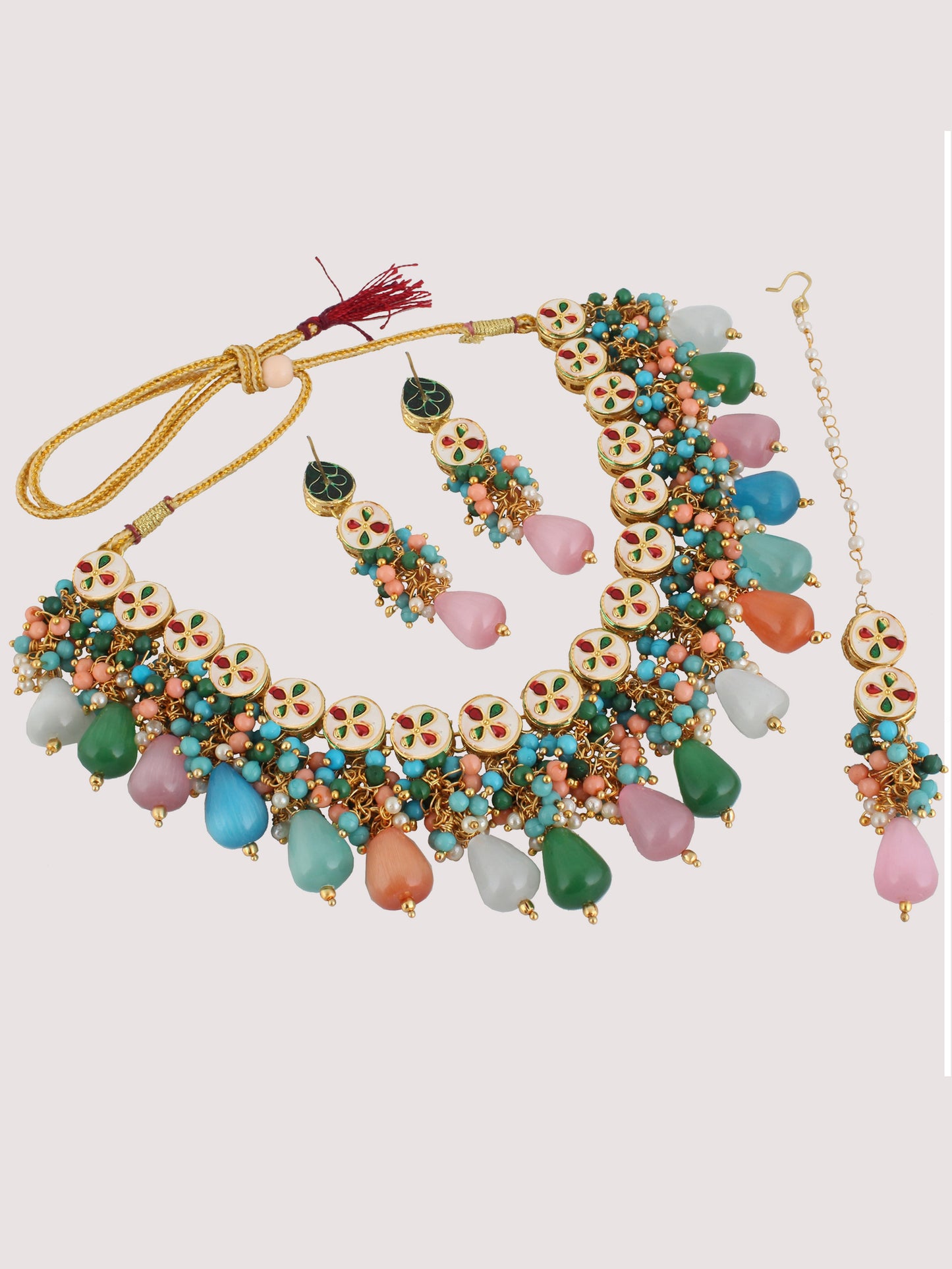 | LUCKY JEWELLERY Back Meenakari 18k Gold Plated Multicolor Tika Earring Combo Uncut Big Faux Kundan Choker Necklace set This stunning Necklace set from LUCKY JEWELLERY will certainly delight all the lovely Indian girls, who are ready to get married. This Necklace set includes matching earrings, one Necklace Set. Further, this set is studded with finest quality of coloured and white stones that render amazing look.