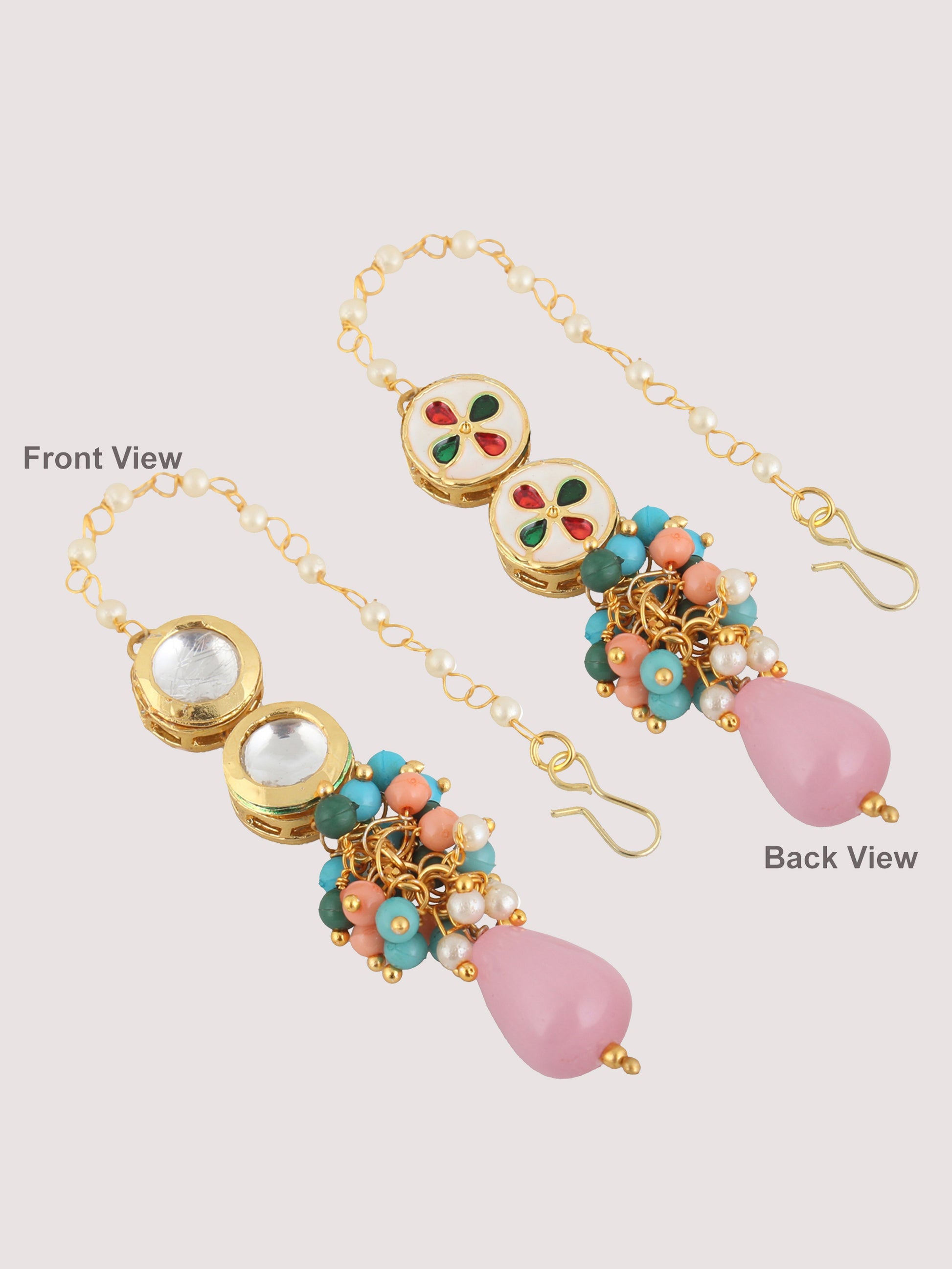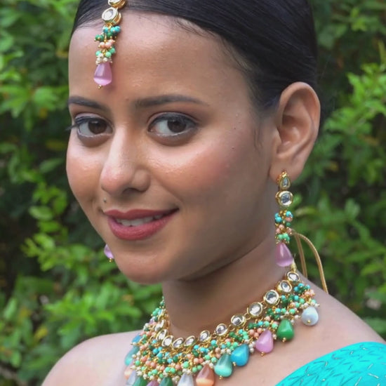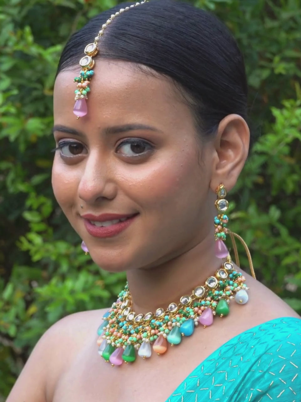 | LUCKY JEWELLERY Back Meenakari 18k Gold Plated Multicolor Tika Earring Combo Uncut Big Faux Kundan Choker Necklace set This stunning Necklace set from LUCKY JEWELLERY will certainly delight all the lovely Indian girls, who are ready to get married. This Necklace set includes matching earrings, one Necklace Set. Further, this set is studded with finest quality of coloured and white stones that render amazing look.