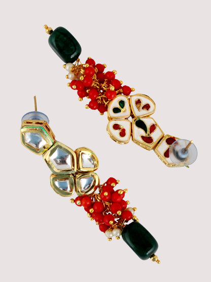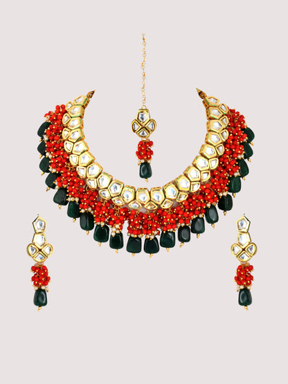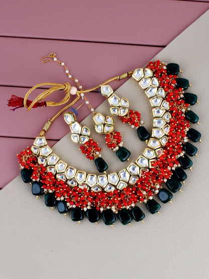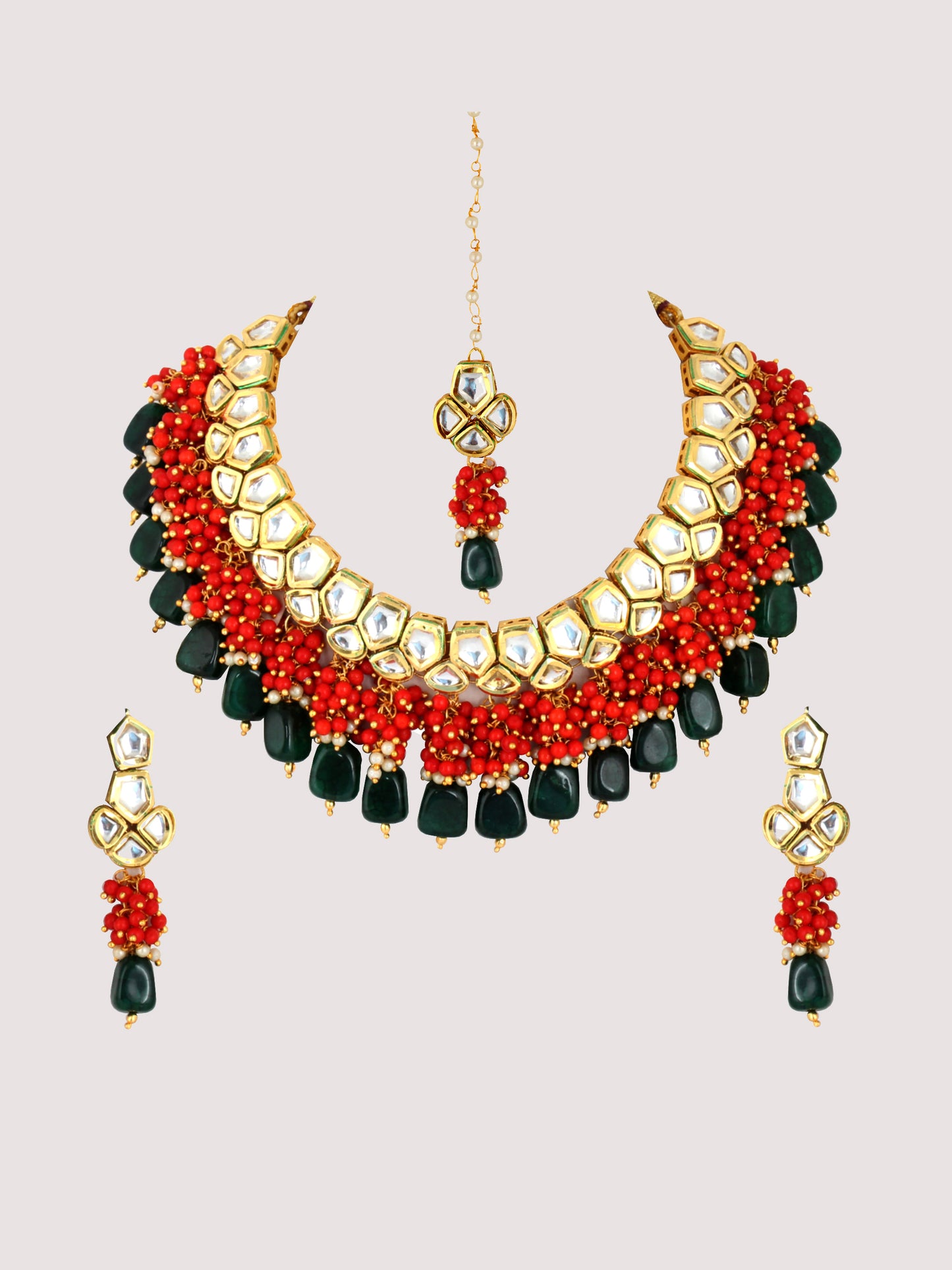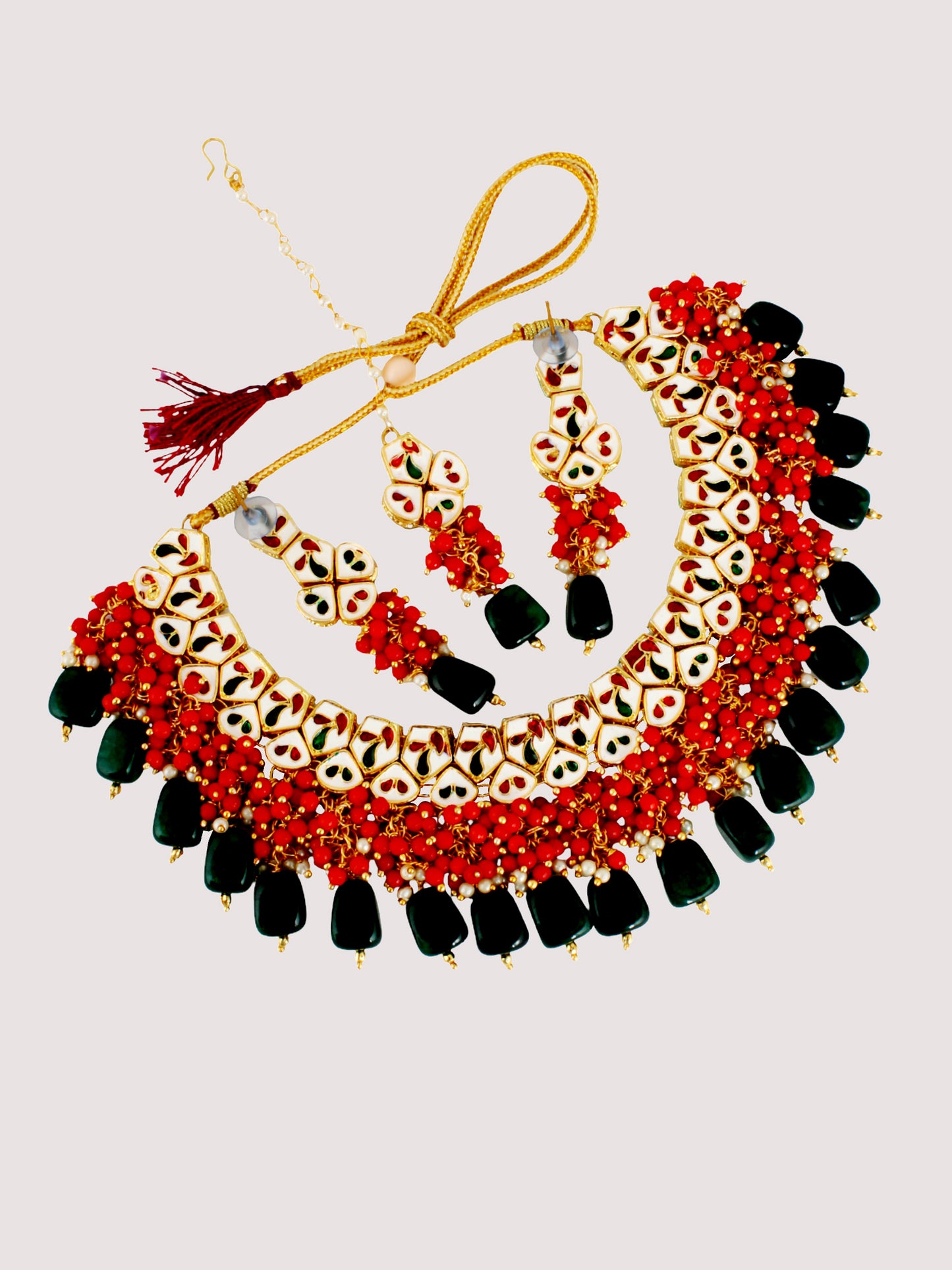 | Meenakari 18K Gold plated party wear Multicolor pentagon shape Uncut Kundan Combo Necklace Set This stunning Necklace set from LUCKY JEWELLERY will certainly delight all the lovely Indian girls, who are ready to get married. This Necklace set includes matching earrings, one Necklace Set. Further, this set is studded with finest quality of coloured and white stones that render amazing look.