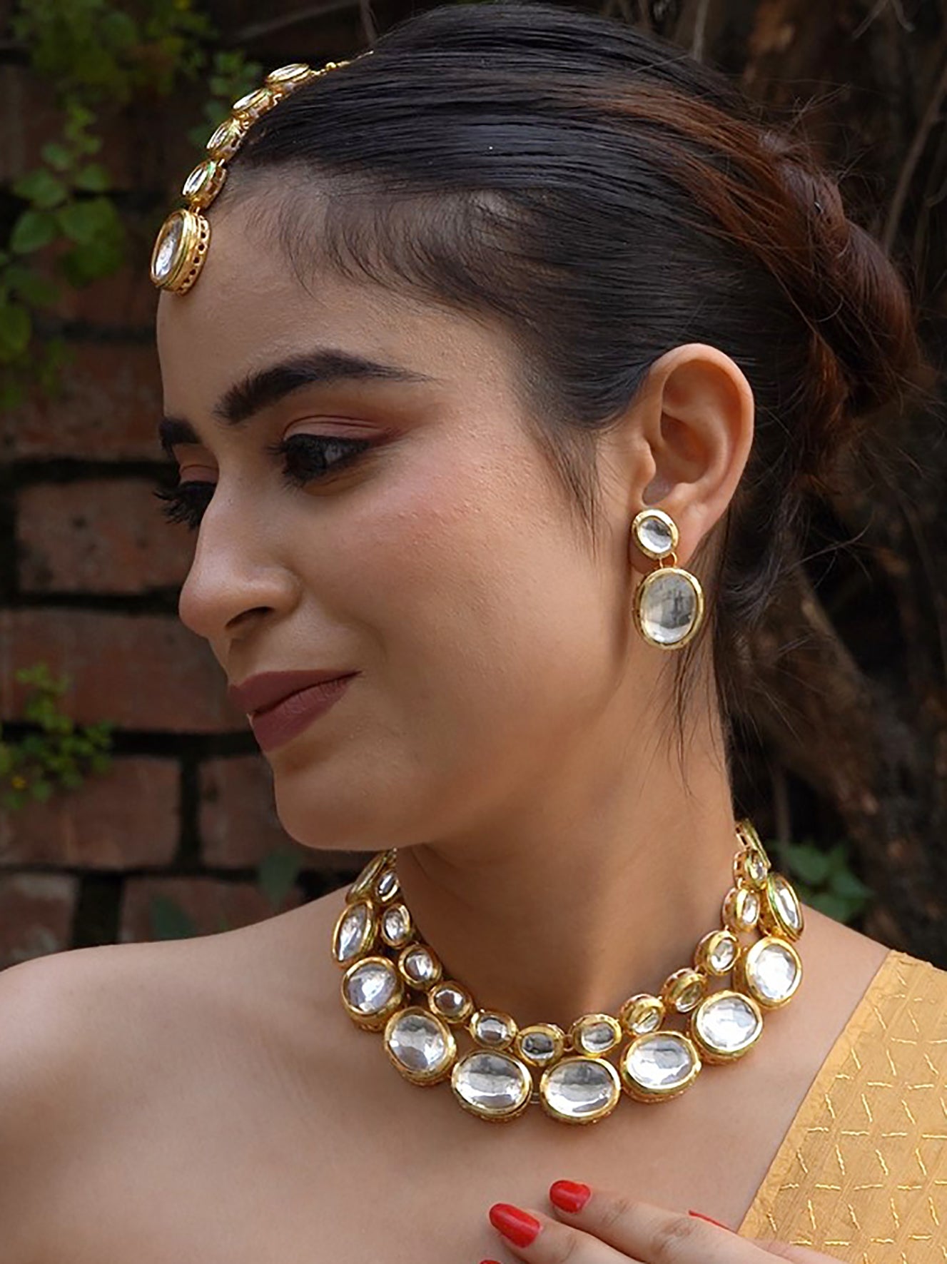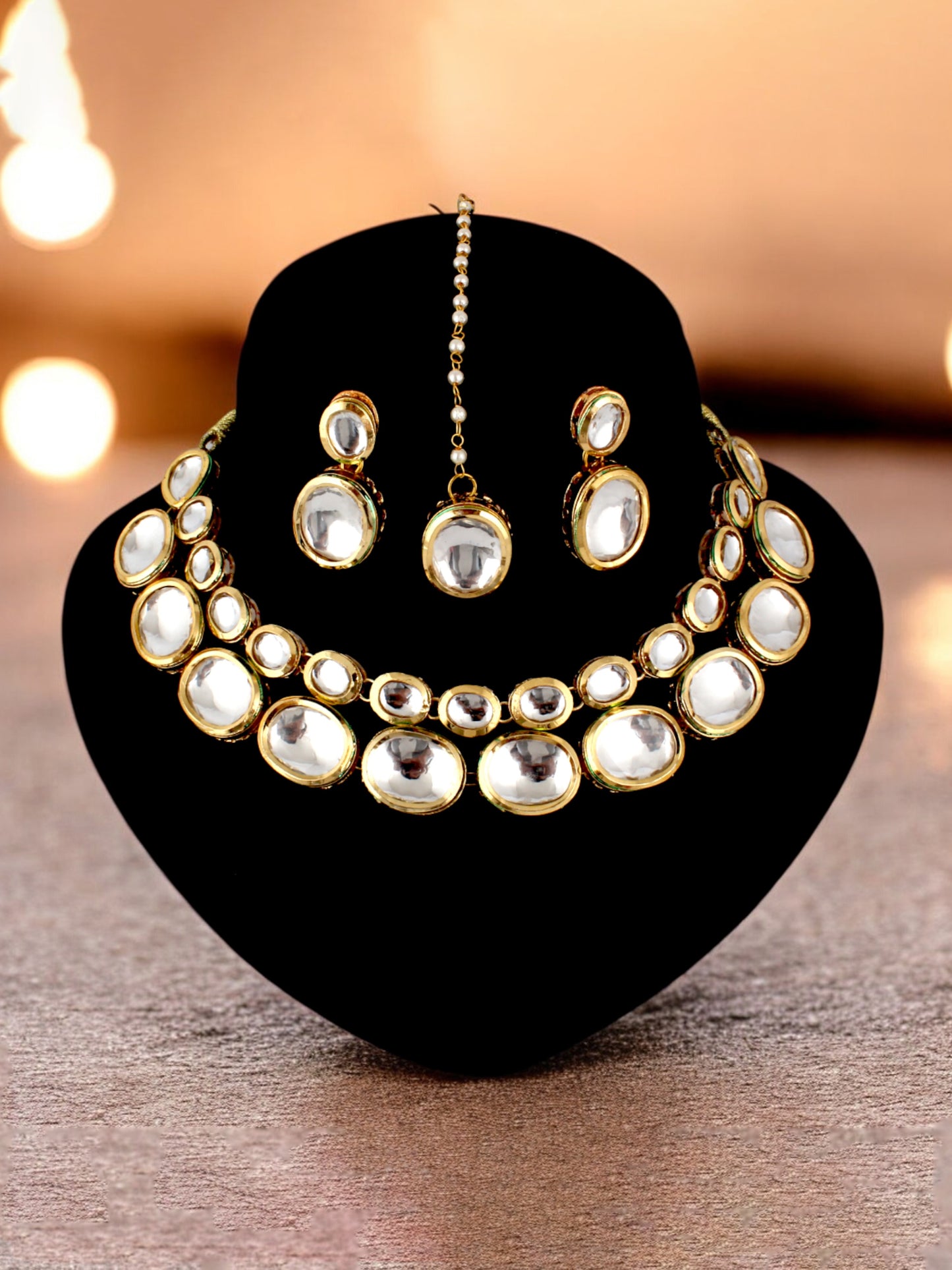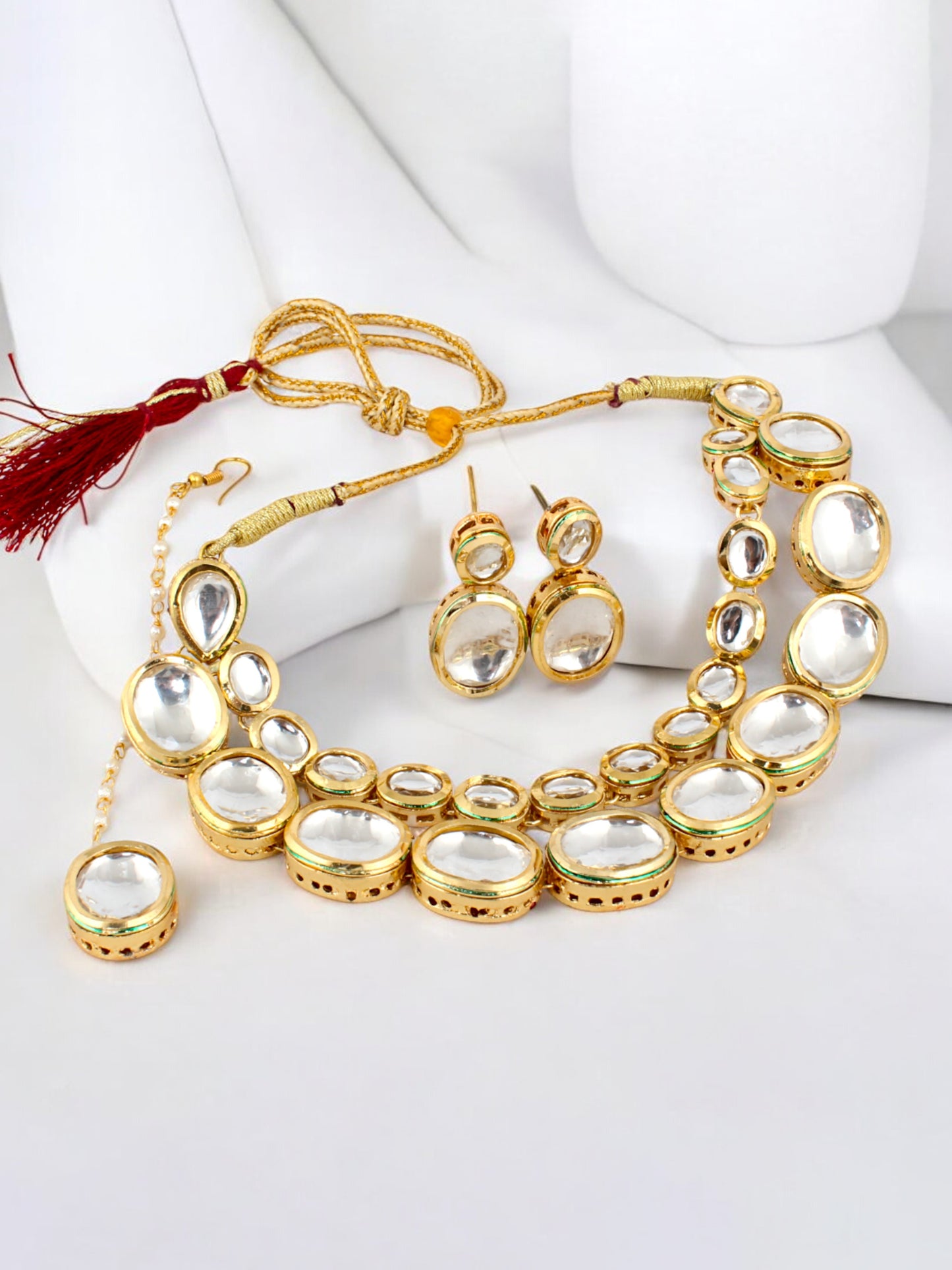 Lucky Jewellery Back Meenakari 18k Gold Plated White Color Tika Earring Combo Set Uncut Big Square Kundan Double Layered Stone Choker Necklace set Women & Girls