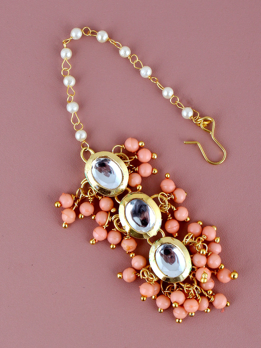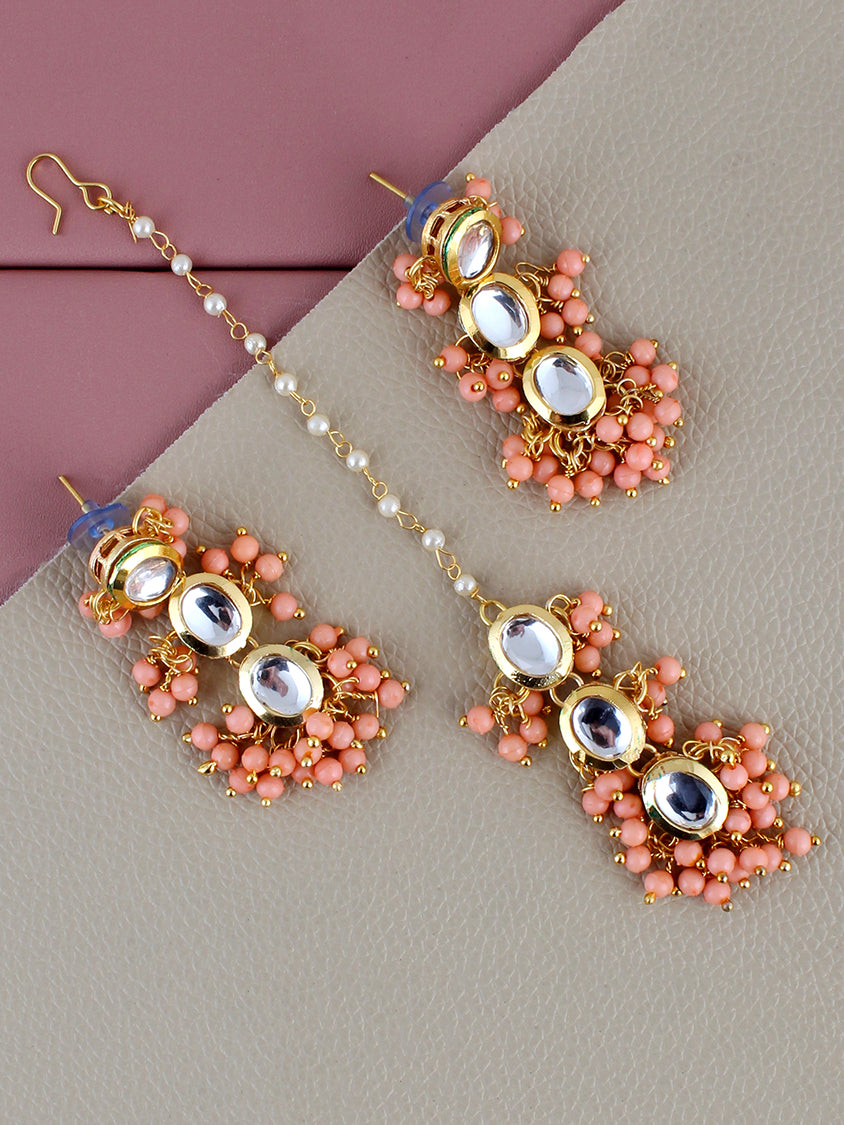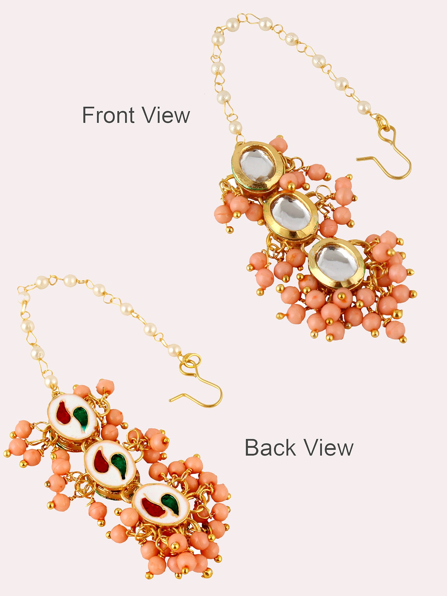 Lucky Jewellery Traditional Back Meena 18k Gold Plated uncut kundan Peach color Tika Earring set for Girls & women This stunning pair of Earring Tikka from LUCKY JEWELLERY will certainly delight all the lovely Indian Girls. Further, This Stunning Pair of Earring Tikka Set Is Studded with Finest Quality of Coloured & White Kundan Stones Which Are Coupled with Finest Array of Pearls, That Gives Render Amazing Look. Further More This Piece of Jewellery Is Decorated with Finest Craftsmanship in Meenakari Originating from The Roots of India. (Dimension:- Earrings Length:-8 cm, Earrings Width:-1.5 cm, Tika Length:-16 cm, Tika Width:-1.5 cm)