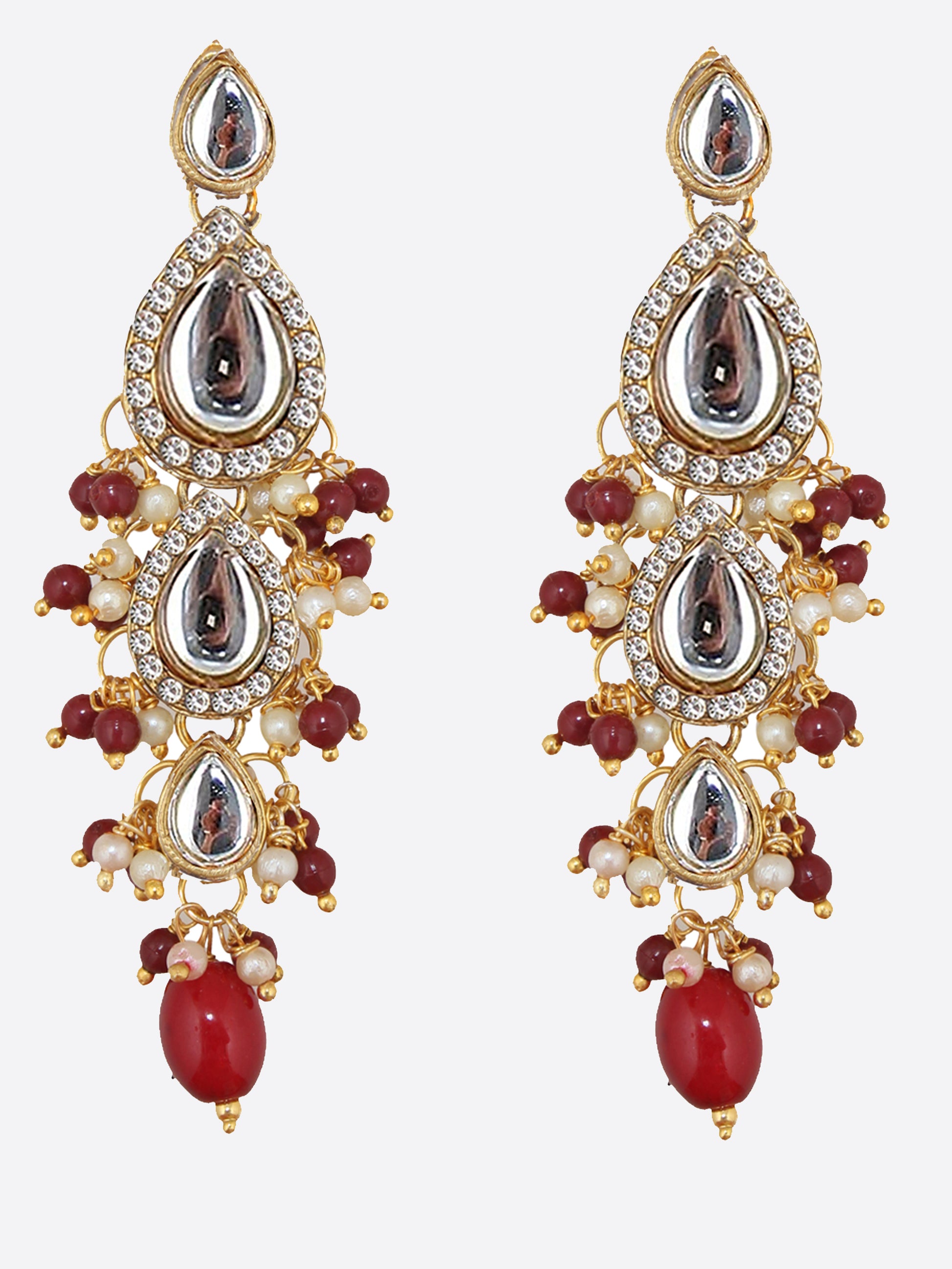 Lucky Jewellery Traditional Gold Plated kundan Stone Maroon color Tika Earring set for Girls & women This stunning pair of Earring Tikka from LUCKY JEWELLERY will certainly delight all the lovely Indian Girls. Further, This Stunning Pair of Earring Tikka Set Is Studded with Finest Quality of Coloured & White Kundan Stones Which Are Coupled with Finest Array of Pearls, That Gives Render Amazing Look. Further More This Piece of Jewellery Is Decorated with Finest Craftsmanship in Meenakari Originating from The Roots of India. (Dimension:- Earrings Length:-8 cm, Earrings Width:-1.5 cm, Tika Length:-16 cm, Tika Width:-1.5 cm)