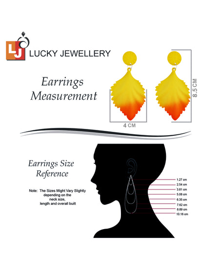 Lucky Jewellery Designer Yellow with Orange Color Leaf Design Dangle Earring For Girls & Women With a elegant earring so beautiful in your Fashion Jewelry collection, you never have to worry about not getting your fusion and gorgeous looks right. The earring has been crafted with utmost care and precision and boasts absolute perfection and flawlessness in terms of design and finish, which has been given a lovely plating and high polish. Complete the look by pairing this set with matching earring. This piece of jewelry comes with the Lucky Jewellery assurance of quality and durability.