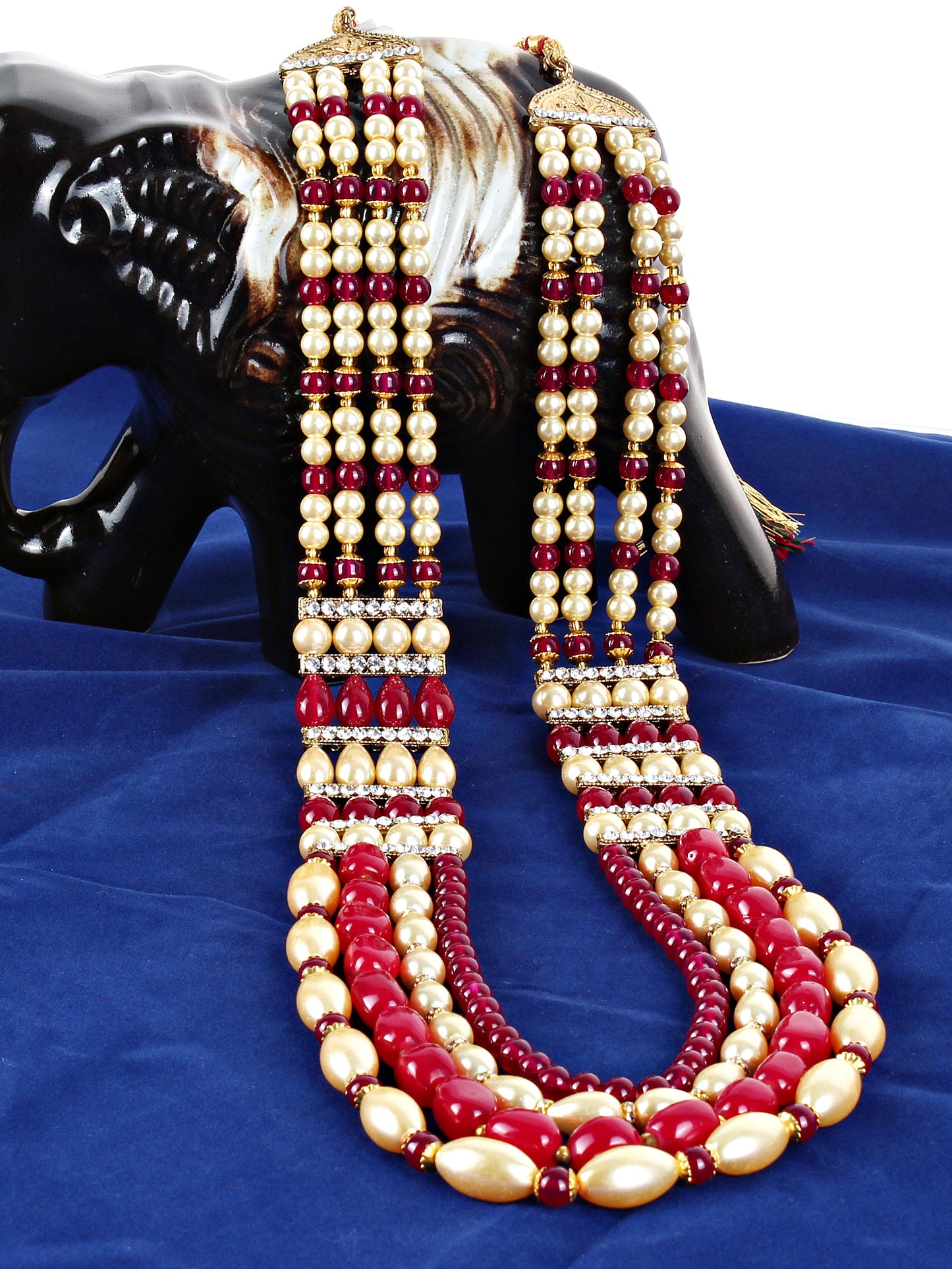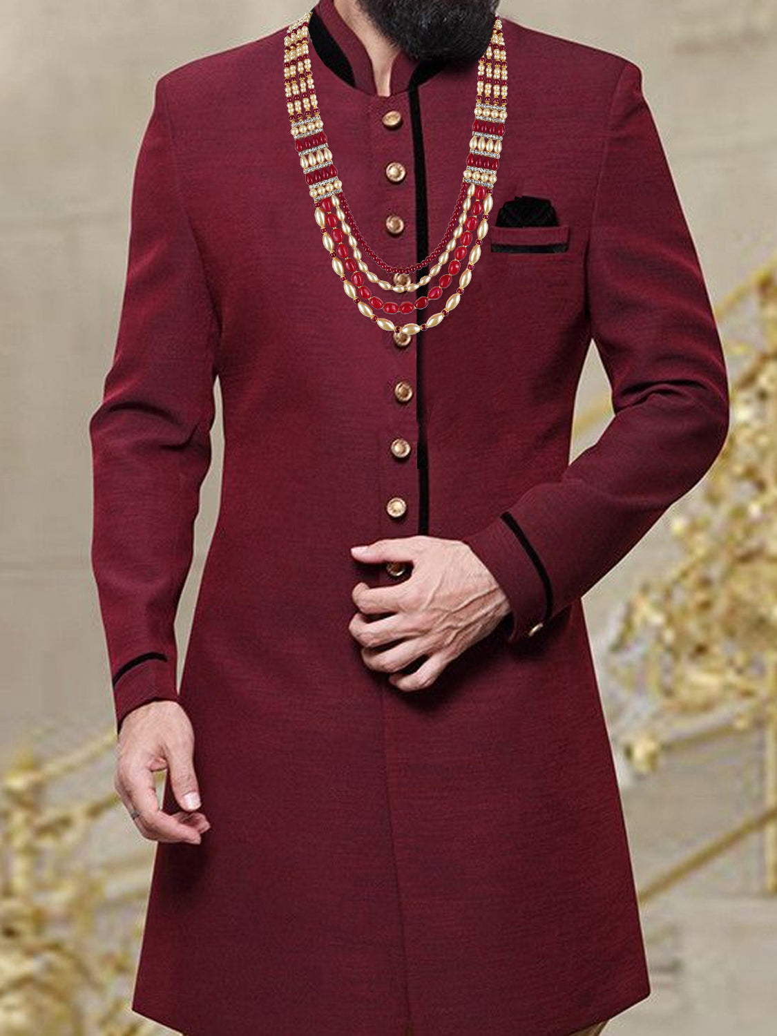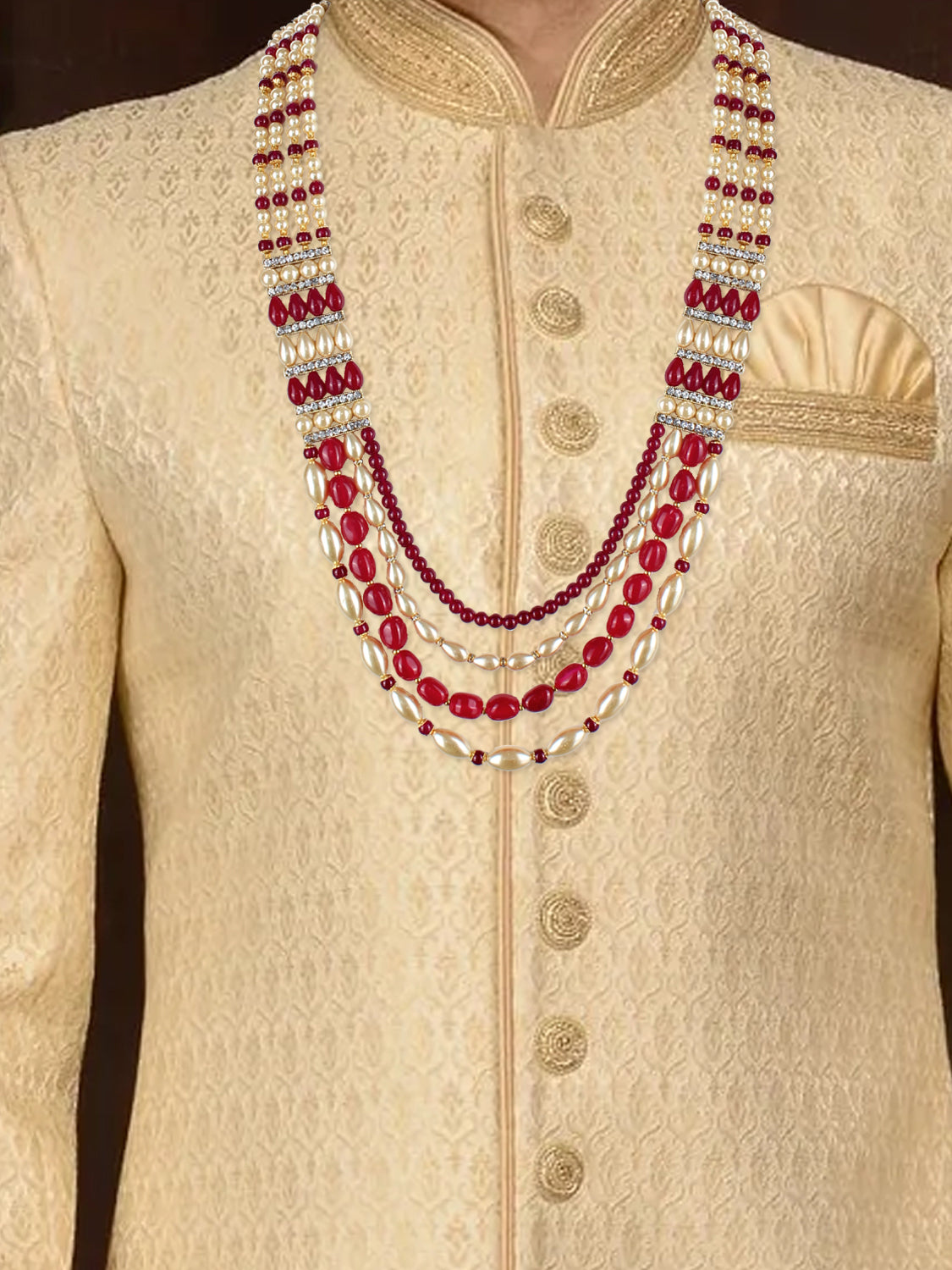 Lucky Jewellery Designer Wedding Multi Strand Gold Maroon Color Dulha Har Layered Pearl Maharaja Haar Groom Necklace Set for Men Create your different fashion statement by adorning this multiple layers of groom necklace with your wedding sherwani. It is made with pearl beads along with pearl beads and comes with adjustable dori, so that it could be adjusted properly. This royal look necklace is perfect pick for groom.