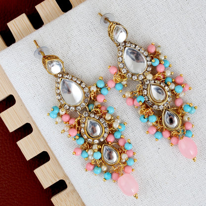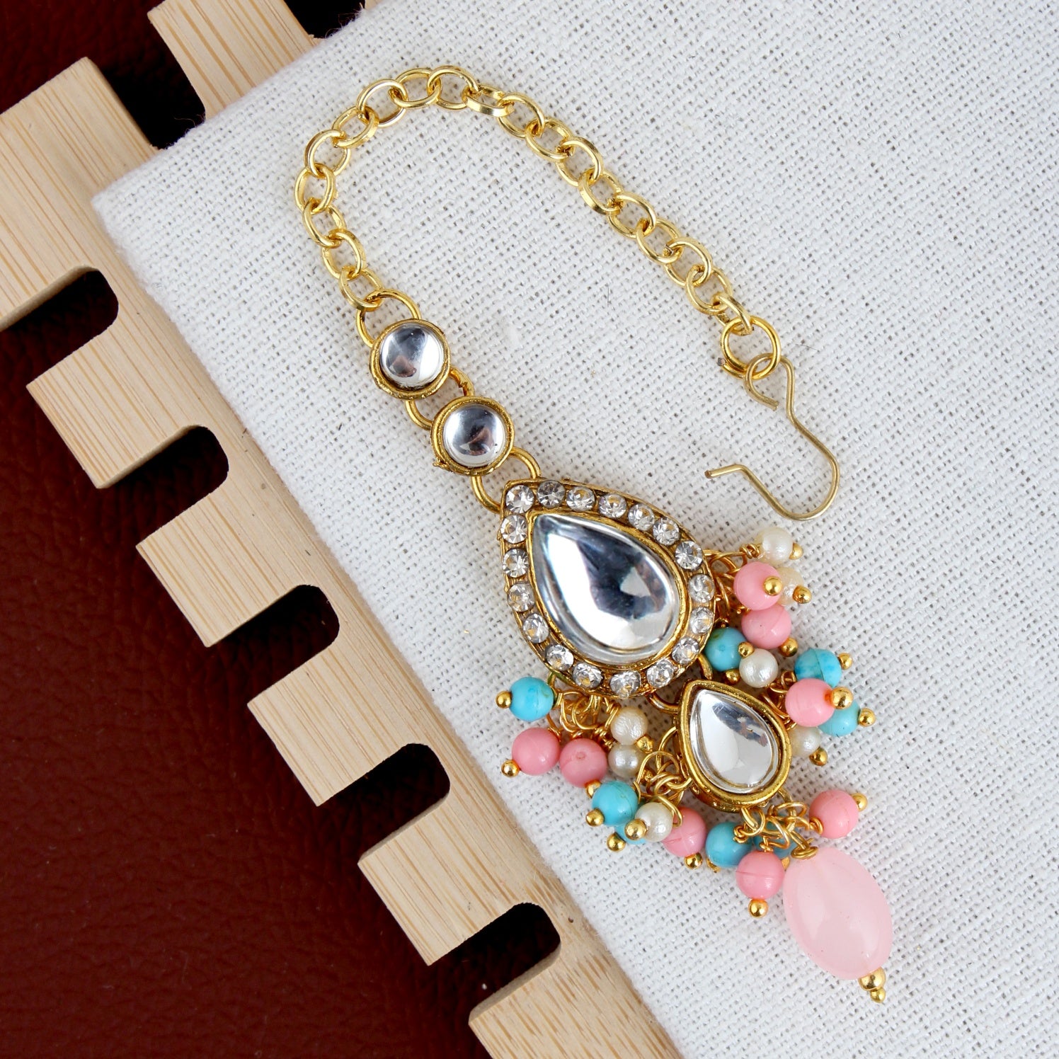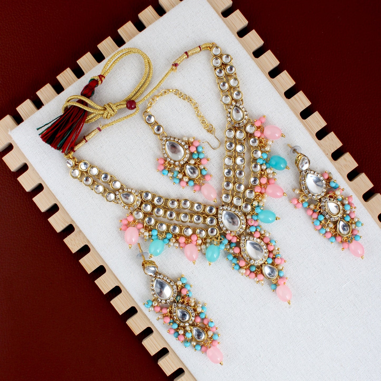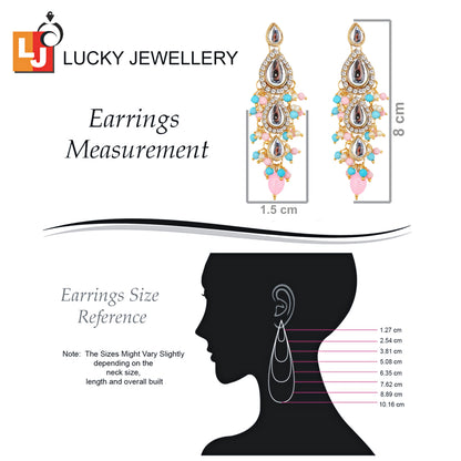 Lucky Jewellery Gold Plated Multi Color Tika Earring Necklace Combo Kundan Jewellery Set This stunning Necklace set from LUCKY JEWELLERY will certainly delight all the lovely Indian girls, who are ready to get married. This Necklace set includes matching earrings, one Necklace Set. Further, this set is studded with finest quality of coloured and white stones that render amazing look.