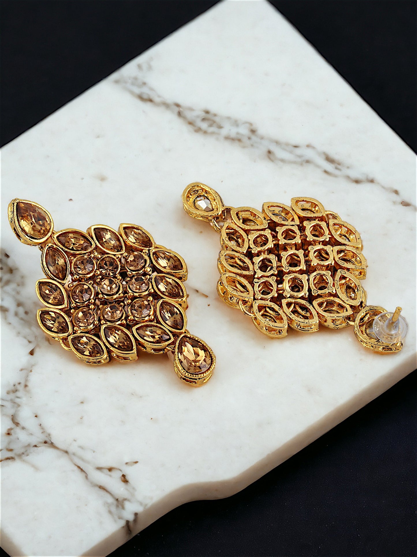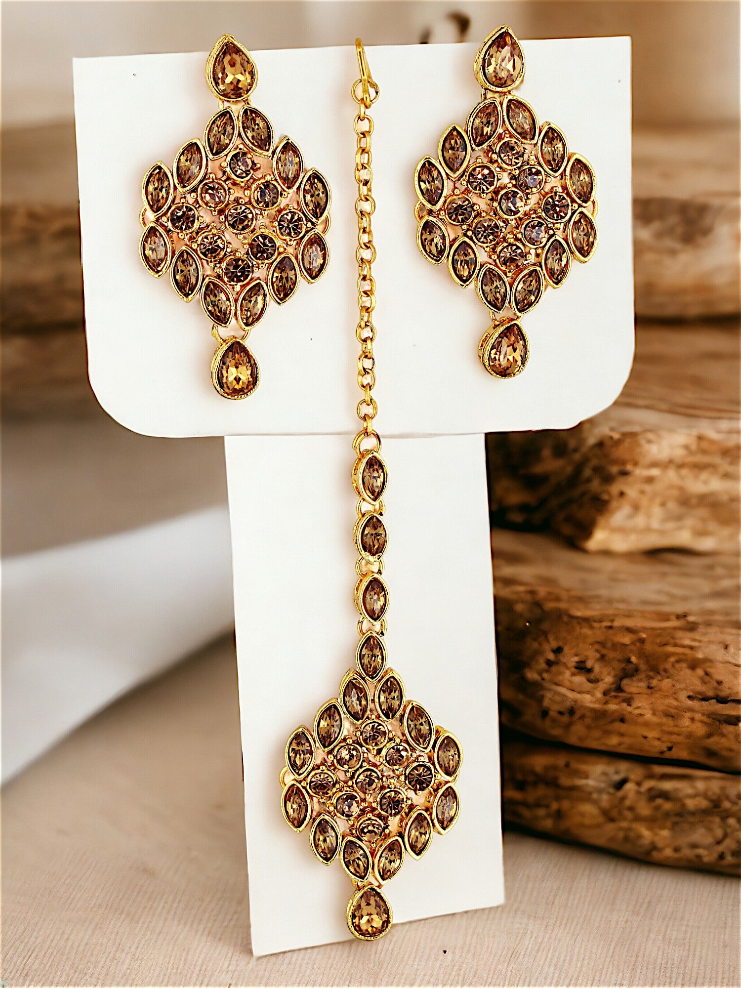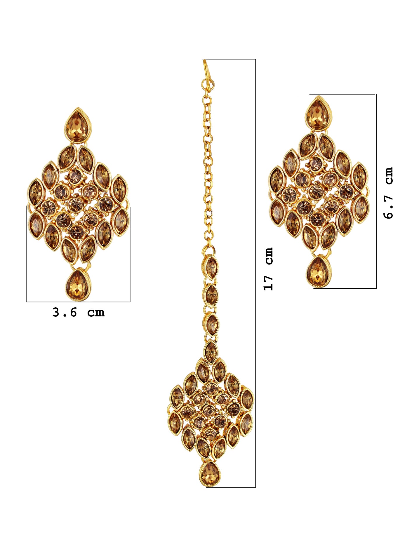 Designer Gold Color Stone Necklace Set and Earrings with Tika For Women & Girls