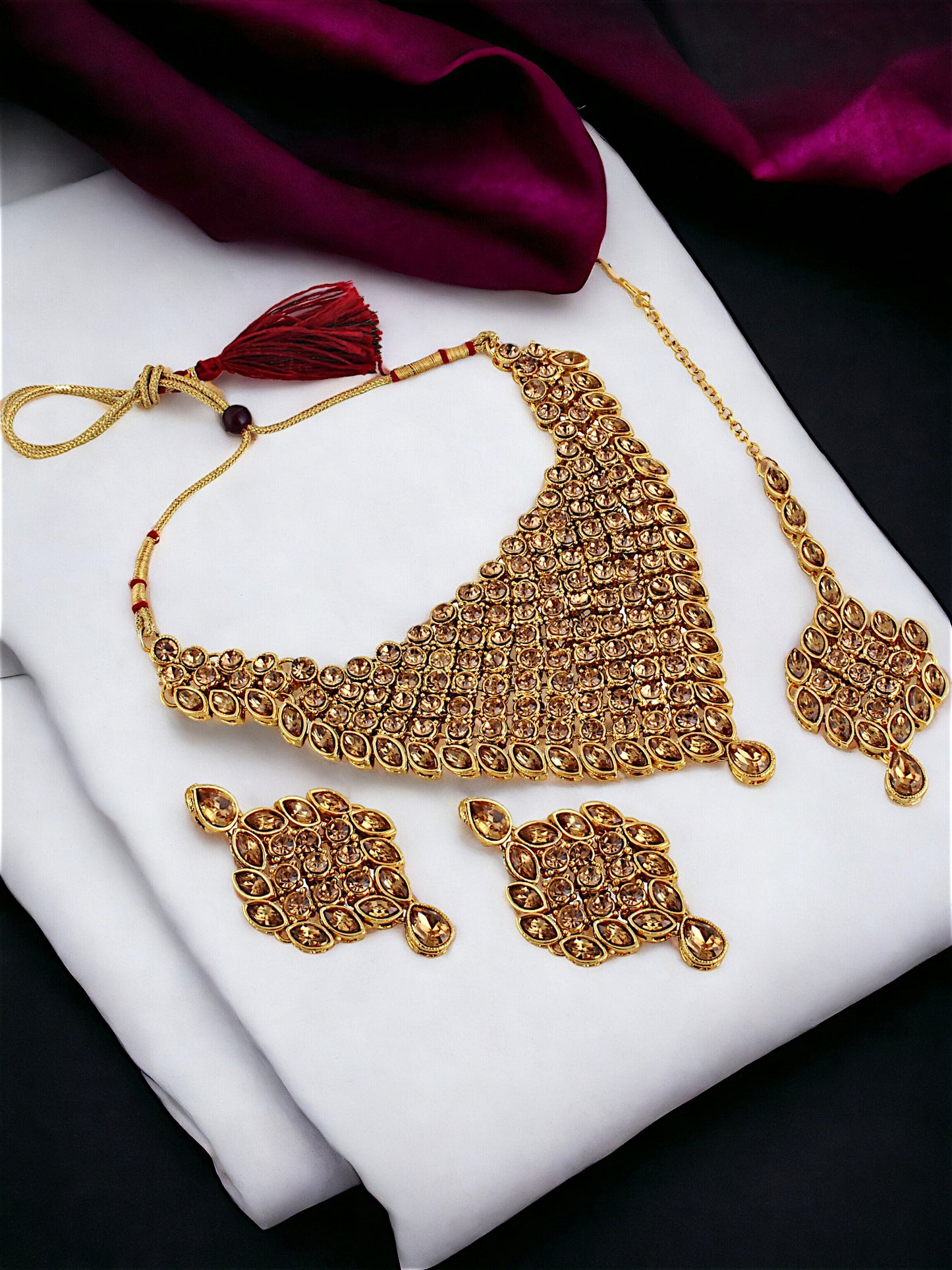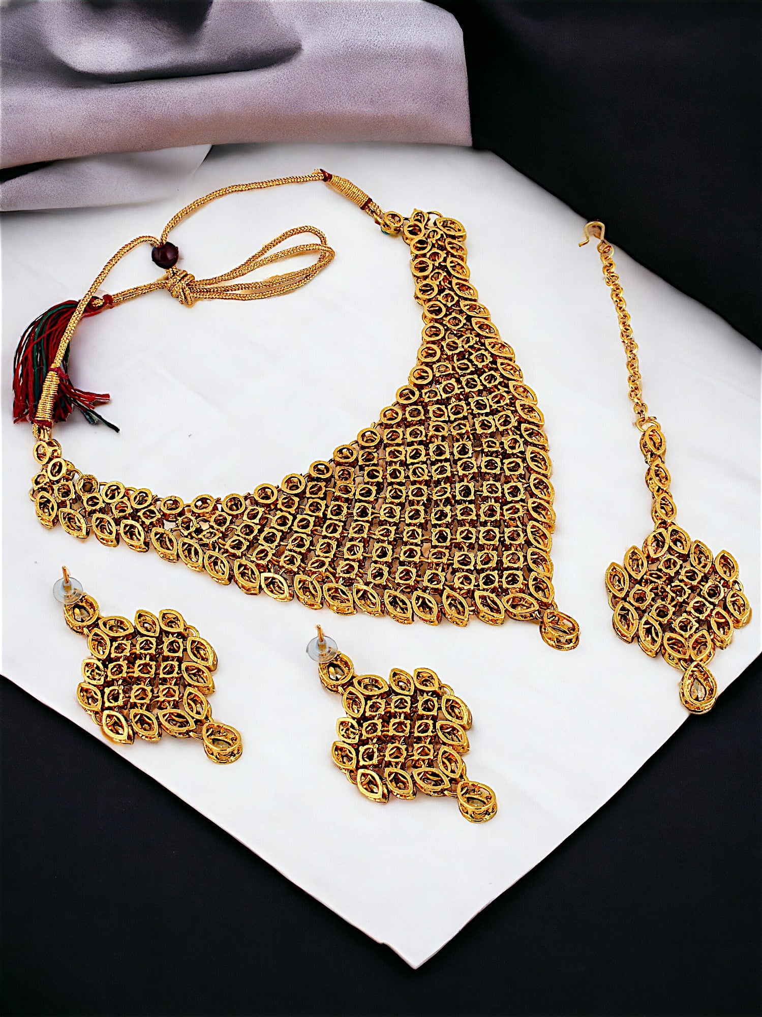 Embrace timeless elegance with our captivating gold color stone necklace set and earrings, accompanied by a stunning tika. This exquisite ensemble is meticulously crafted to adorn you with sophistication and grace on your special day.
