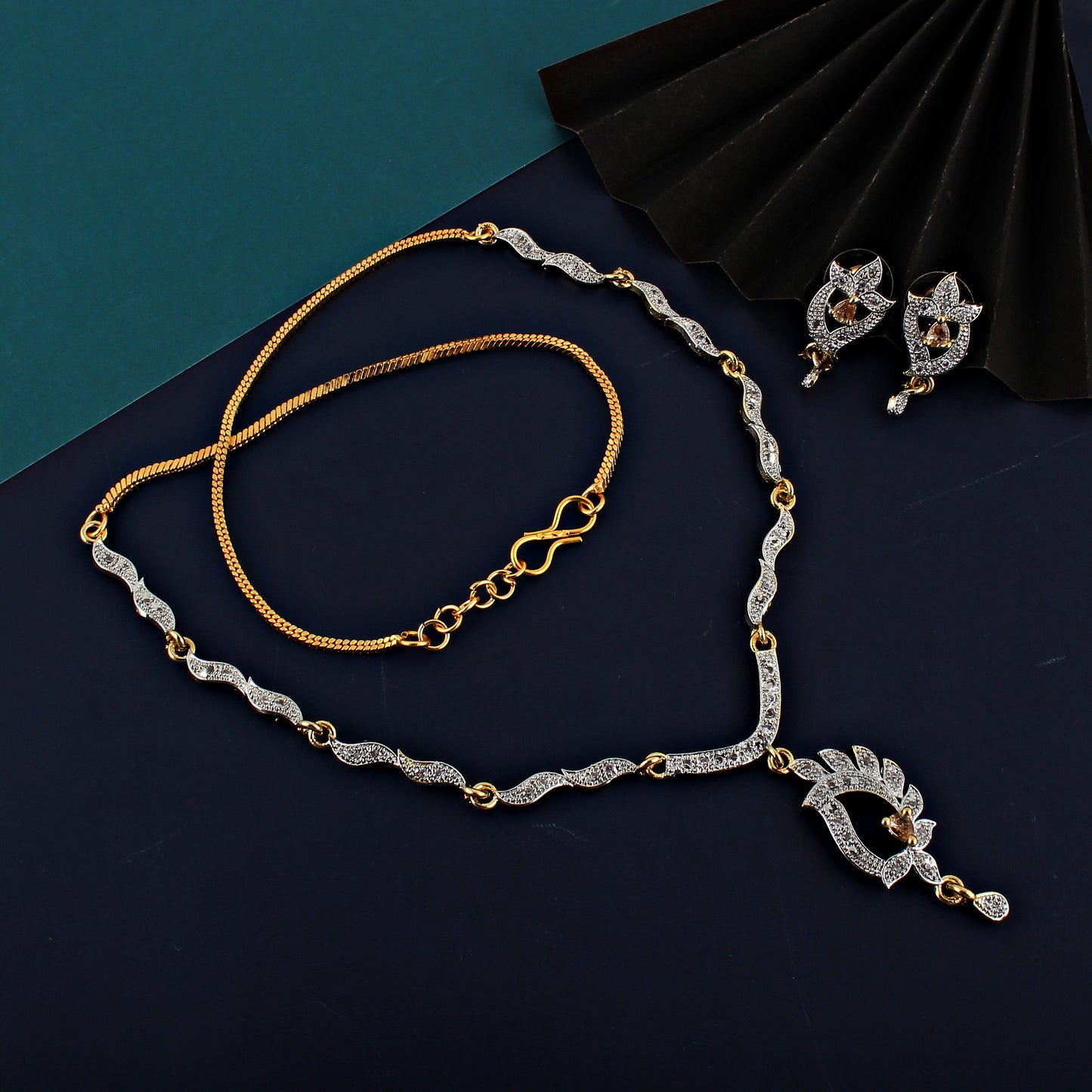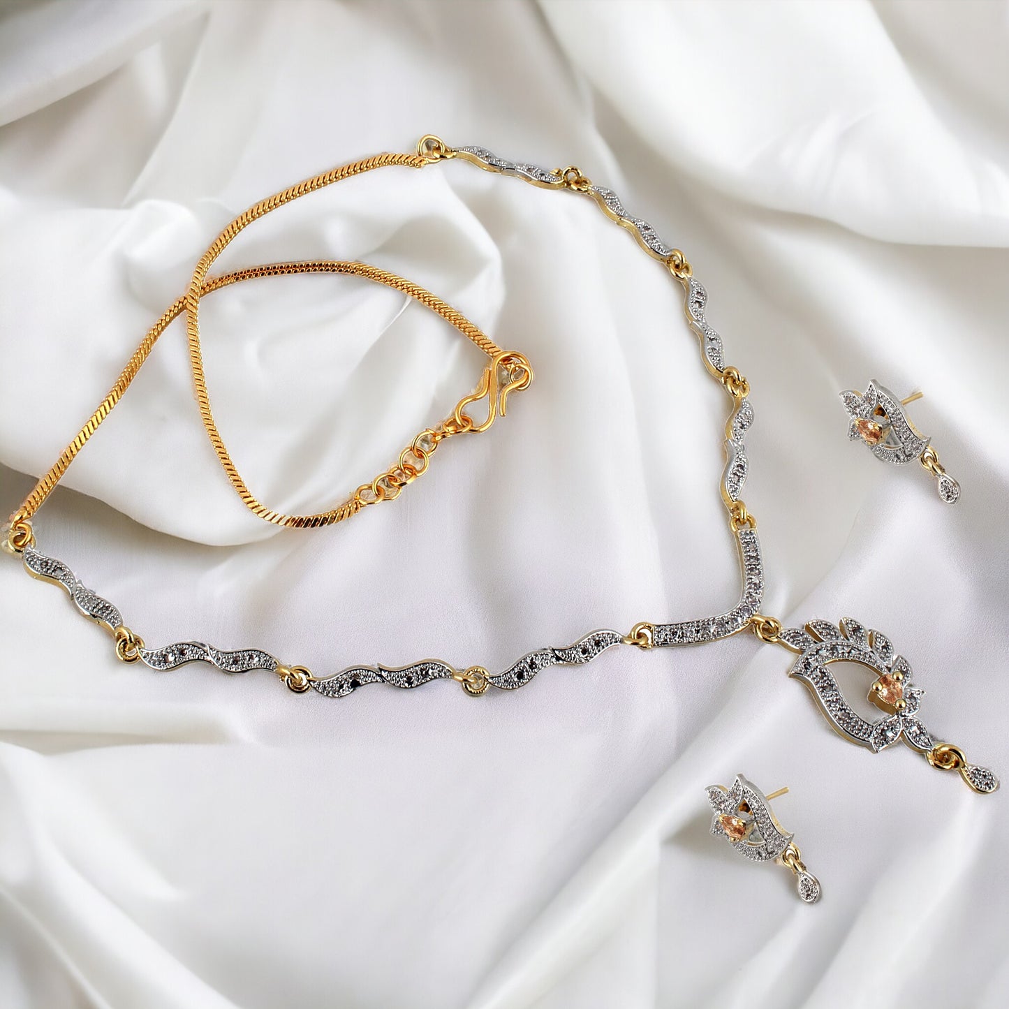 | 18K Gold Plated American Diamond (AD) Gold color Necklace set with Earring For Girls & Women |