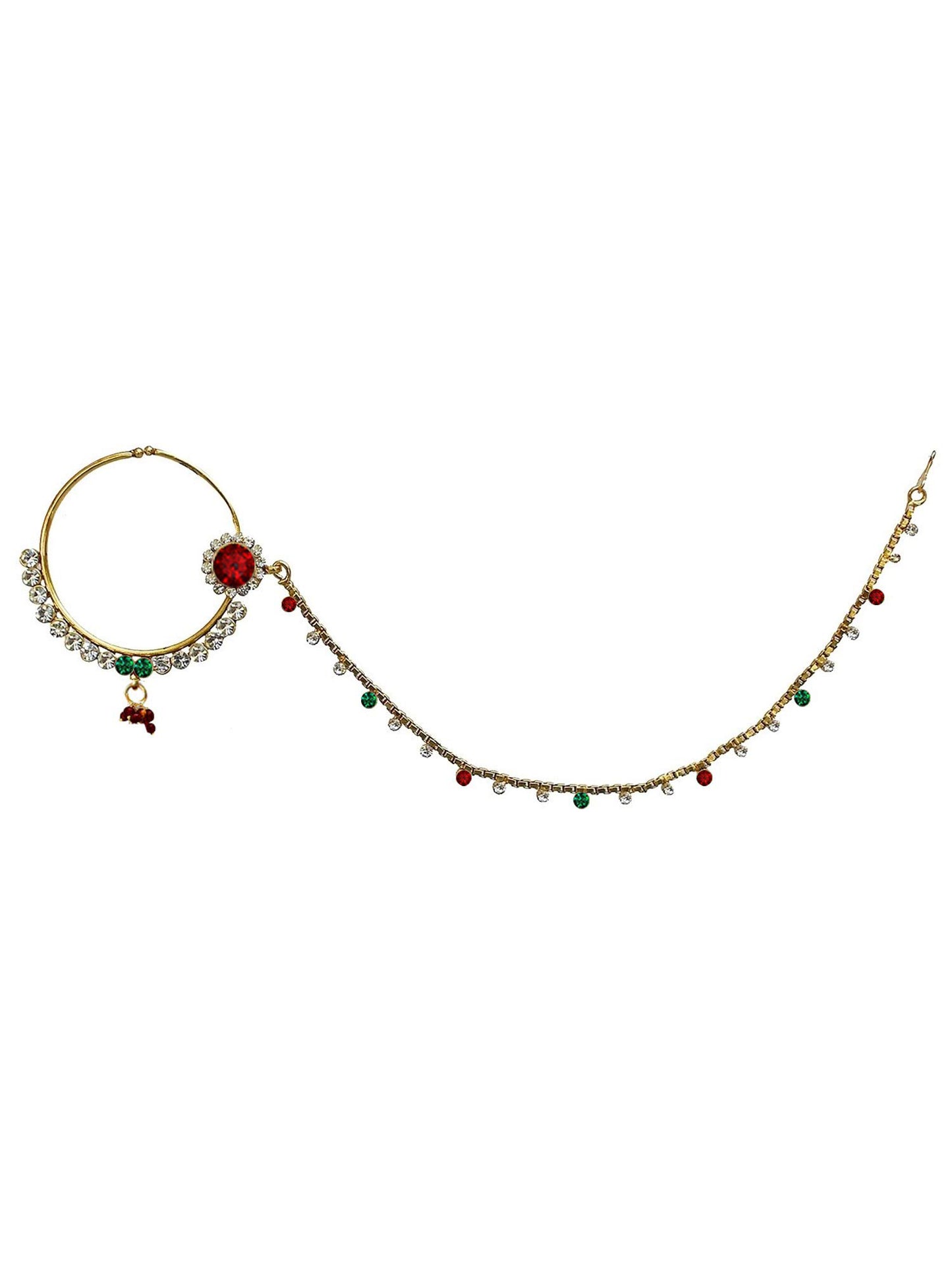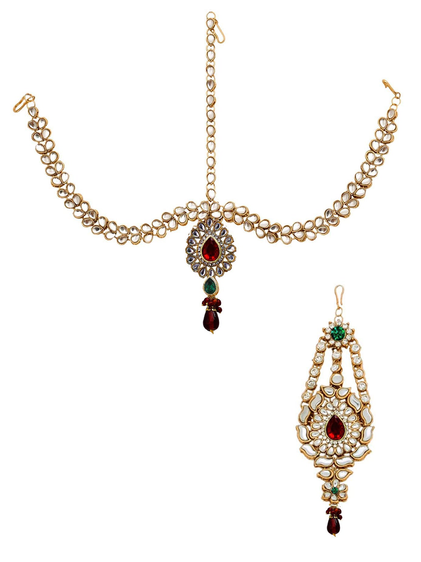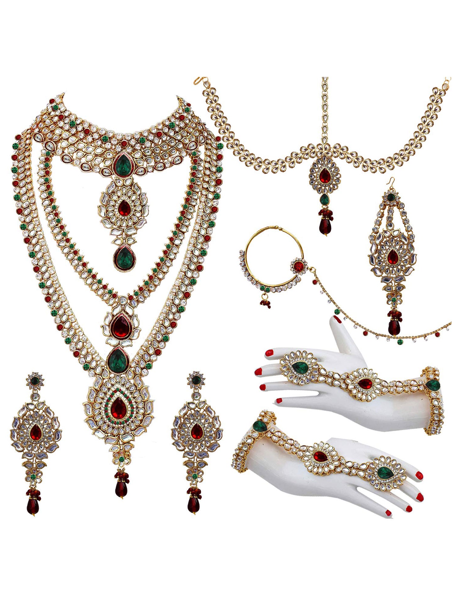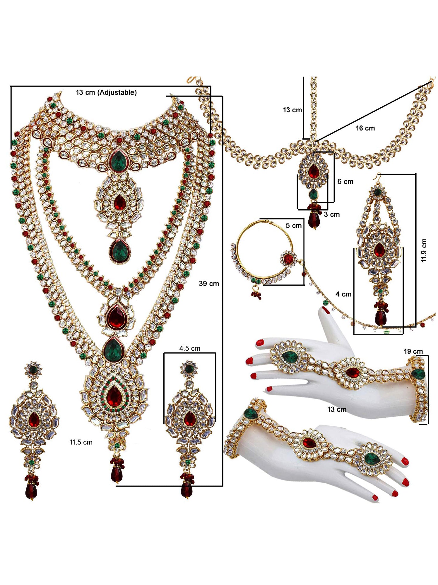 Live the complete charm of your wedding or traditional outfits with this complete bridal set studded with shiny Kundan; Maroon Green stones and designed exquisitely in drop design. A pair of matching earrings; one maatha patti; pair of hathphool;one chapka; one Bridal Nath one necklace completes the typical Indian bridal look!