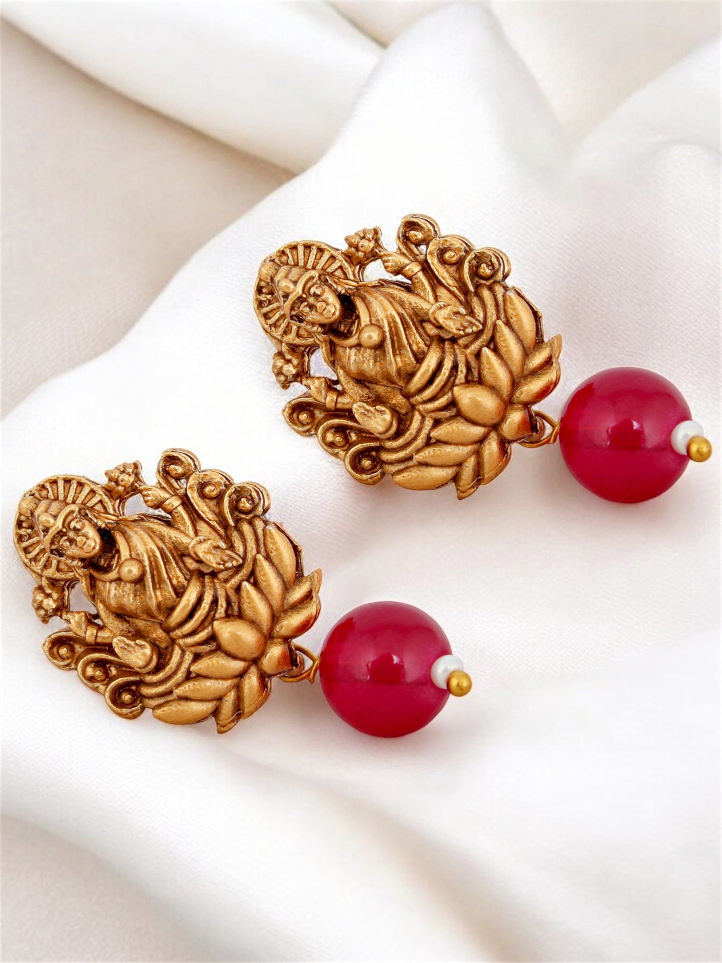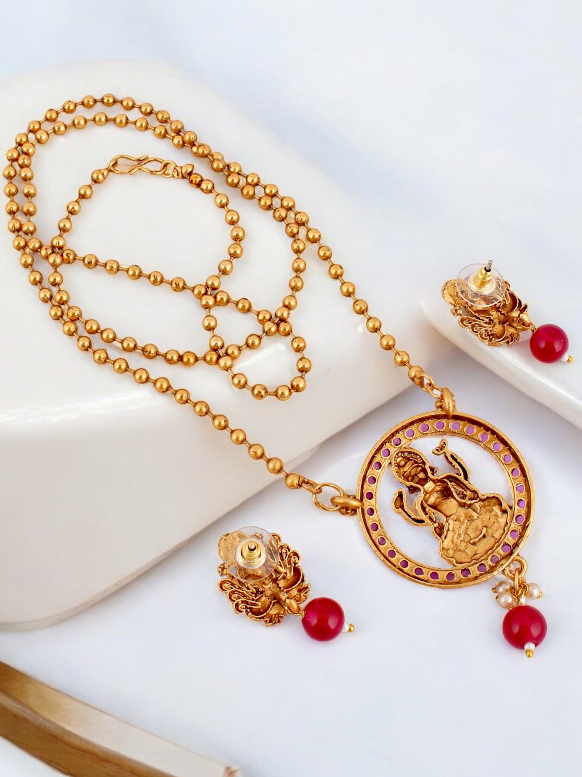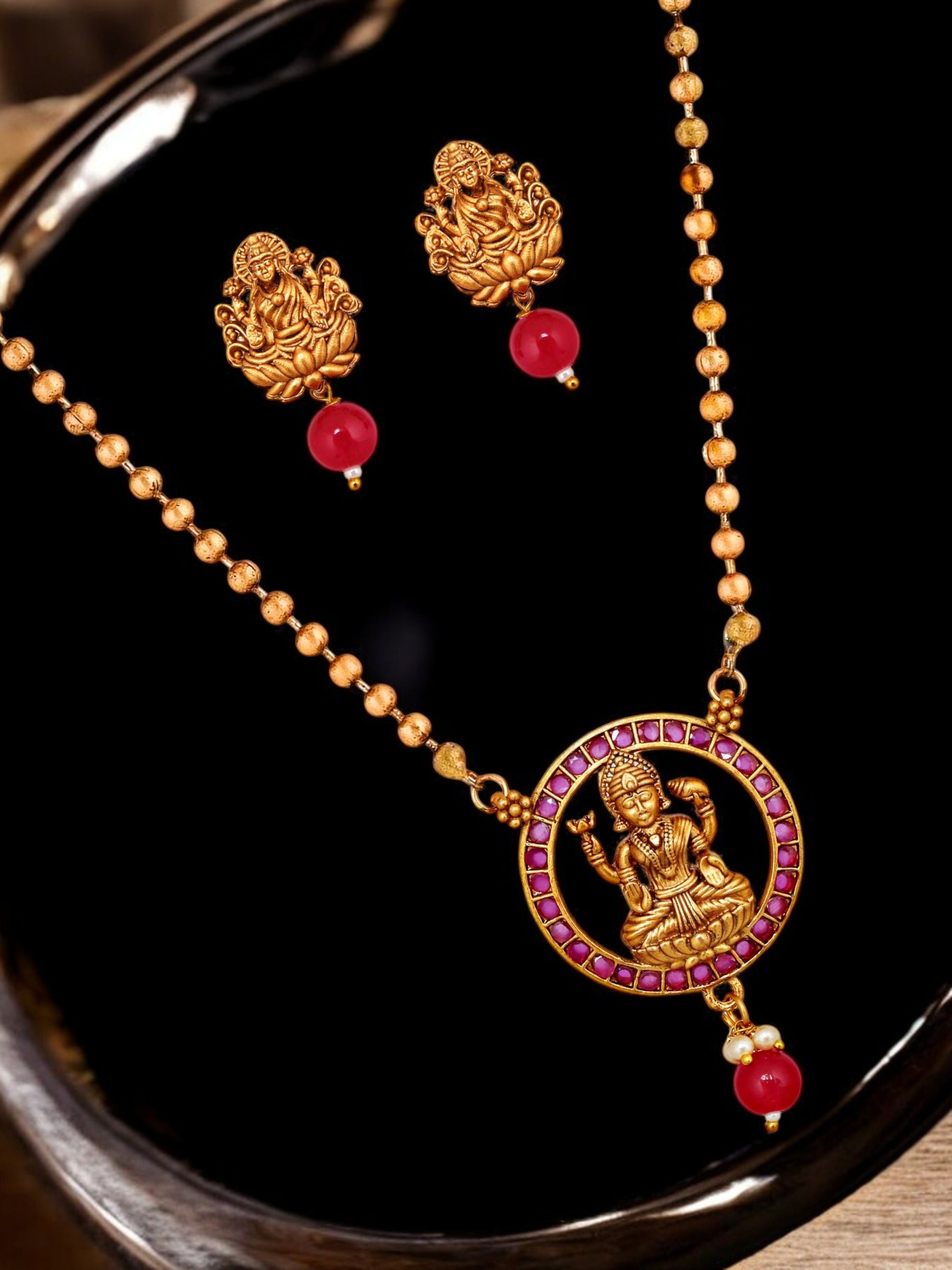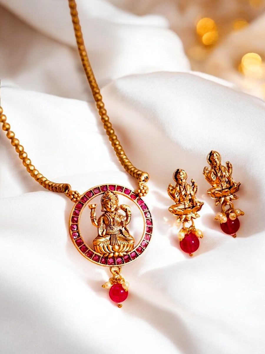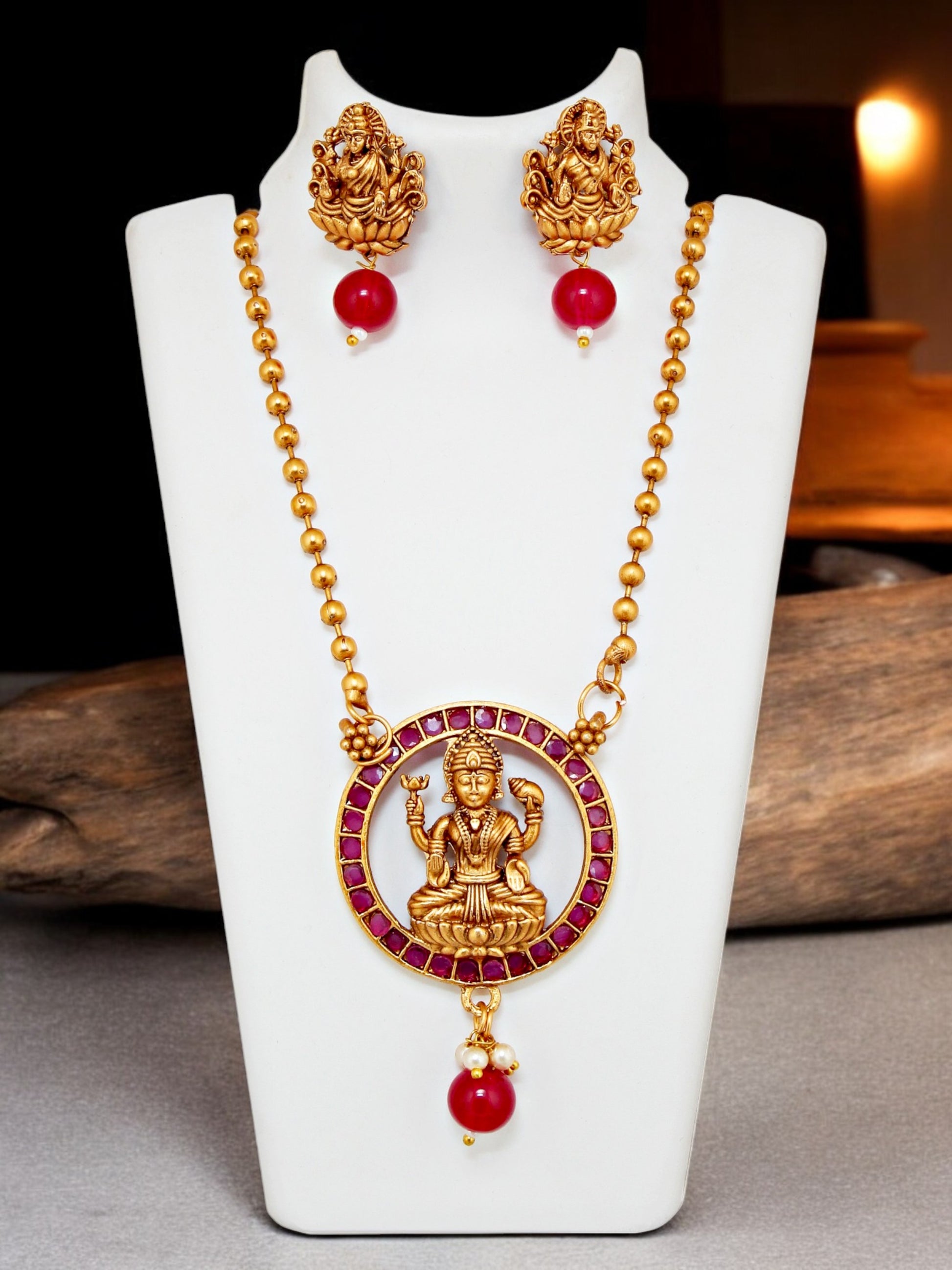 Trendy Gold Plated Goddess Laxmi Temple Jewelry Necklace with Earrings Pendant Earring Set