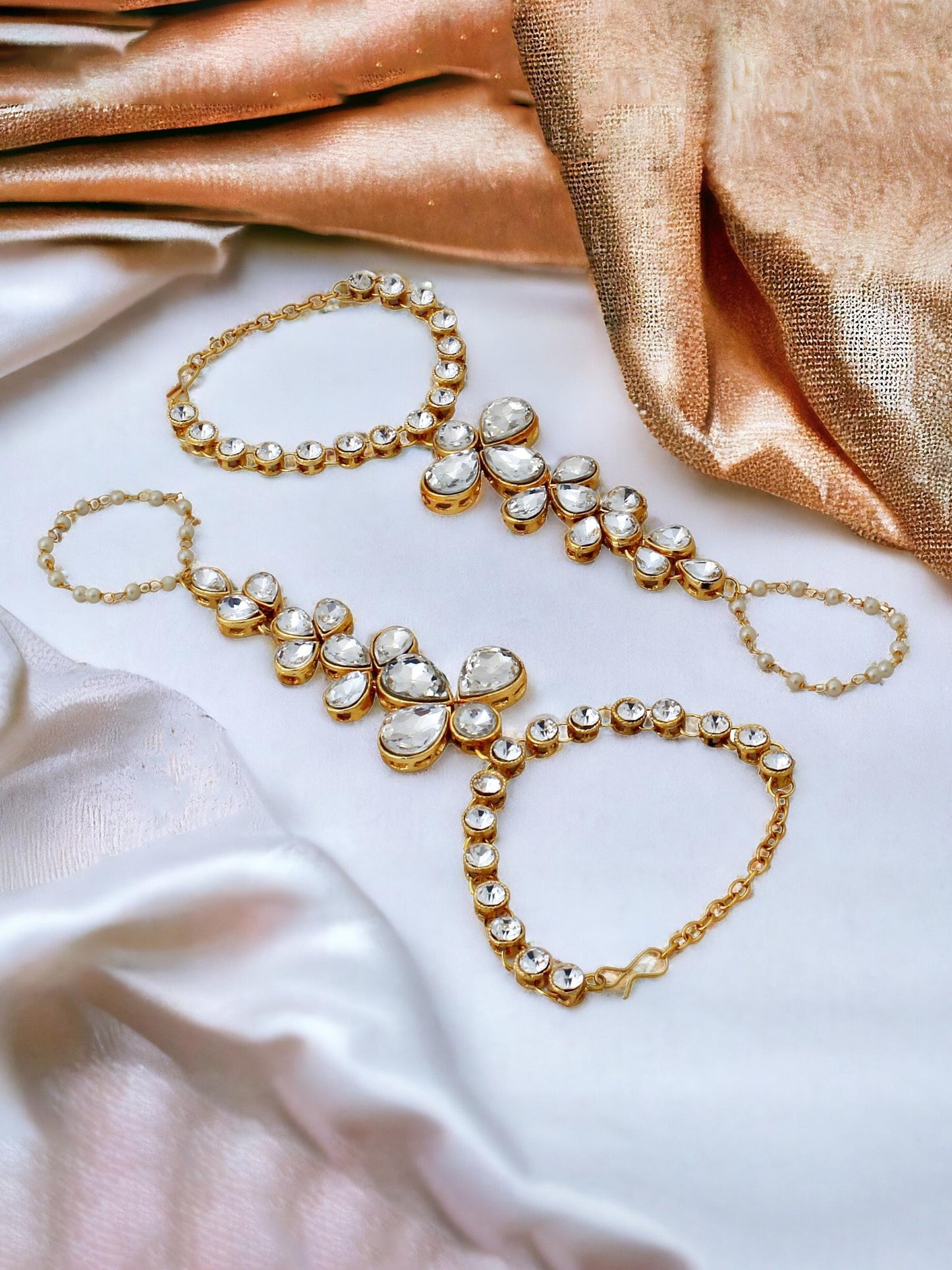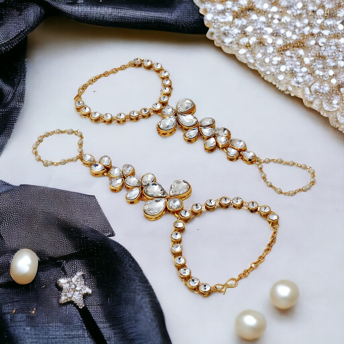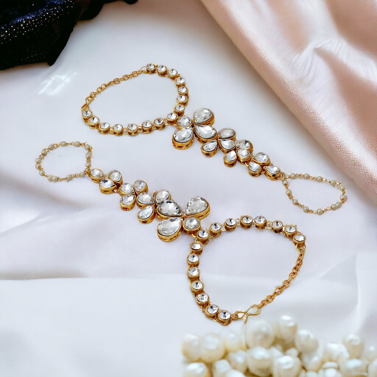 Lucky Jewellery Elegant White Color Gold Plated Finger Ring Bracelet Hand Harness Hathphool For Girls & Women This beautiful gold toned Bracelet is handcrafted stones. This gorgeous hathphool with your bridal or wedding outfit to add a spark to your traditional look. This adjustable bracelet wear is perfect for Girls & Women and it goes perfect with her ethnic wear/ Party Wear. This stone Bracelet gives your girl a princess look and best suited when she wear crown. This is perfect for Wedding, fancy dress competition, Birthday,Parties etc. This piece of jewelry comes with the Lucky Jewellery assurance of quality and durability.
