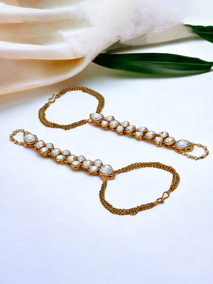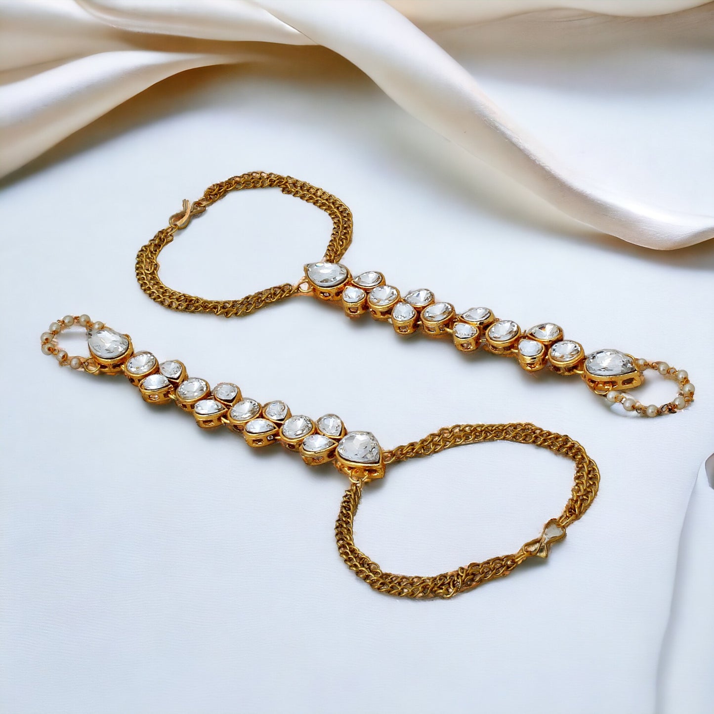 Lucky Jewellery Elegant White Color Gold Plated Finger Ring Bracelet Hand Harness Hathphool For Girls & Women This beautiful gold toned Bracelet is handcrafted stones. This gorgeous hathphool with your bridal or wedding outfit to add a spark to your traditional look. This adjustable bracelet wear is perfect for Girls & Women and it goes perfect with her ethnic wear/ Party Wear. This stone Bracelet gives your girl a princess look and best suited when she wear crown. This is perfect for Wedding, fancy dress competition, Birthday,Parties etc. This piece of jewelry comes with the Lucky Jewellery assurance of quality and durability.