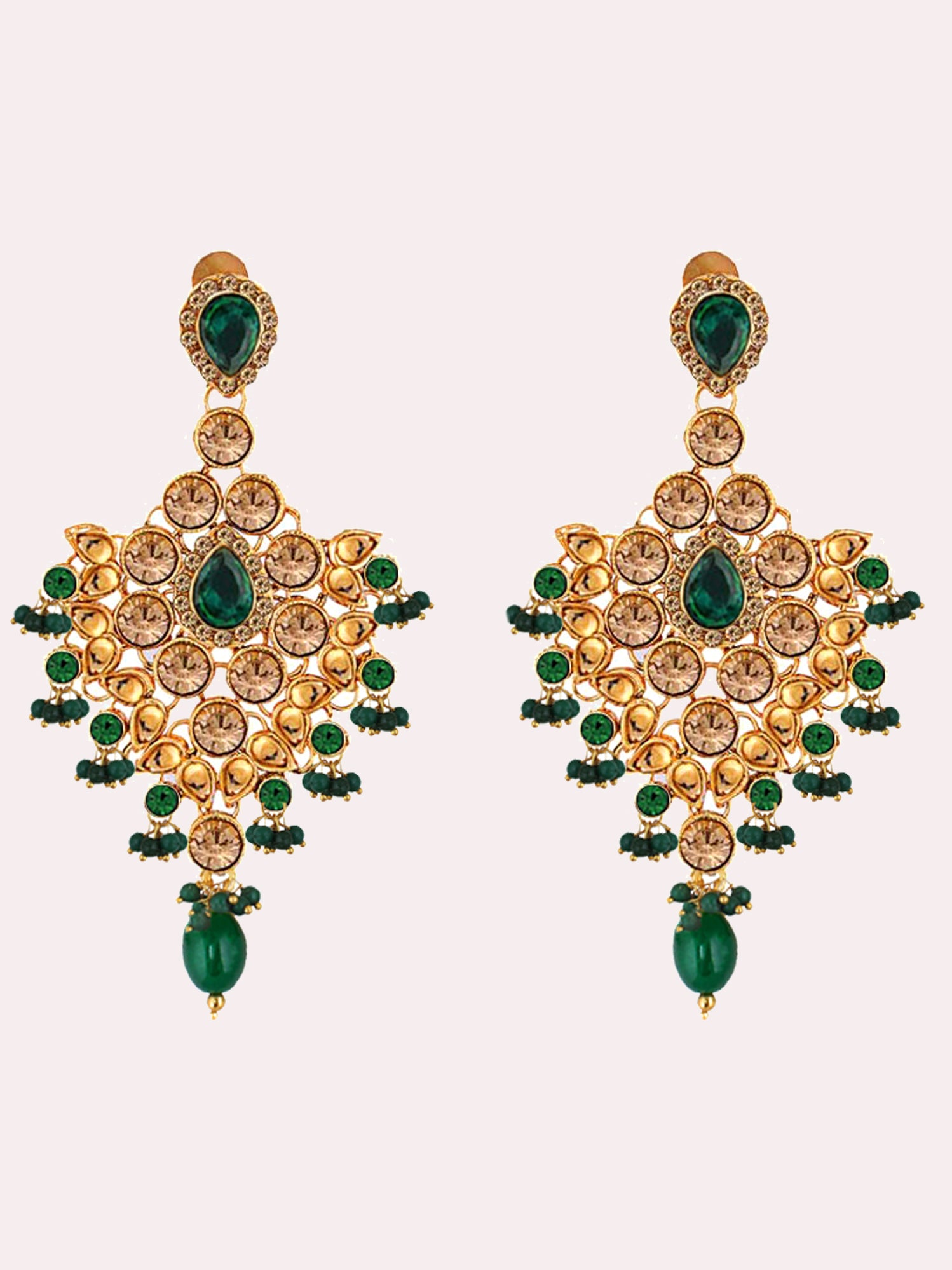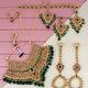 This stunning bridal set from Lucky Jewellery will certainly delight all the lovely Indian girls, who are ready to get married. This bridal set includes sheeshpatti, One necklace, One sheeshpatti, matching earrings, a pair of matching hathphool and one nath. Further, this set is studded with finest quality of coloured and white stones that render amazing look.