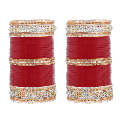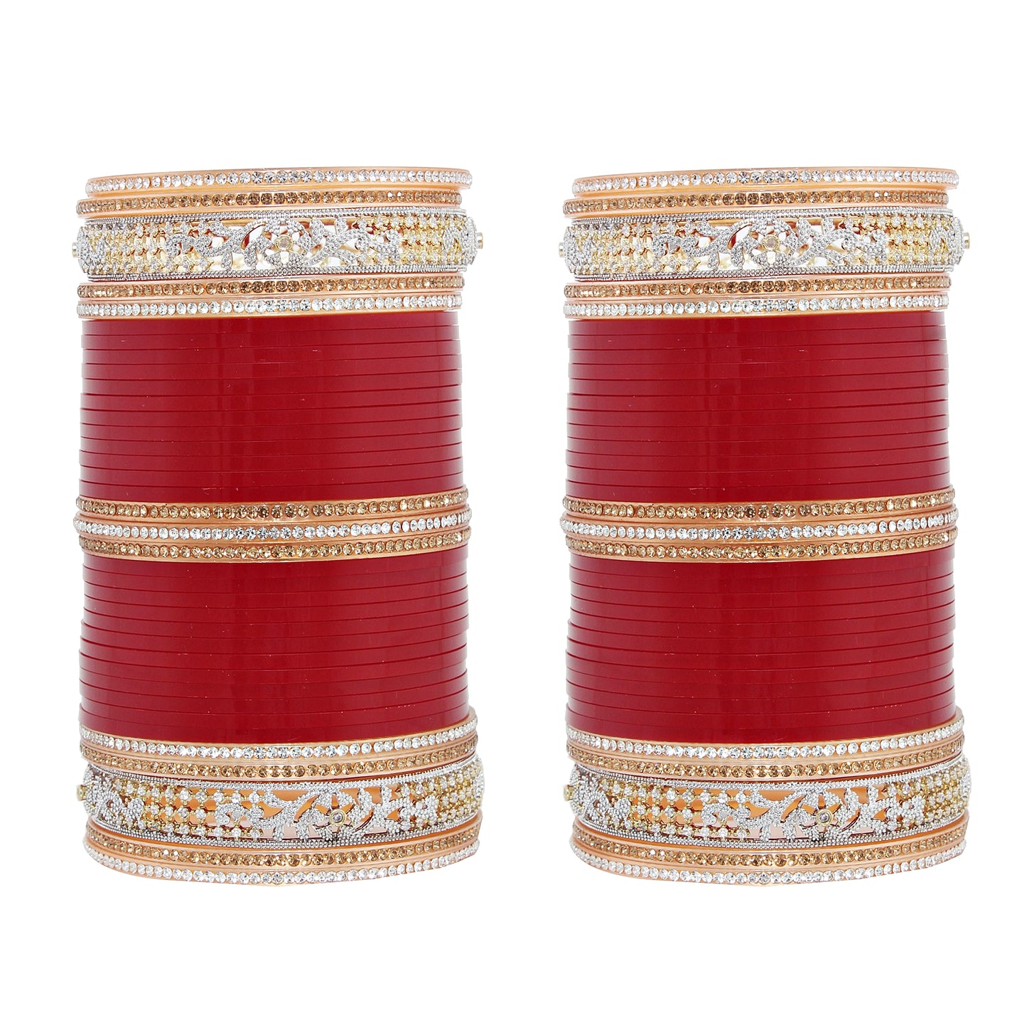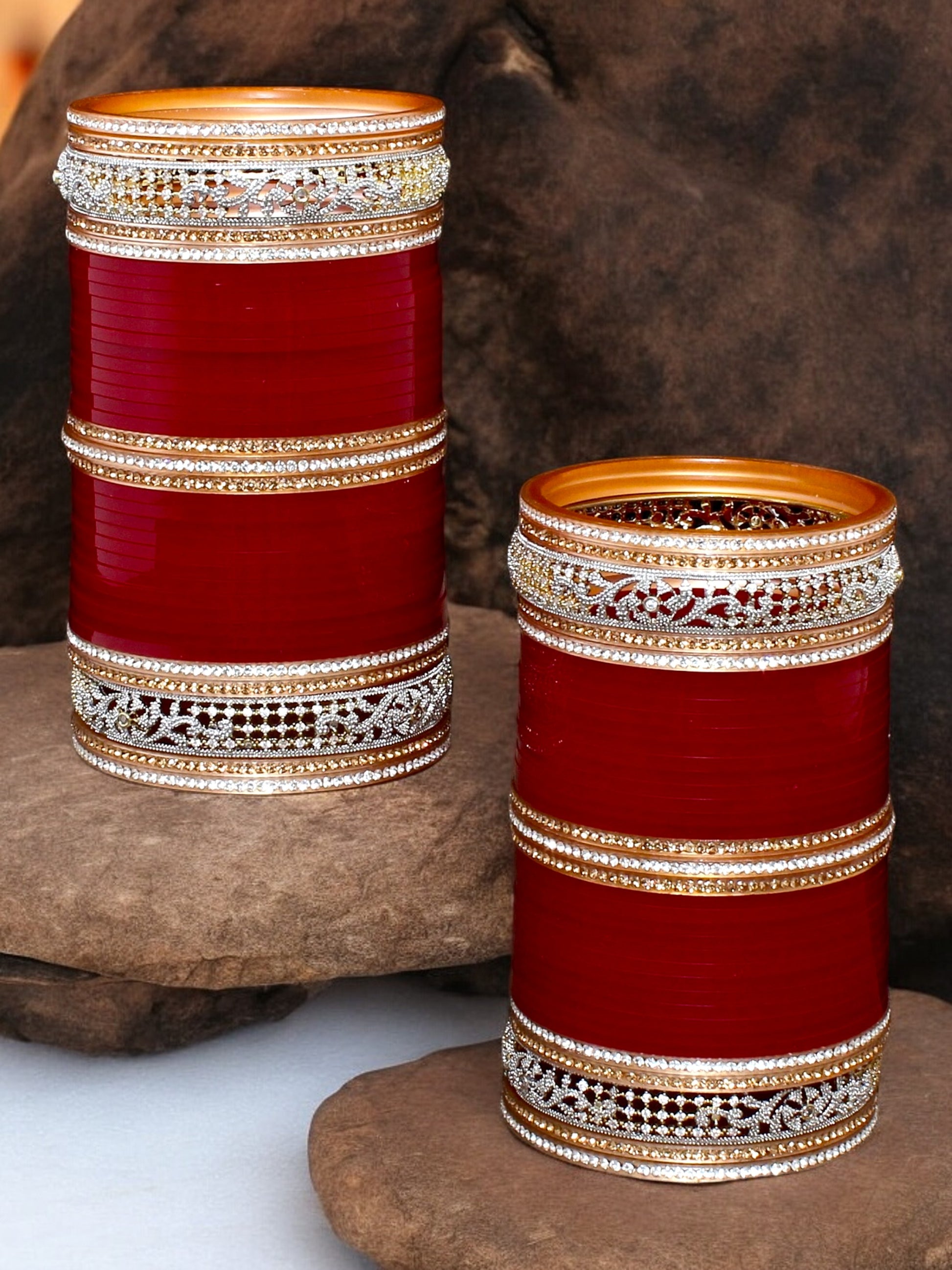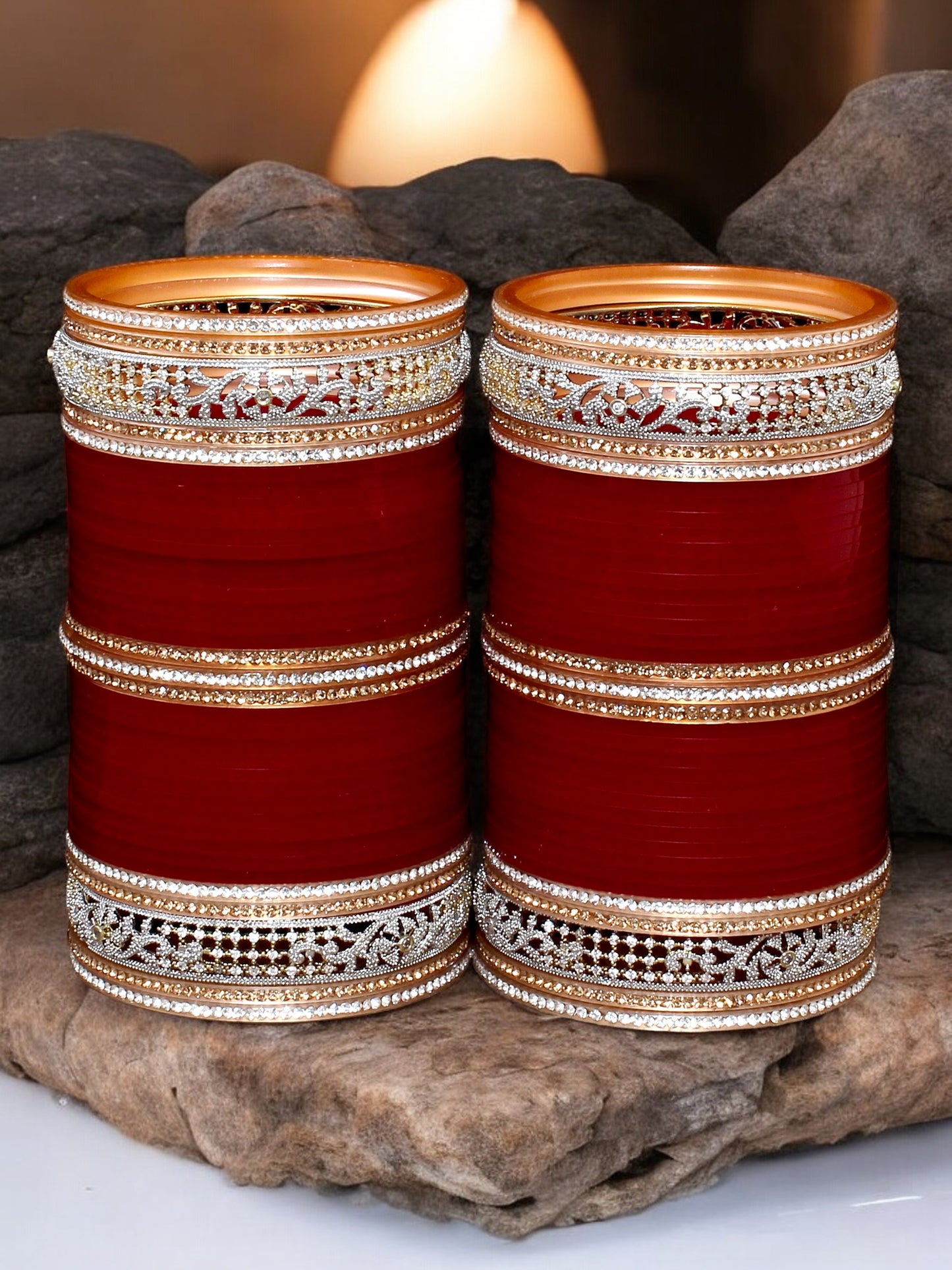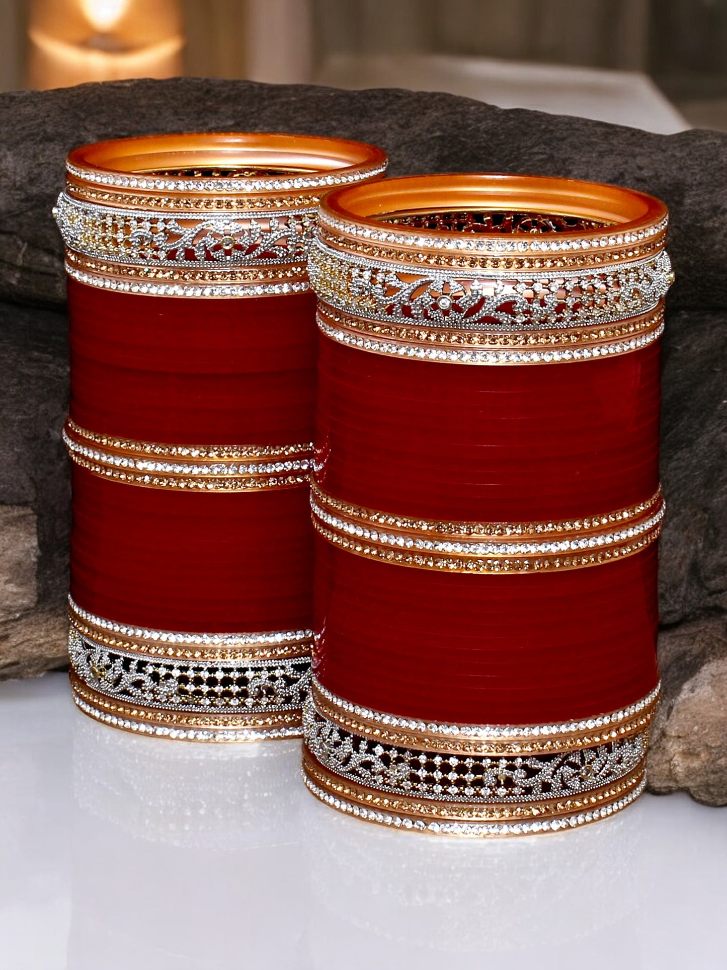 Lucky Jewellery Bridal Bangle Set Wedding punjabi chuda Designer chura AD & CZ Stone Maroon color Choora Celebrate your special day with the timeless elegance of our Bridal Punjabi Chura. This stunning set of traditional red bangles, adorned with intricate, symbolizes prosperity and marital bliss. Each bangle is crafted with meticulous attention to detail, blending classic artistry with modern flair to create a truly unique accessory. Perfectly capturing the essence of Punjabi heritage, this chura will not only enhance your bridal ensemble but also serve as a cherished keepsake of your beautiful journey. Make an admirable gift for your Mother, Sister, Wife and Girlfriend. | Ideal For Party, Office & Daily Wear | Can Be Used On Birthday, Marriage, Engagement, Shadi Any Occassion. |