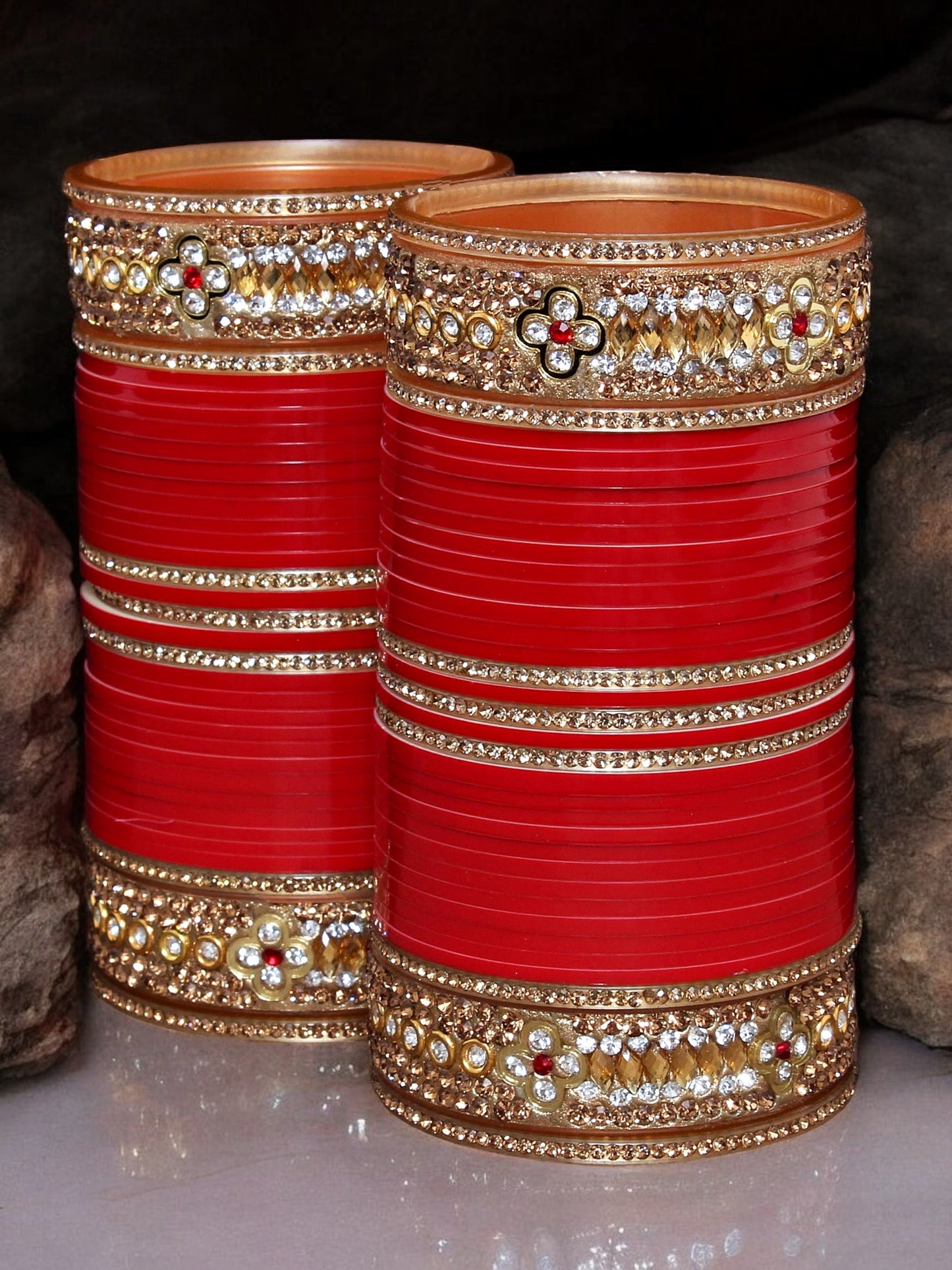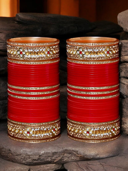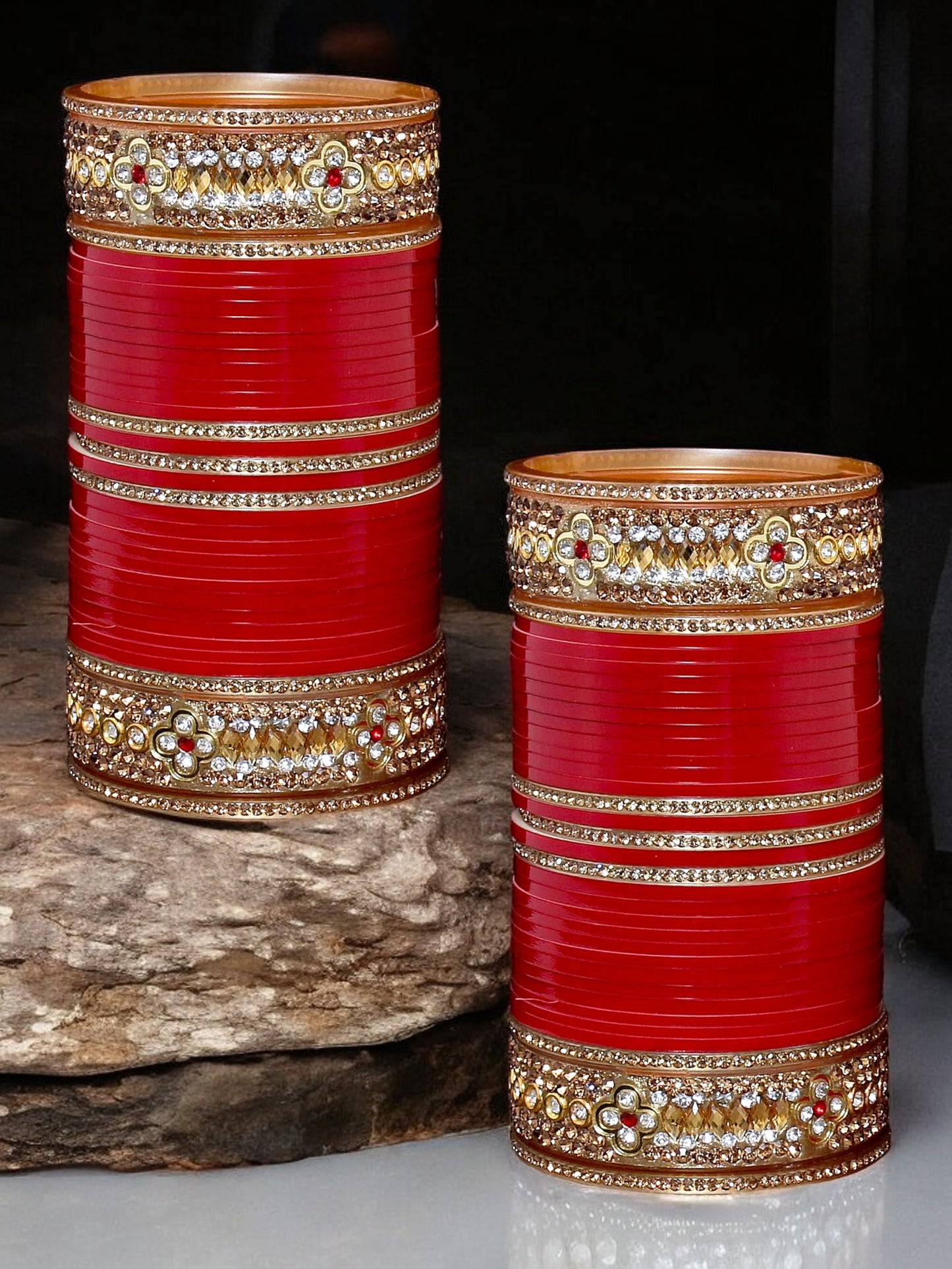 Lucky Jewellery Bridal Bangle set Wedding Punjabi chuda Designer chura CZ Stone Red Color choora Celebrate your special day with the timeless elegance of our Bridal Punjabi Chura. This stunning set of traditional red bangles, adorned with intricate, symbolizes prosperity and marital bliss. Each bangle is crafted with meticulous attention to detail, blending classic artistry with modern flair to create a truly unique accessory. Perfectly capturing the essence of Punjabi heritage, this chura will not only enhance your bridal ensemble but also serve as a cherished keepsake of your beautiful journey. Make an admirable gift for your Mother, Sister, Wife and Girlfriend. | Ideal For Party, Office & Daily Wear | Can Be Used On Birthday, Marriage, Engagement, Shadi Any Occassion. |