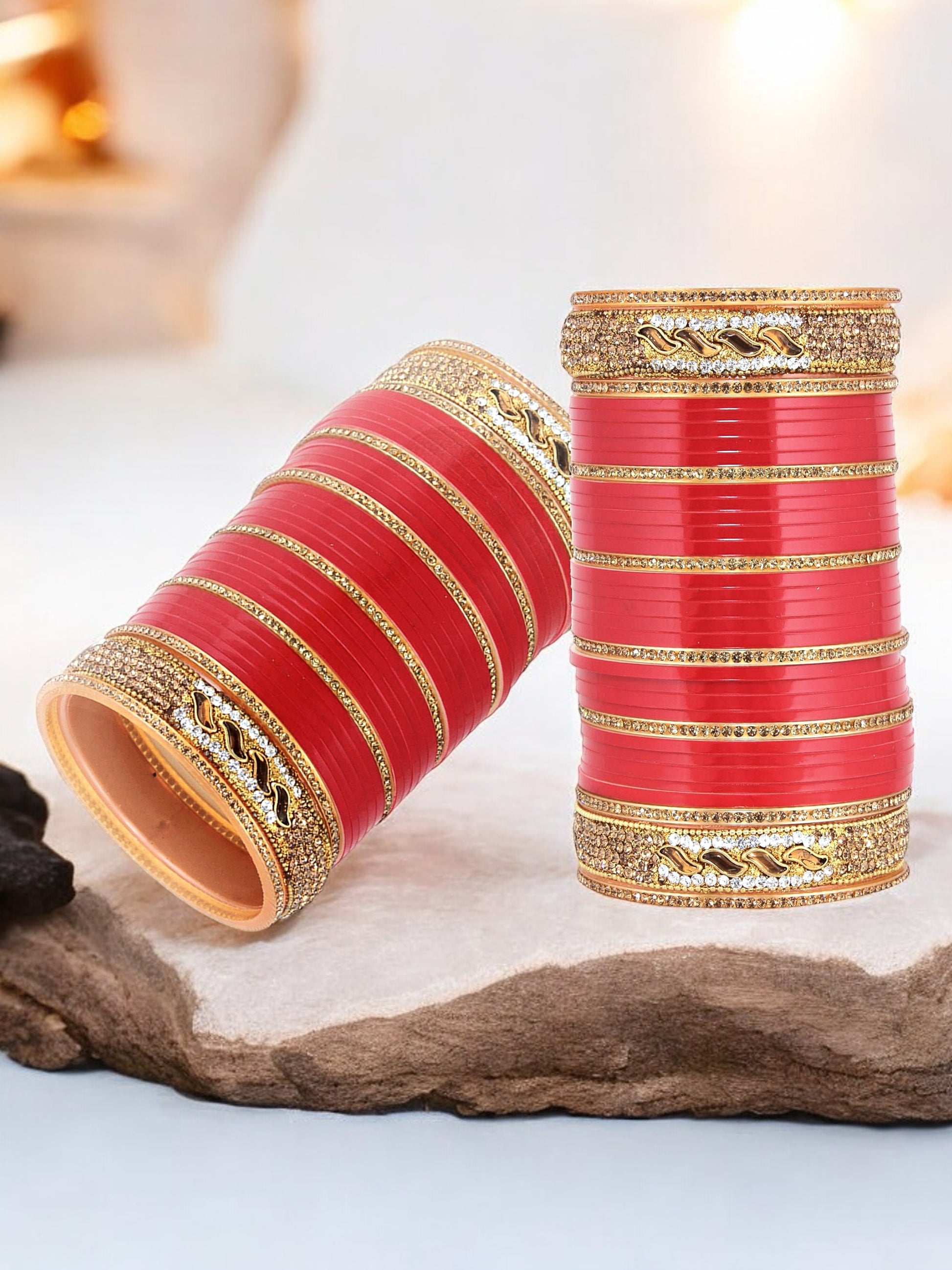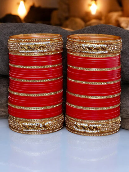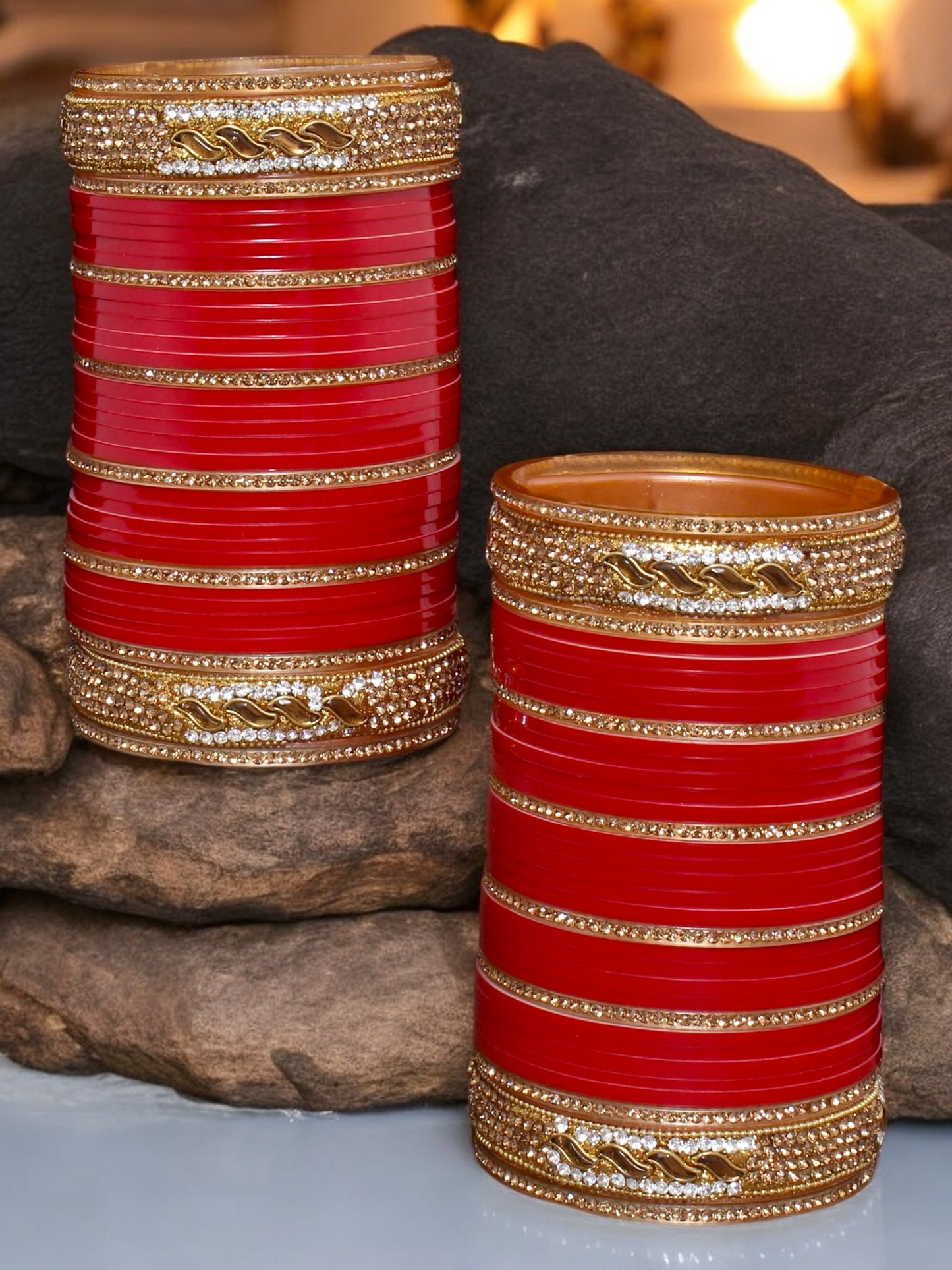 Lucky Jewellery Bridal Bangle Set Wedding punjabi chuda Designer chura CZ Stone with Kundan Stone Red Color choora (594-G1C1-D962-R-24) Celebrate your special day with the timeless elegance of our Bridal Punjabi Chura. This stunning set of traditional red bangles, adorned with intricate, symbolizes prosperity and marital bliss. Each bangle is crafted with meticulous attention to detail, blending classic artistry with modern flair to create a truly unique accessory. Perfectly capturing the essence of Punjabi heritage, this chura will not only enhance your bridal ensemble but also serve as a cherished keepsake of your beautiful journey. Make an admirable gift for your Mother, Sister, Wife and Girlfriend. | Ideal For Party, Office & Daily Wear | Can Be Used On Birthday, Marriage, Engagement, Shadi Any Occassion. |