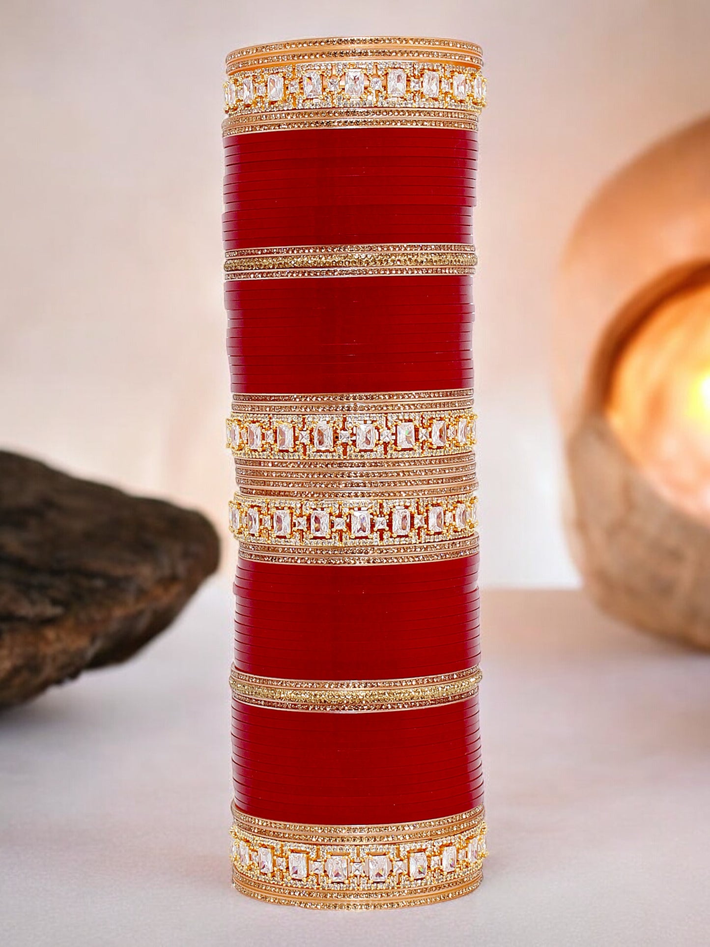 Lucky Jewellery Bridal Bangle set Wedding punjabi chuda Solitair Designer chura CZ Stone Maroon color Choora Celebrate your special day with the timeless elegance of our Bridal Punjabi Chura. This stunning set of traditional red bangles, adorned with intricate, symbolizes prosperity and marital bliss. Each bangle is crafted with meticulous attention to detail, blending classic artistry with modern flair to create a truly unique accessory. Perfectly capturing the essence of Punjabi heritage, this chura will not only enhance your bridal ensemble but also serve as a cherished keepsake of your beautiful journey. Make an admirable gift for your Mother, Sister, Wife and Girlfriend. | Ideal For Party, Office & Daily Wear | Can Be Used On Birthday, Marriage, Engagement, Shadi Any Occassion. |
