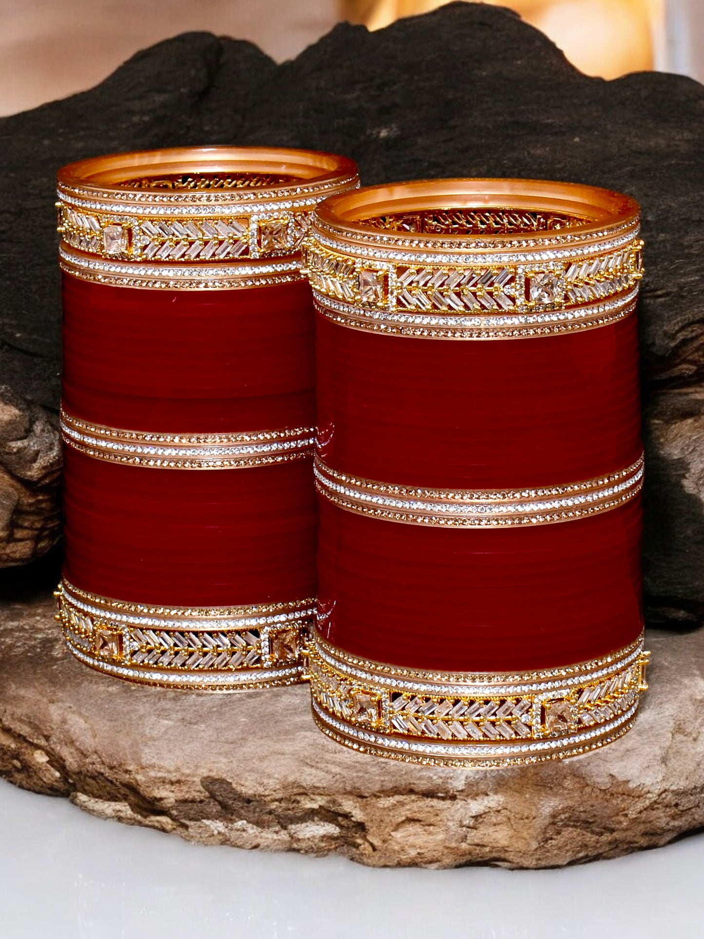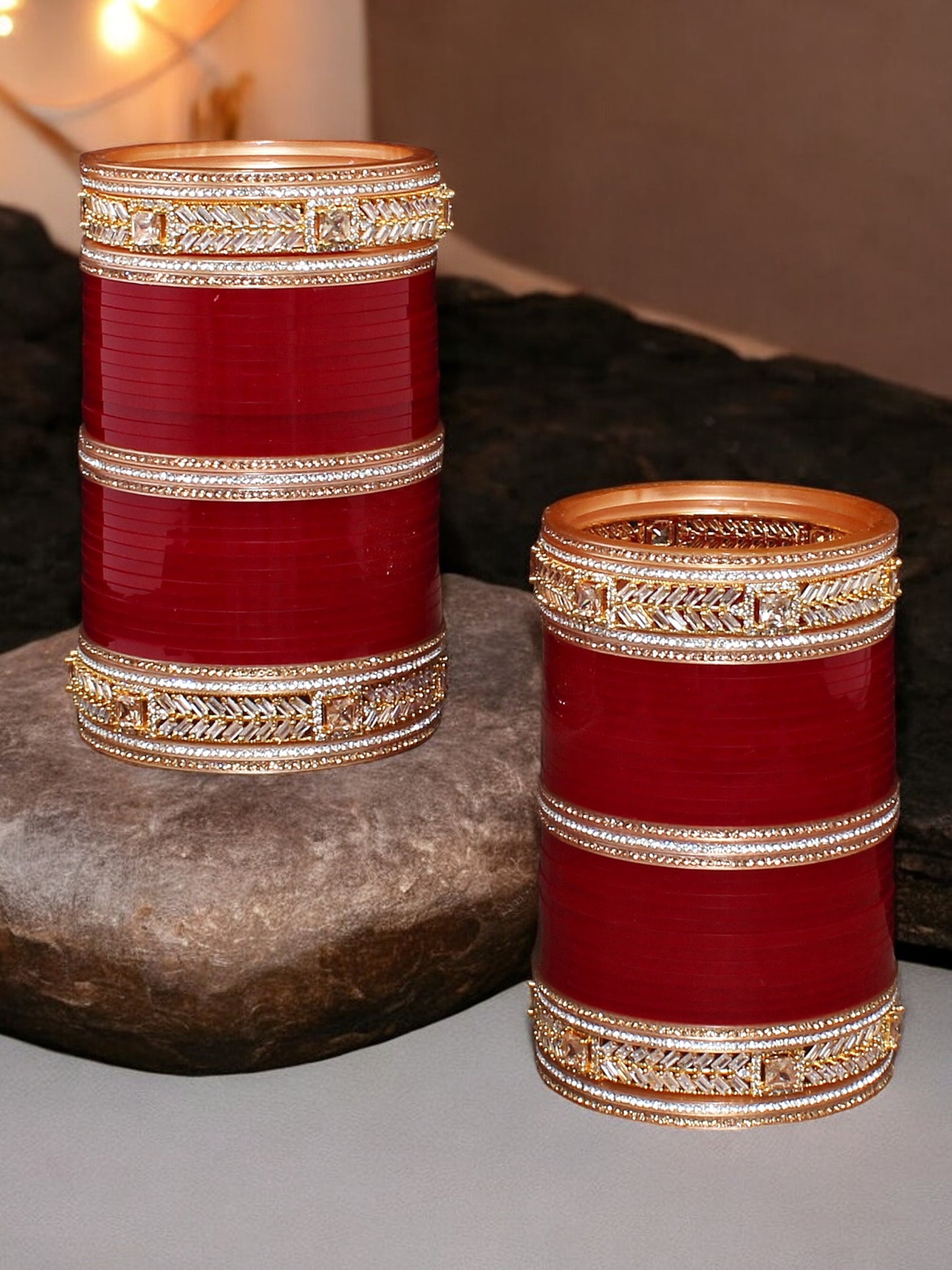 Lucky Jewellery Bridal Bangle set Wedding punjabi chuda Designer chura CZ Stone Maroon color Choora Celebrate your special day with the timeless elegance of our Bridal Punjabi Chura. This stunning set of traditional red bangles, adorned with intricate, symbolizes prosperity and marital bliss. Each bangle is crafted with meticulous attention to detail, blending classic artistry with modern flair to create a truly unique accessory. Perfectly capturing the essence of Punjabi heritage, this chura will not only enhance your bridal ensemble but also serve as a cherished keepsake of your beautiful journey. Make an admirable gift for your Mother, Sister, Wife and Girlfriend. | Ideal For Party, Office & Daily Wear | Can Be Used On Birthday, Marriage, Engagement, Shadi Any Occassion. |