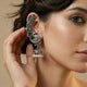 This oxidised silver peacock ear cuff jhumka earring is a stunning blend of traditional artistry and modern statement style. Featuring an intricately carved peacock motif with elegant swirling details, the design gracefully follows the curve of the ear and finishes with a classic jhumka drop adorned with beads.The ear cuff style adds a bold, contemporary edge while maintaining ethnic charm, making it perfect for weddings, festive occasions, and Indo-western outfits. Lightweight yet eye-catching, this earring is crafted to stand out with elegance and comfort.