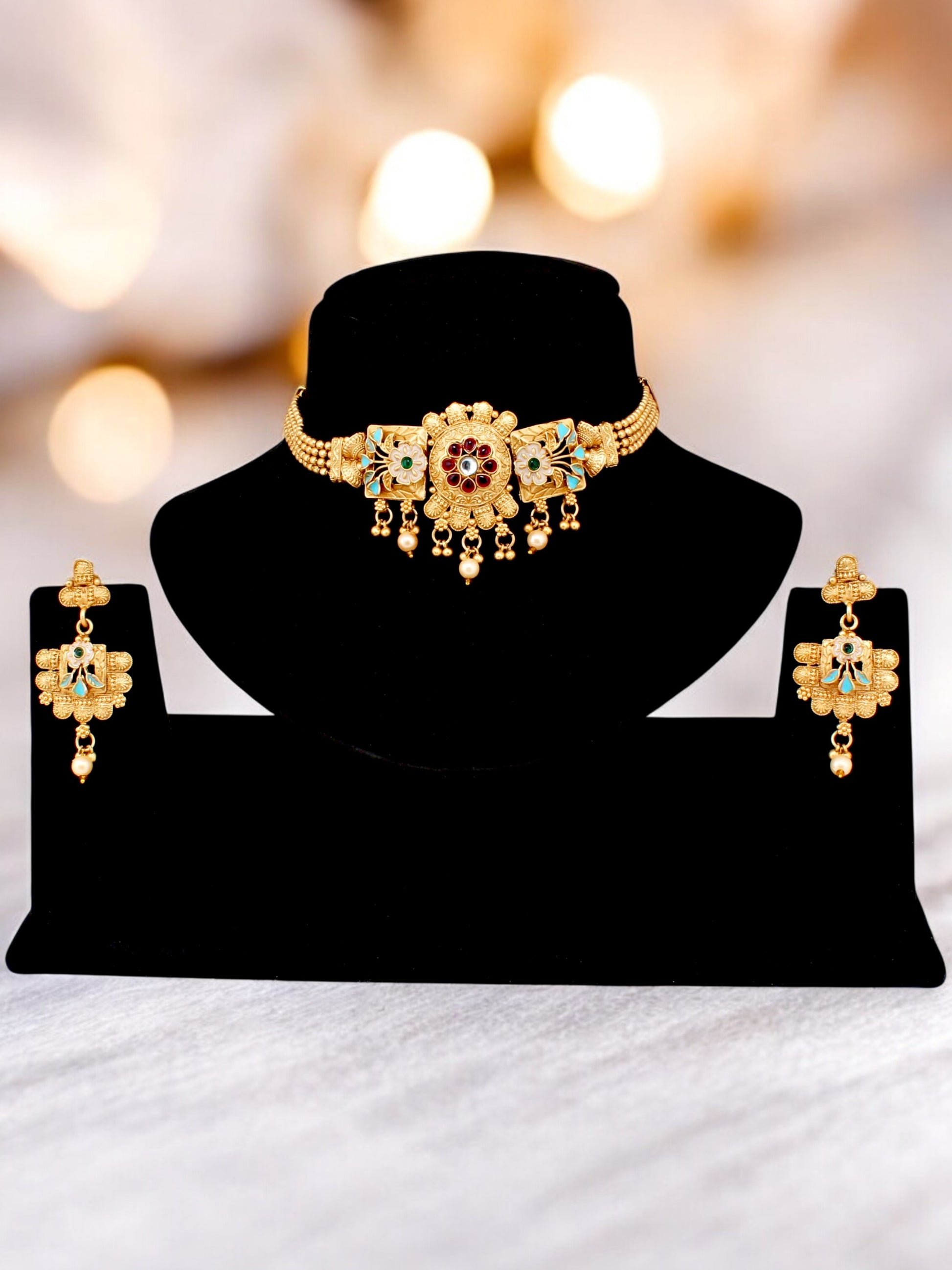 Add a touch of royalty to your look with this exquisite Gold-Plated Guluband Choker Necklace Set for women and girls. Inspired by traditional Indian craftsmanship, this beautifully designed choker features intricate detailing, making it a perfect accessory for weddings, festivals, and special occasions.