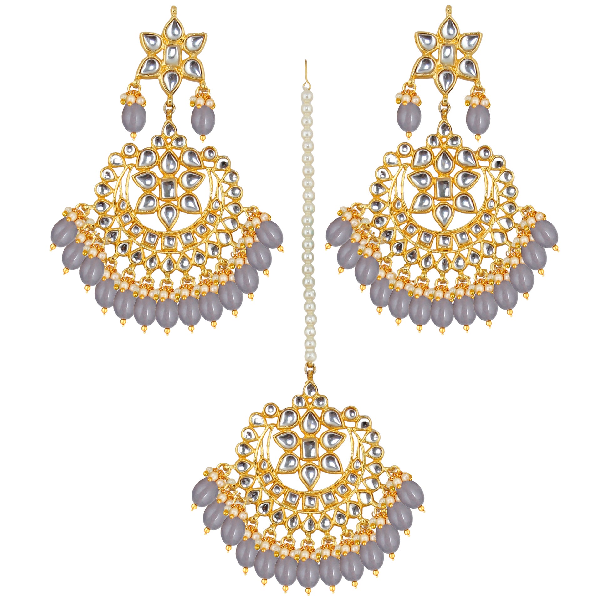 LUCKY JEWELLERY Designer Gold Plating Grey Color Pearl with Kundan Choker Bridal Necklace Set For Girls & Women Elevate your style with our gorgeous Kundan and Pearl Long Necklace Set, including earrings and a forehead ornament (Mang Tikka), perfect for the modern woman who loves a touch of tradition. This set is all about blending classic and contemporary styles. The necklace sits beautifully on your neck, decorated with shiny pearls and Kundan stones. It's a real eye-catcher! And don't forget the matching earrings that frame your face elegantly. They're just as stunning as the necklace, with pearls and Kundan stones that shimmer and shine. To top it all off, the Mang Tikka adds a special touch to your look. It's like the cherry on top, completing your ensemble with its own pearls and Kundan stones. Whether you're going to a wedding, a party, or just want to feel extra special, our Kundan and Pearl Long Necklace Set with Earrings and Mang Tikka will make you stand out in style!