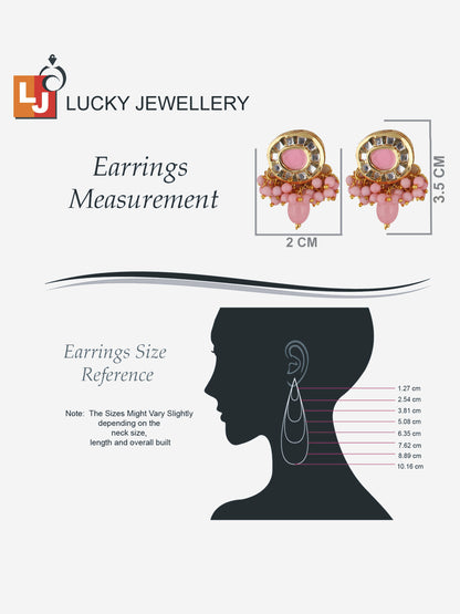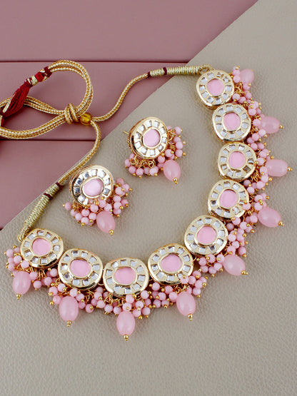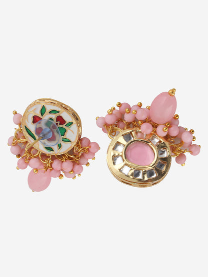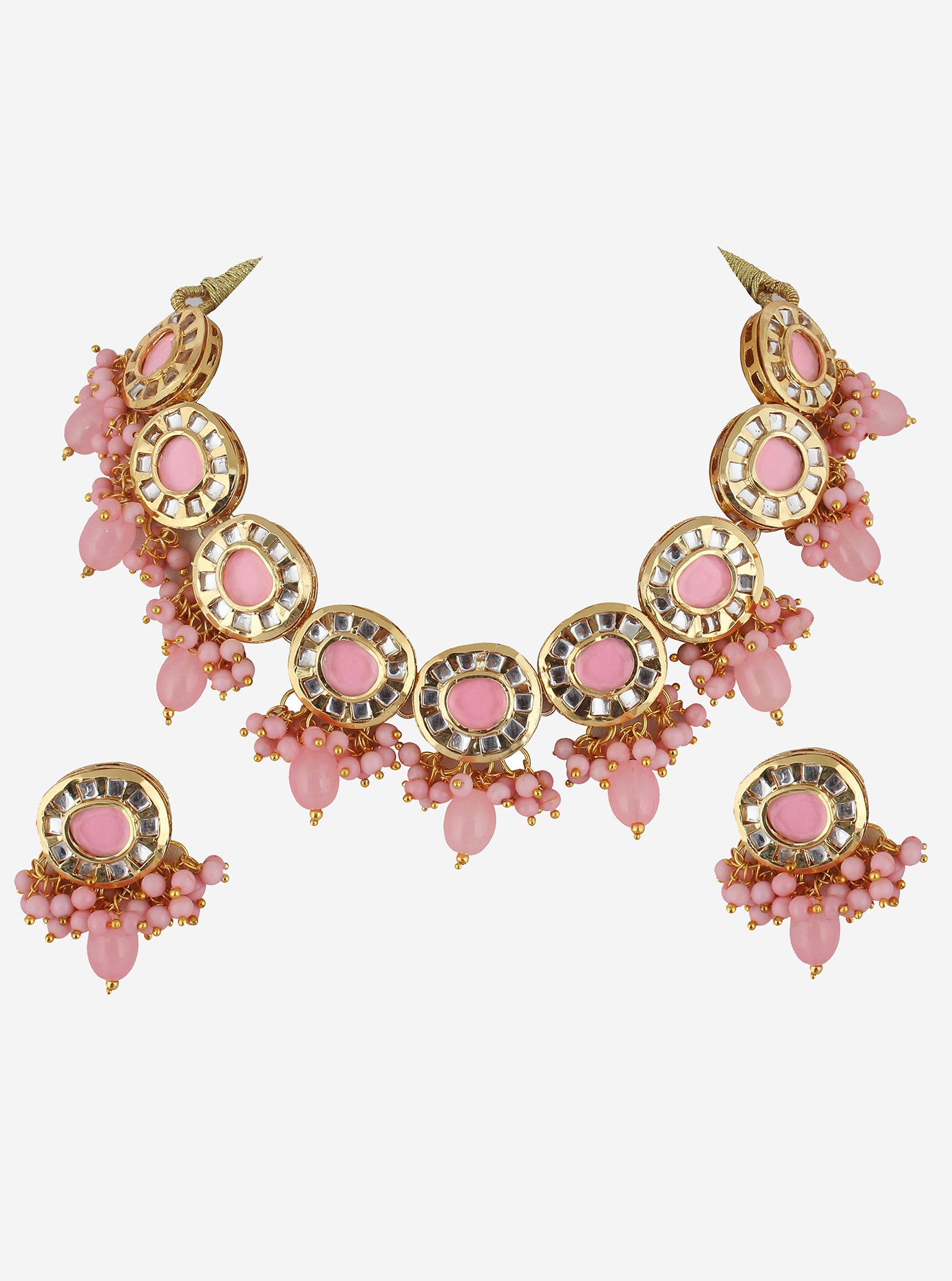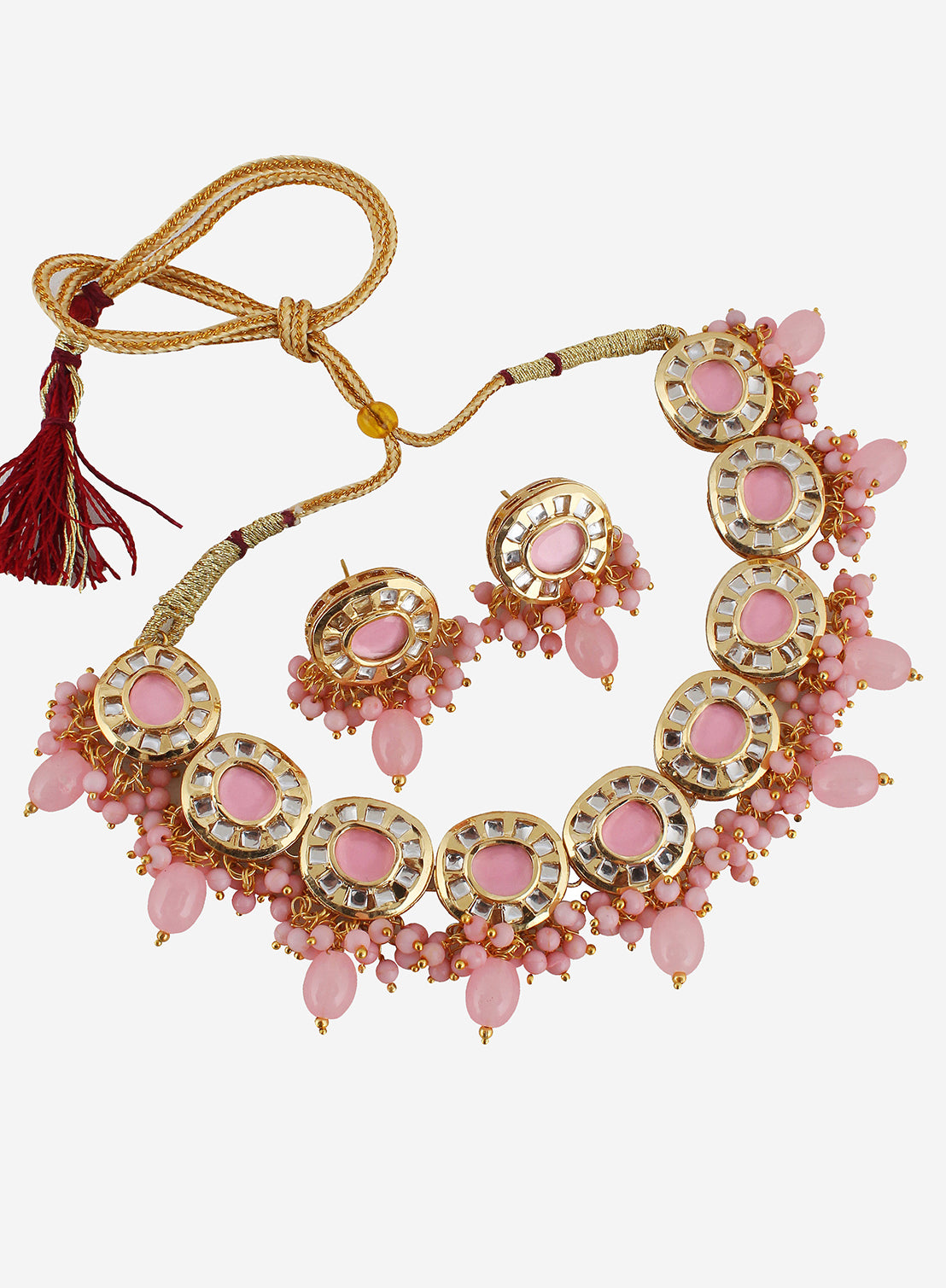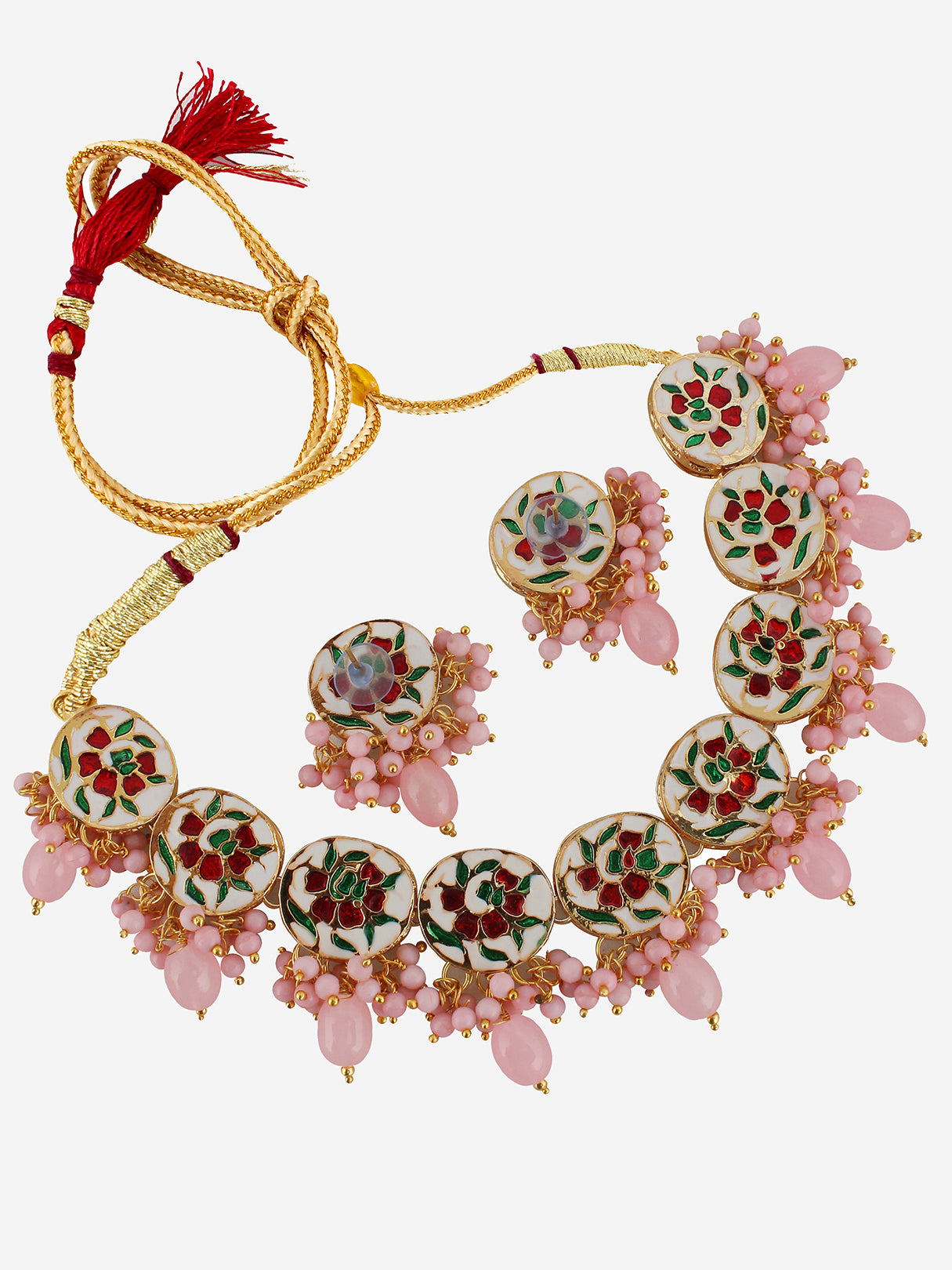 | Lucky Jewellery Meenakari 18k Gold Plated Pink Color Earring Combo Uncut Big Faux Kundan Choker Necklace set |