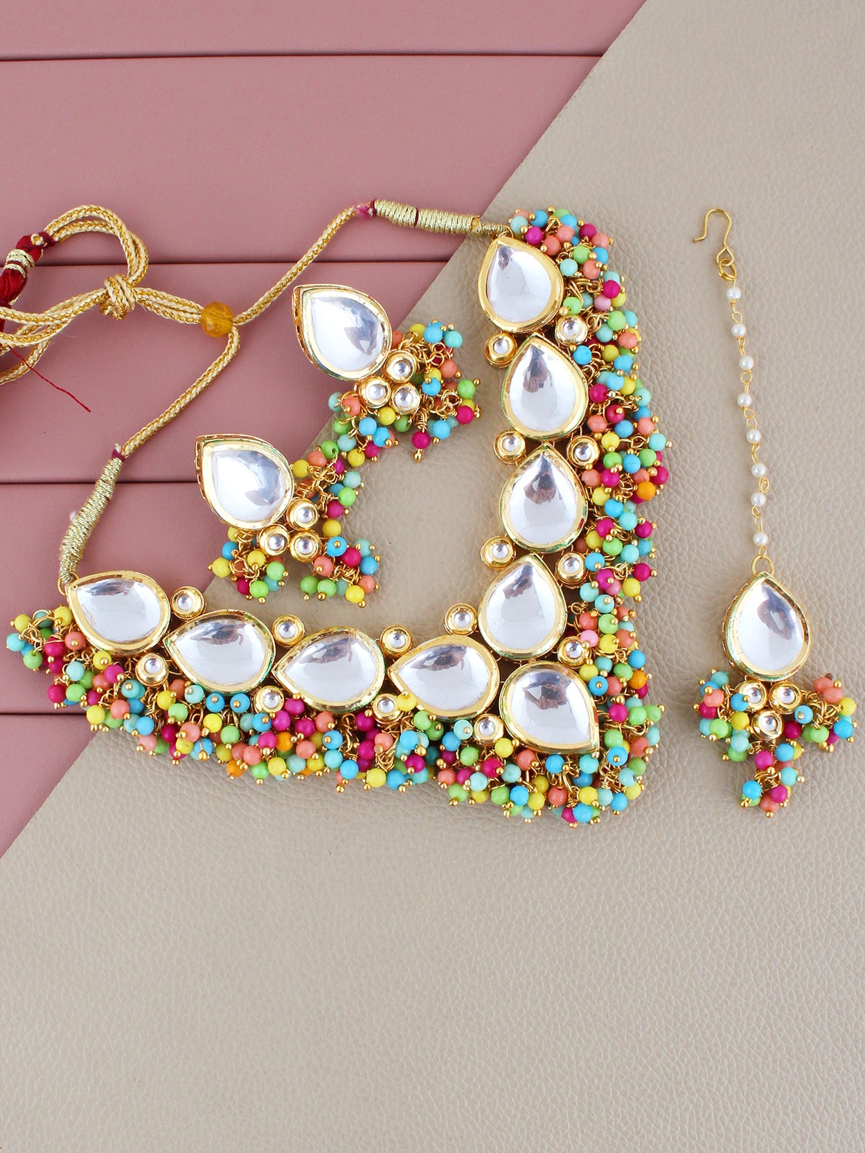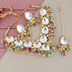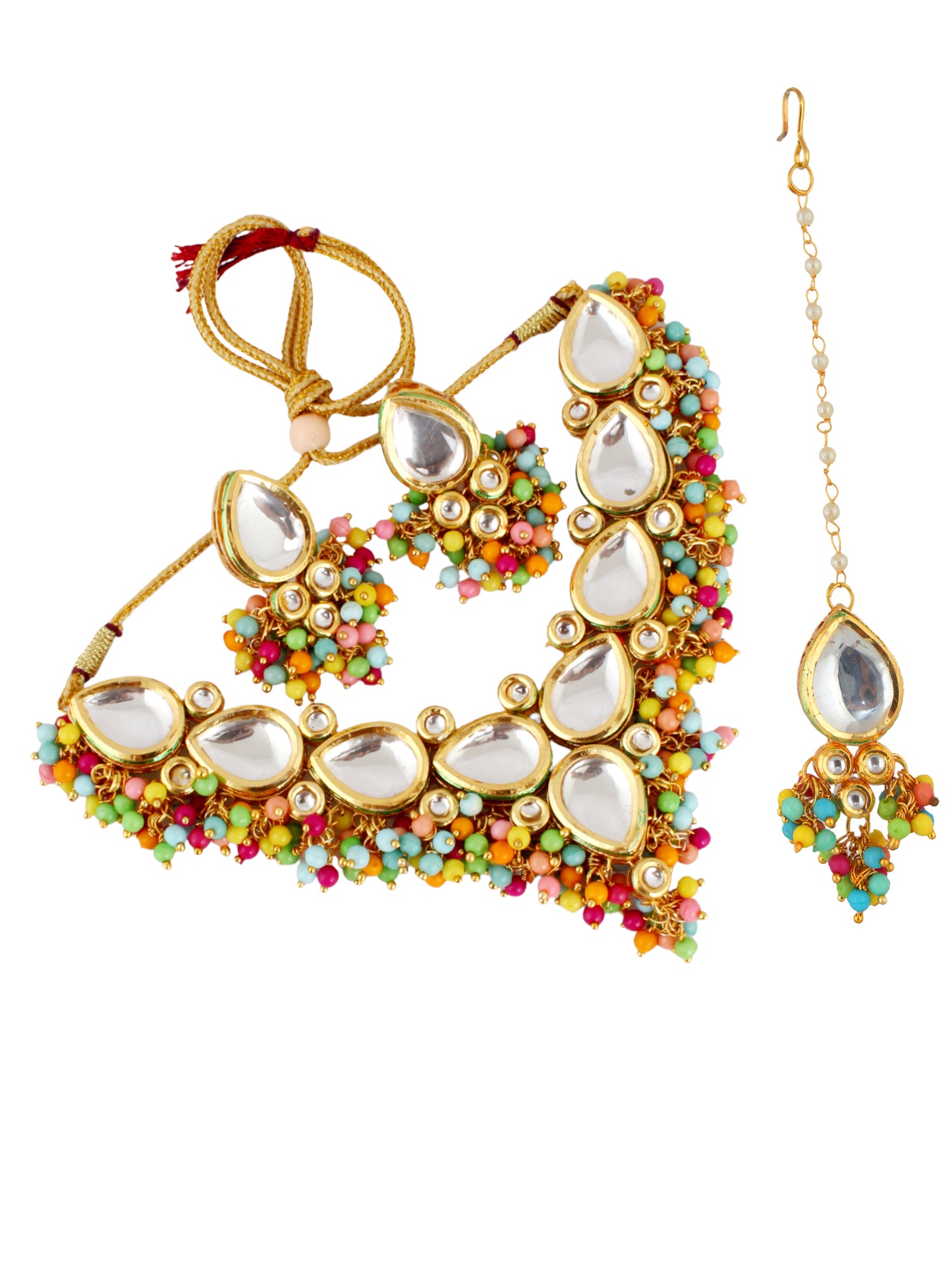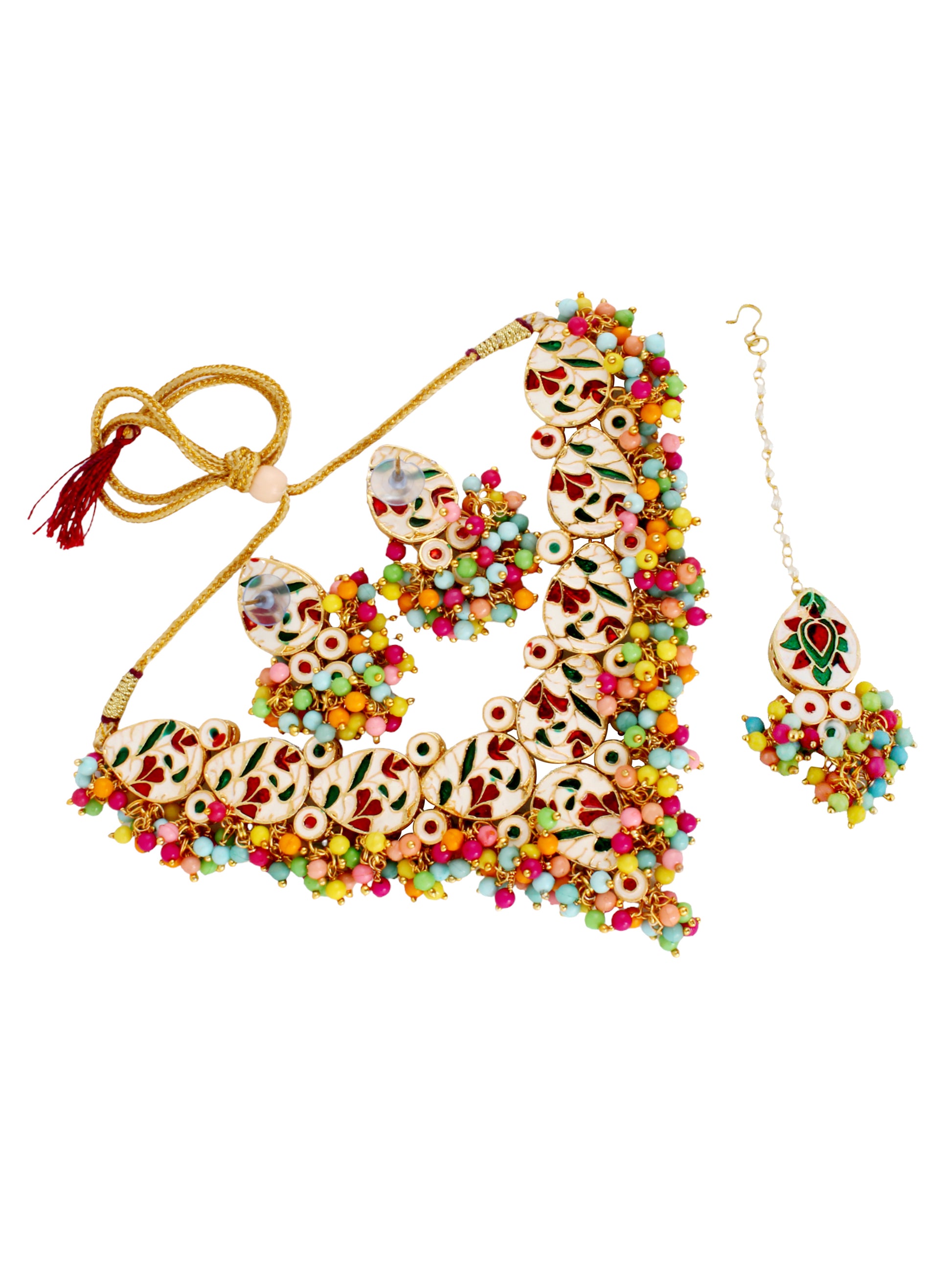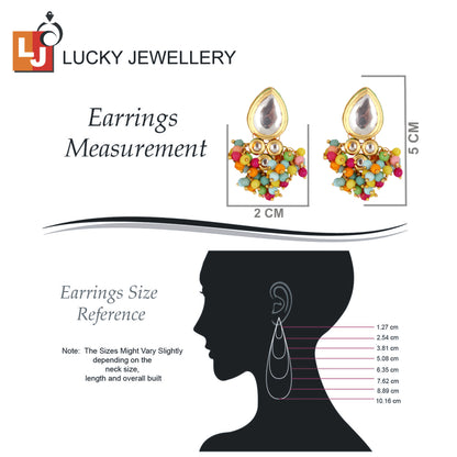 LUCKY JEWELLERY Back Meenakari 18k Gold Plated Multi Color Tika Earring Combo Uncut Big Faux Kundan Choker Necklace set (1122-J5SK-1698-MT) This stunning Necklace set from LUCKY JEWELLERY will certainly delight all the lovely Indian girls, who are ready to get married. This Necklace set includes matching earrings, one Necklace Set. Further, this set is studded with finest quality of coloured and white stones that render amazing look. |