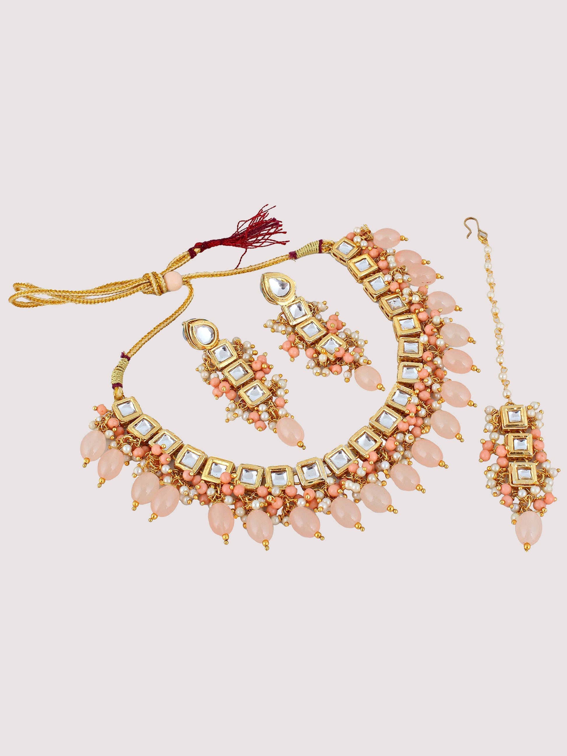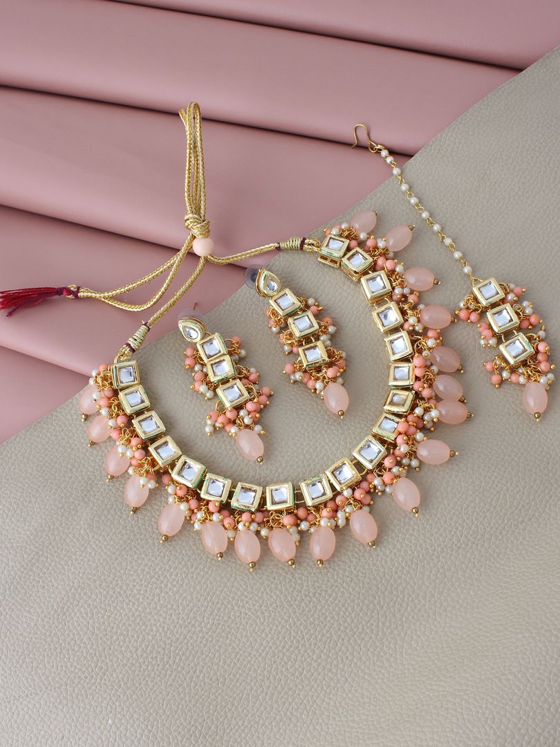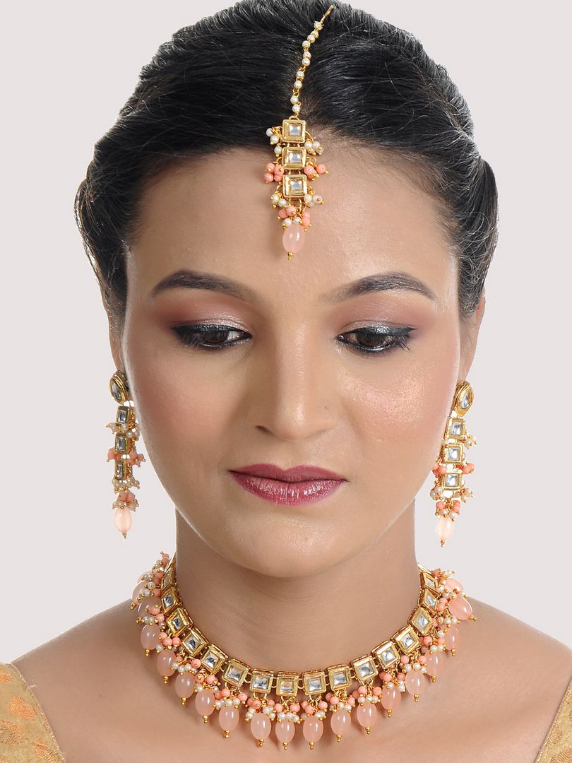 | LUCKY JEWELLERY Back Meenakari 18k Gold Plated Peach Color Tika Earring Combo Uncut Big Faux Kundan Choker Necklace set This stunning Necklace set from LUCKY JEWELLERY will certainly delight all the lovely Indian girls, who are ready to get married. This Necklace set includes matching earrings, one Necklace Set. Further, this set is studded with finest quality of coloured and white stones that render amazing look.