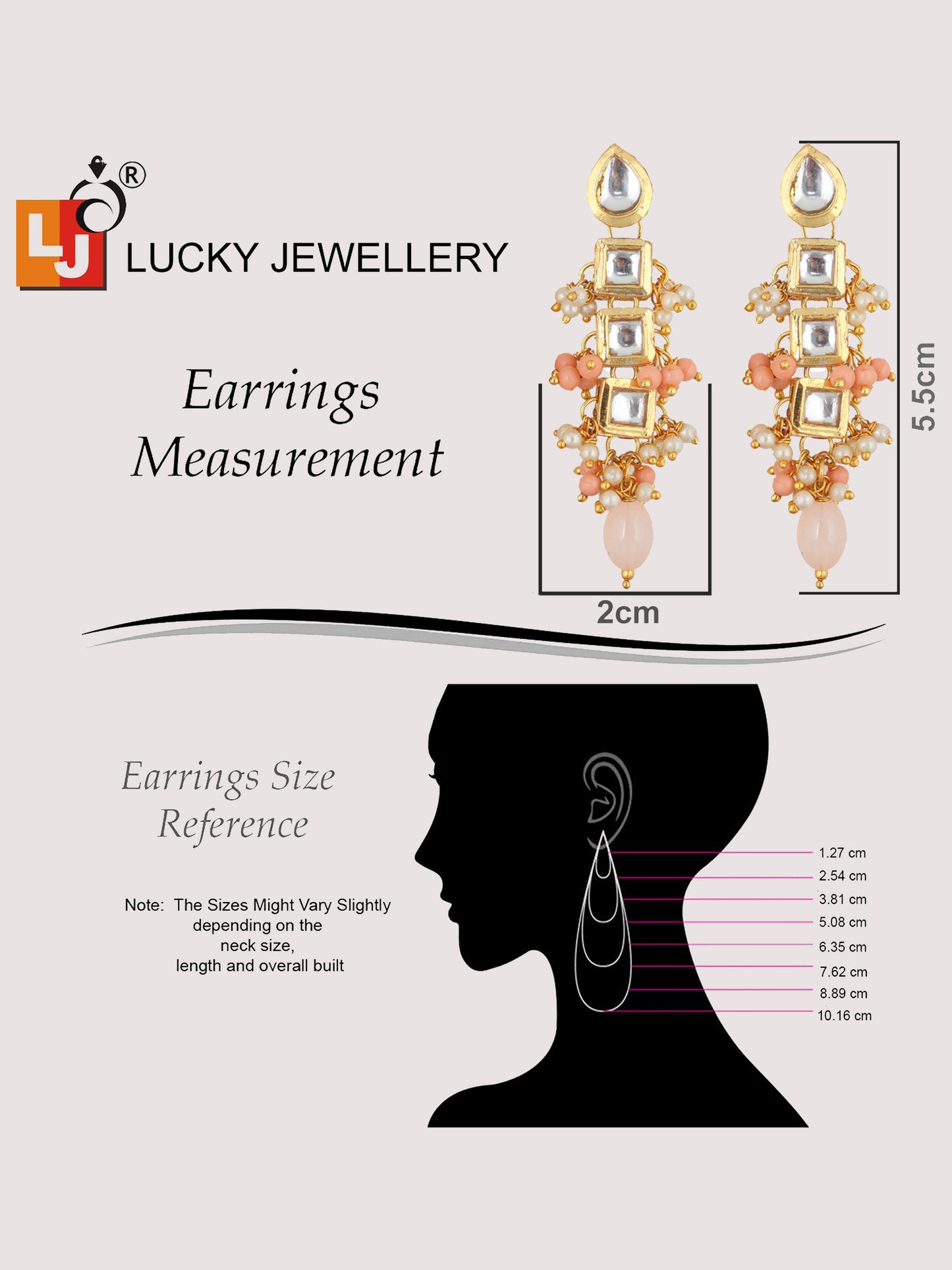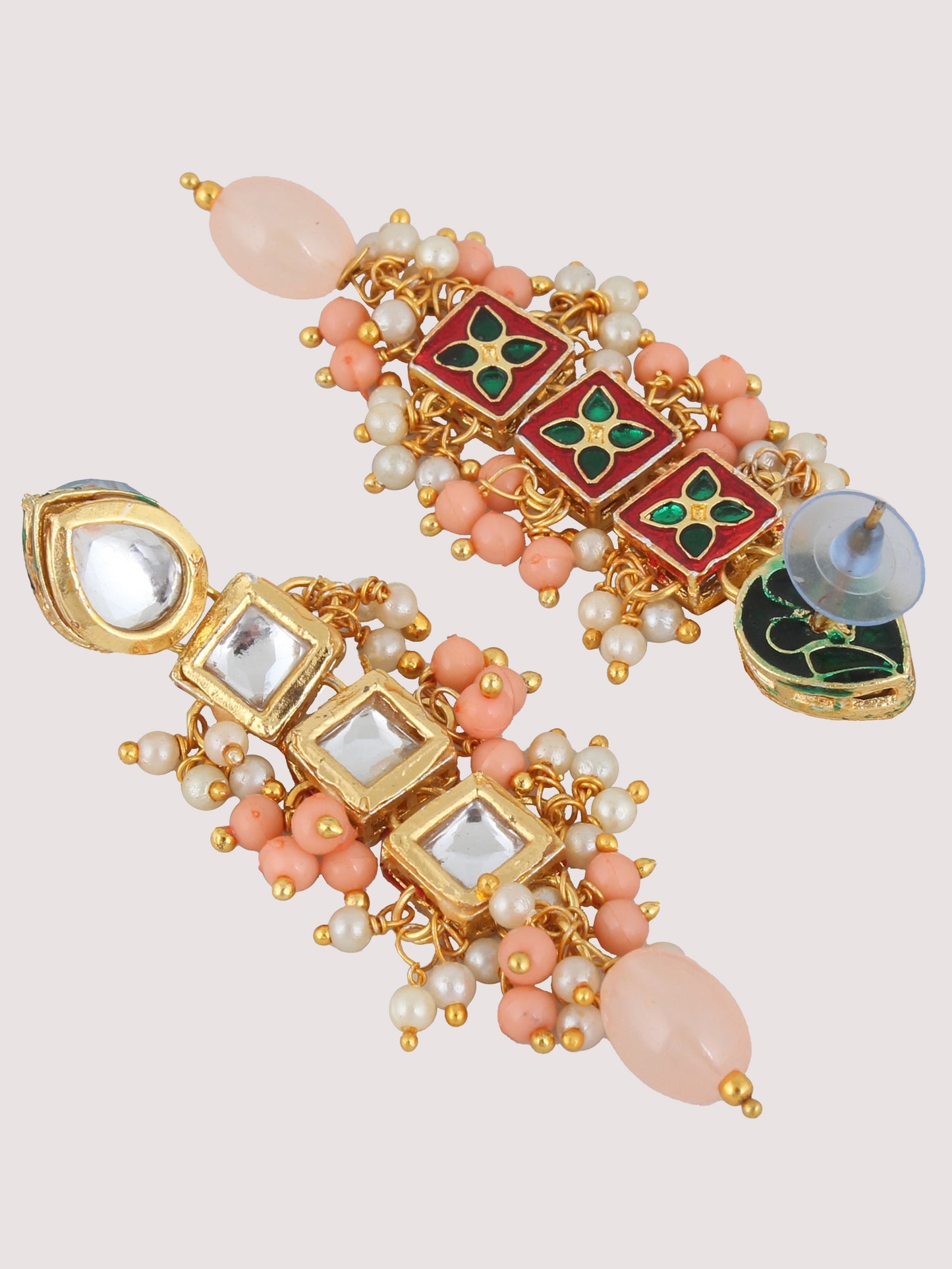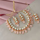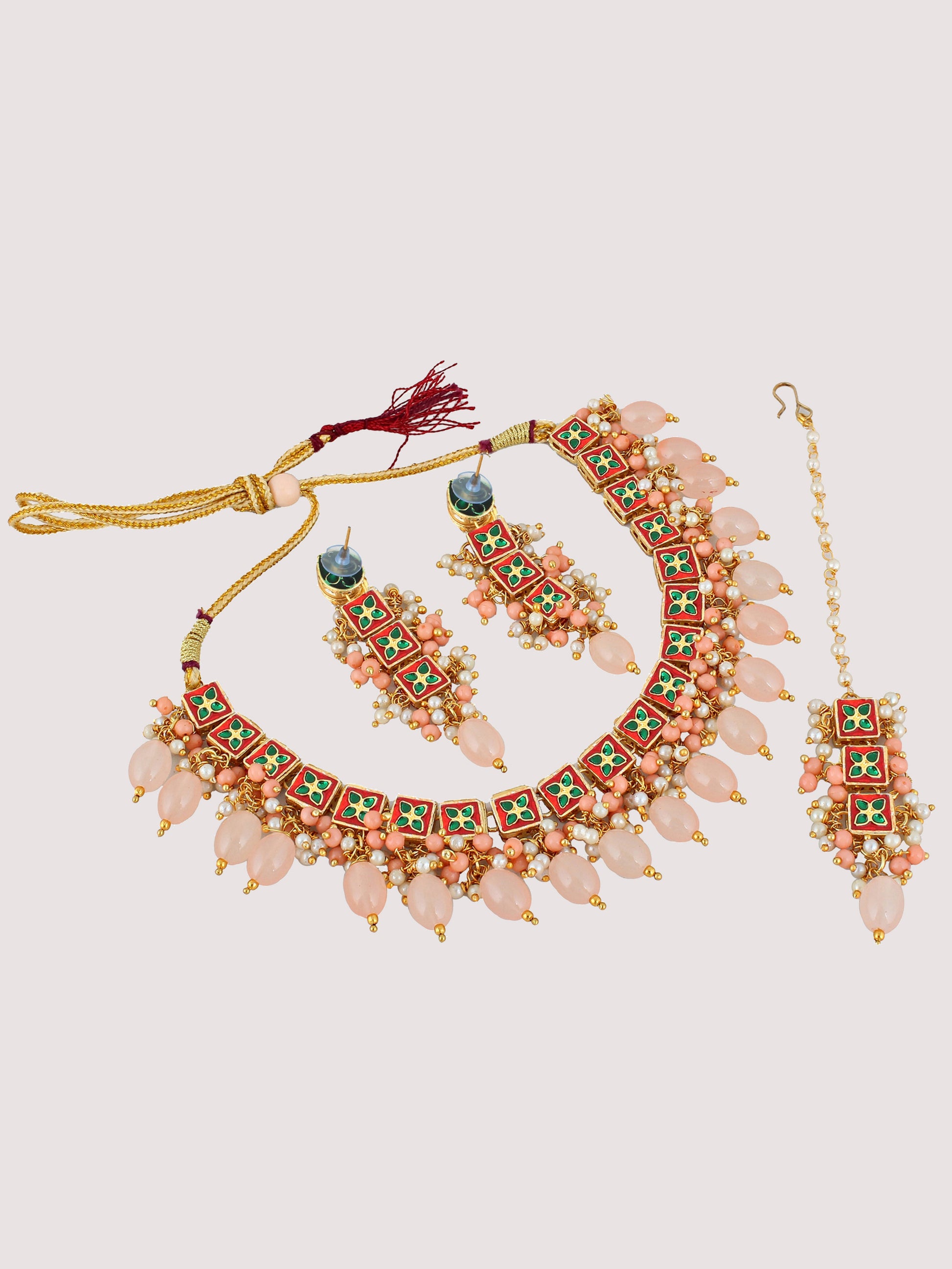 | LUCKY JEWELLERY Back Meenakari 18k Gold Plated Peach Color Tika Earring Combo Uncut Big Faux Kundan Choker Necklace set This stunning Necklace set from LUCKY JEWELLERY will certainly delight all the lovely Indian girls, who are ready to get married. This Necklace set includes matching earrings, one Necklace Set. Further, this set is studded with finest quality of coloured and white stones that render amazing look.
