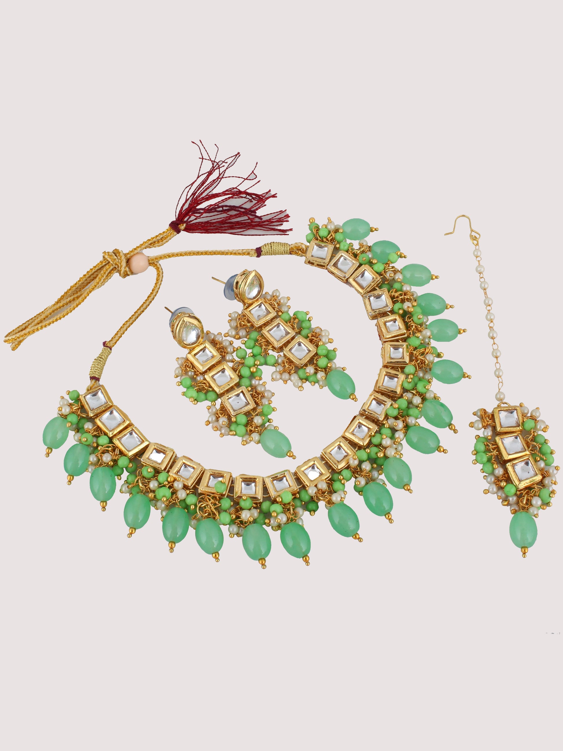 LUCKY JEWELLERY Back Meenakari 18k Gold Plated Green Color Tika Earring Combo Uncut Big Faux Kundan Choker Necklace set