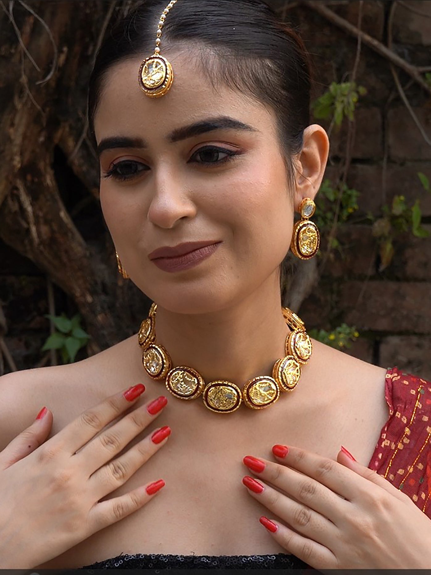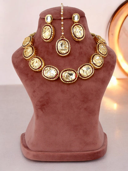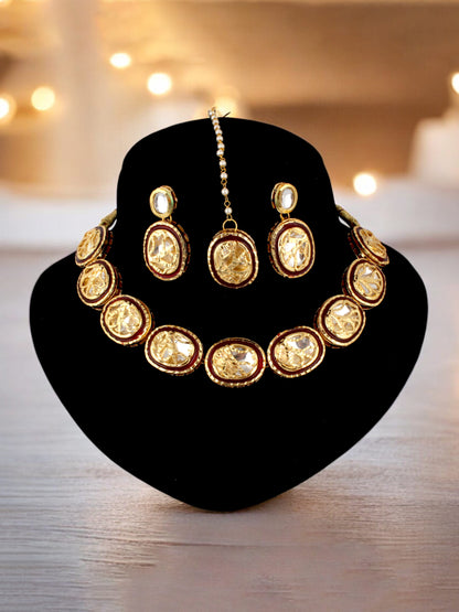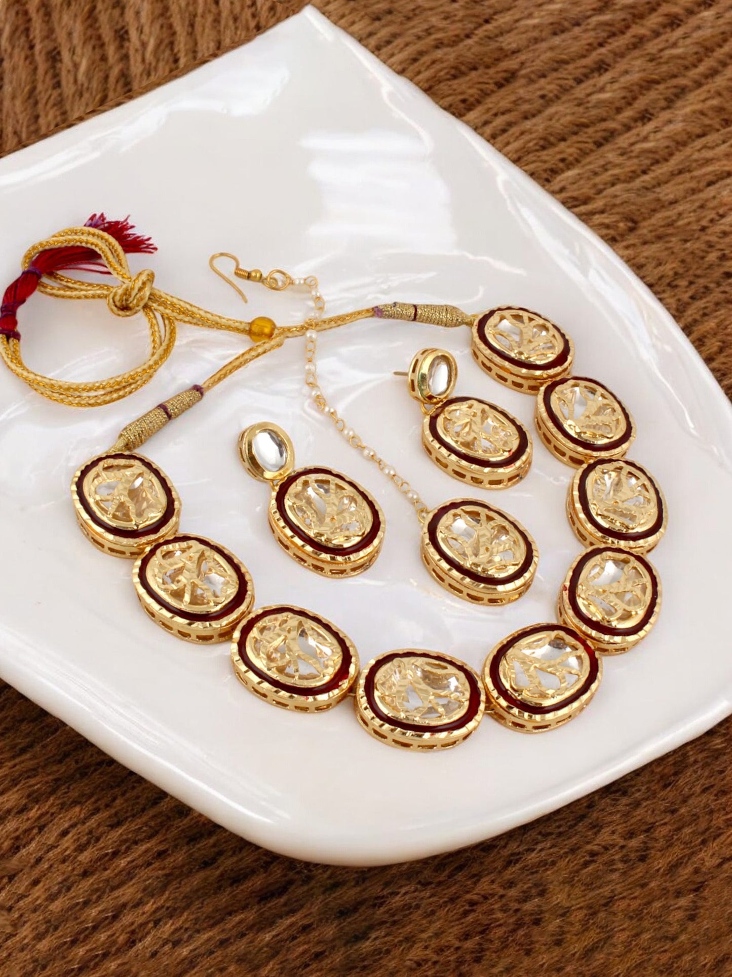 Lucky Jewellery Back Meenakari 18k Gold Plated Maroon Color Tika Earring Combo Set Uncut Big Kundan Stone Choker Necklace set Women & Girls The Kundan Choker Necklace Set with Back Meenakari is a beautiful piece of jewelry featuring sparkling Kundan stones set in a gold-plated choker. The back of the necklace has vibrant Meenakari enamel work, adding colorful floral designs. This set usually comes with matching earrings making it perfect for weddings or special occasions. It’s a lovely mix of traditional style and modern elegance. |