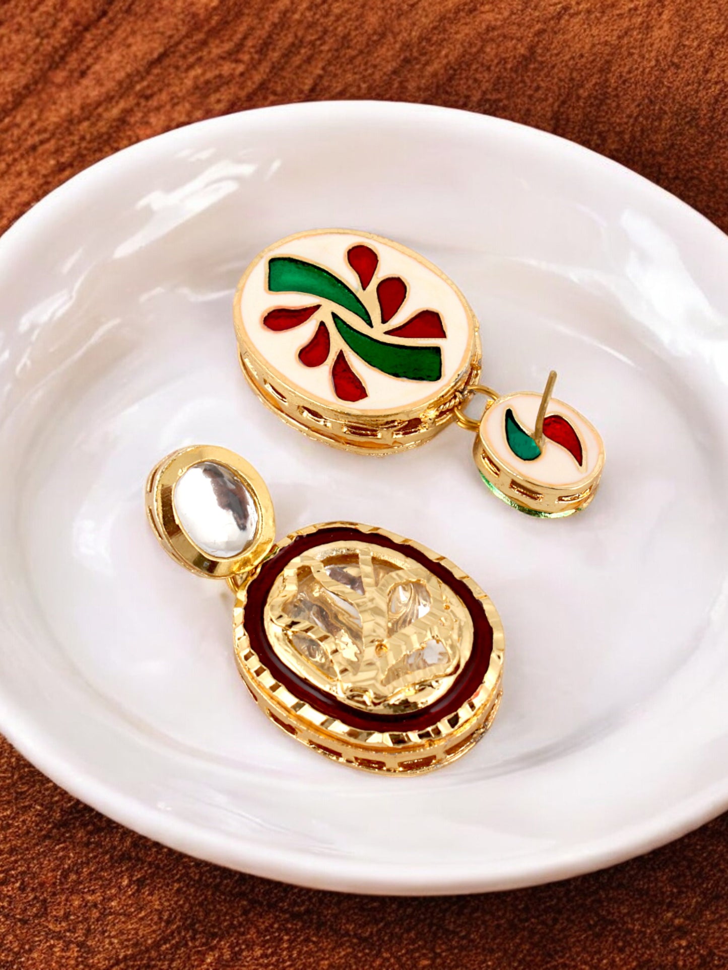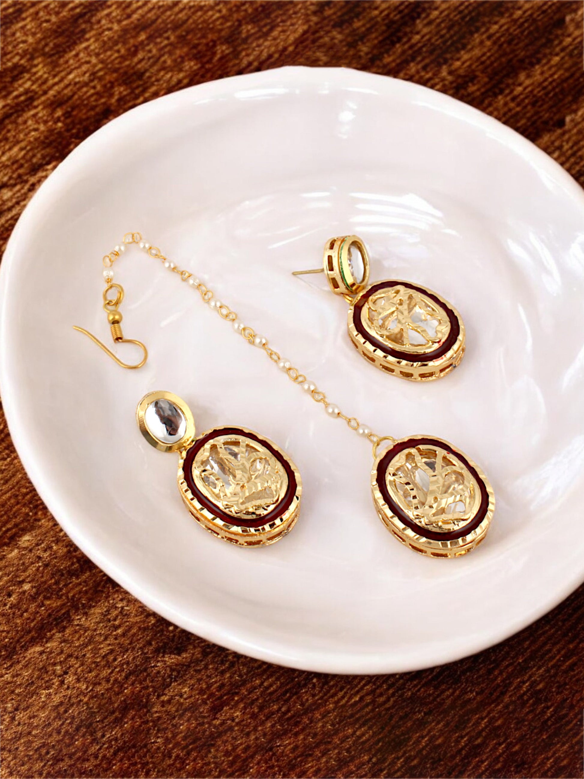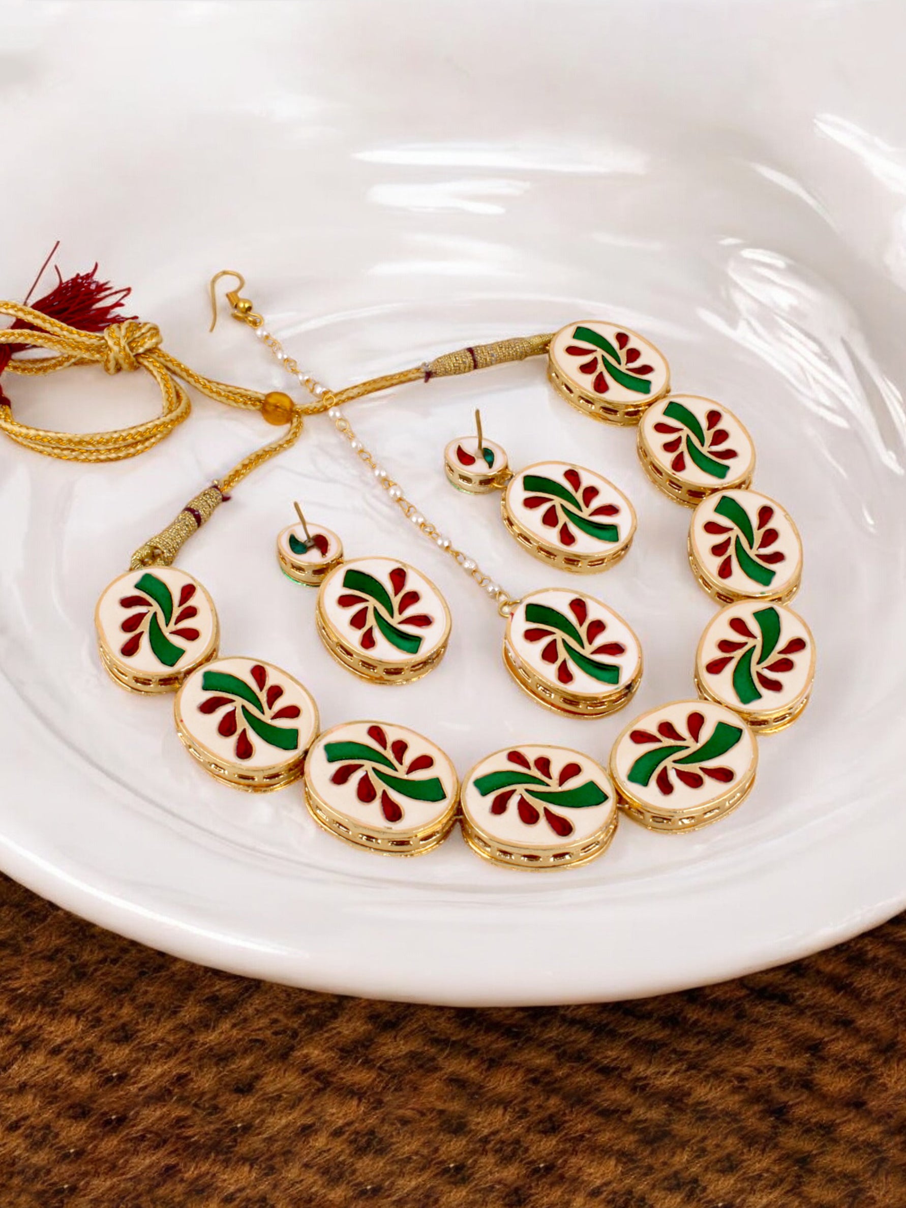 Lucky Jewellery Back Meenakari 18k Gold Plated Maroon Color Tika Earring Combo Set Uncut Big Kundan Stone Choker Necklace set Women & Girls The Kundan Choker Necklace Set with Back Meenakari is a beautiful piece of jewelry featuring sparkling Kundan stones set in a gold-plated choker. The back of the necklace has vibrant Meenakari enamel work, adding colorful floral designs. This set usually comes with matching earrings making it perfect for weddings or special occasions. It’s a lovely mix of traditional style and modern elegance. |