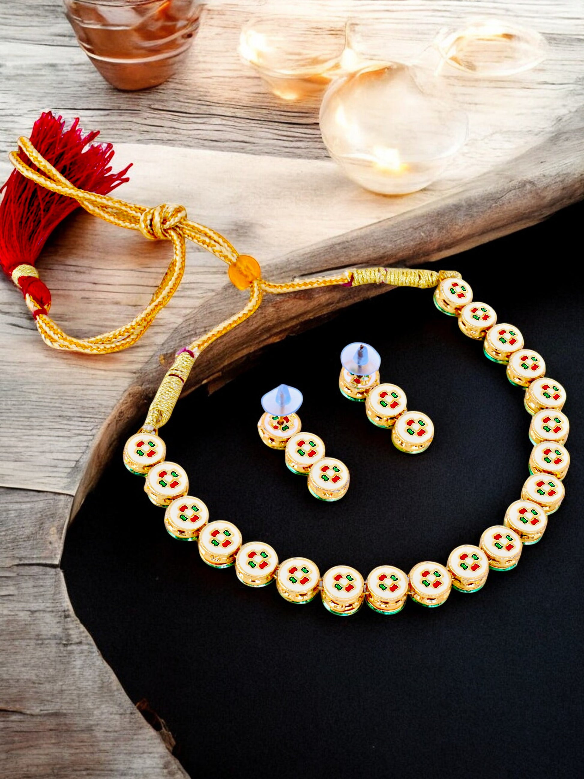 LUCKY JEWELLERY Back Meenakari 18K Gold Plated White color Uncut One Line Round Kundan Stone Necklace Set with Earrings Women & Girls