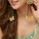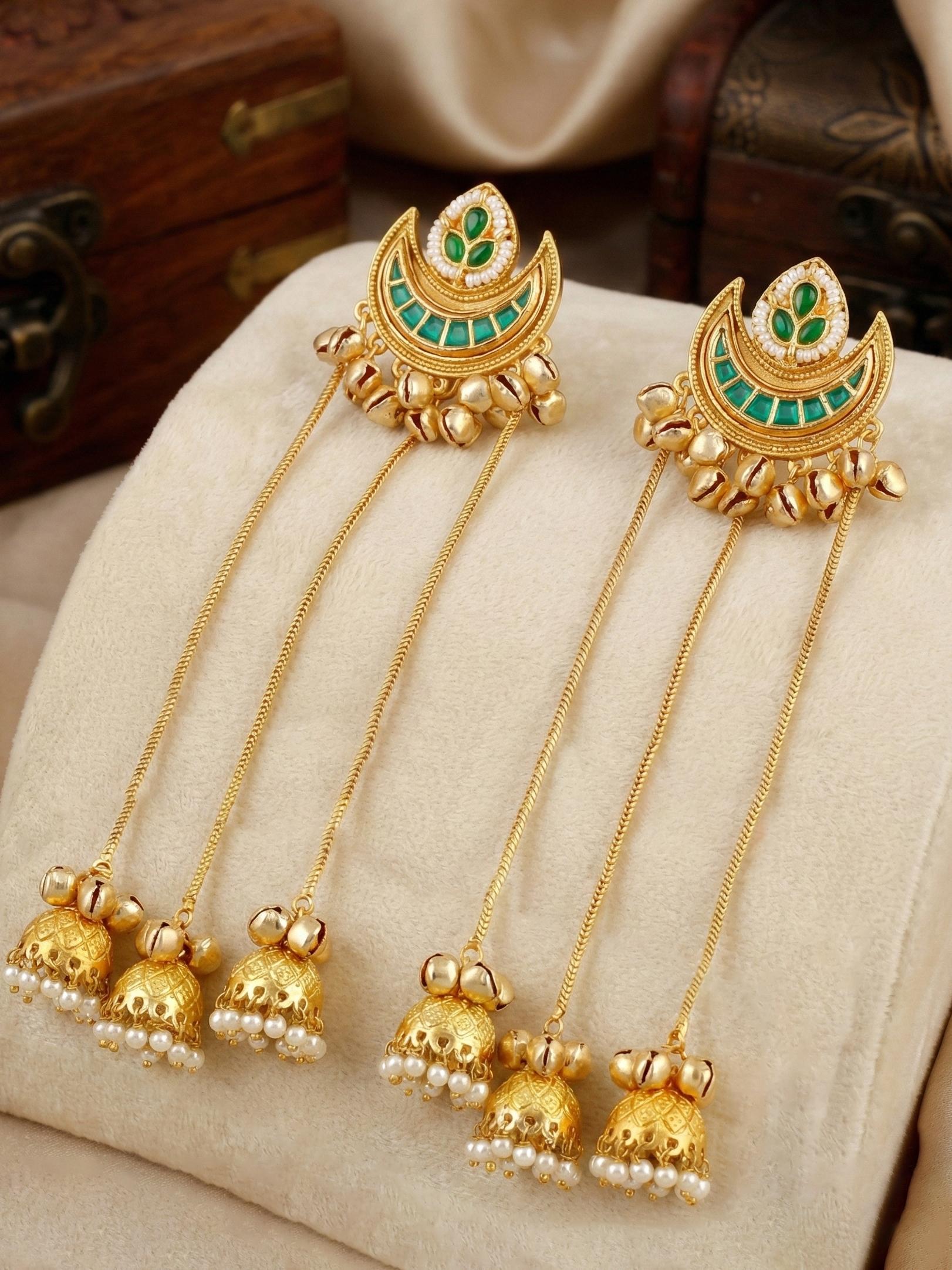LUCKY JEWELLERY Gold-Plated Kashmiri Earrings with Green Stone, Triple Chain Layer & Triple Jhumka Drops | Chandbali Style Earring Set for Girls & Women | Wedding, Festival & Gift Wear