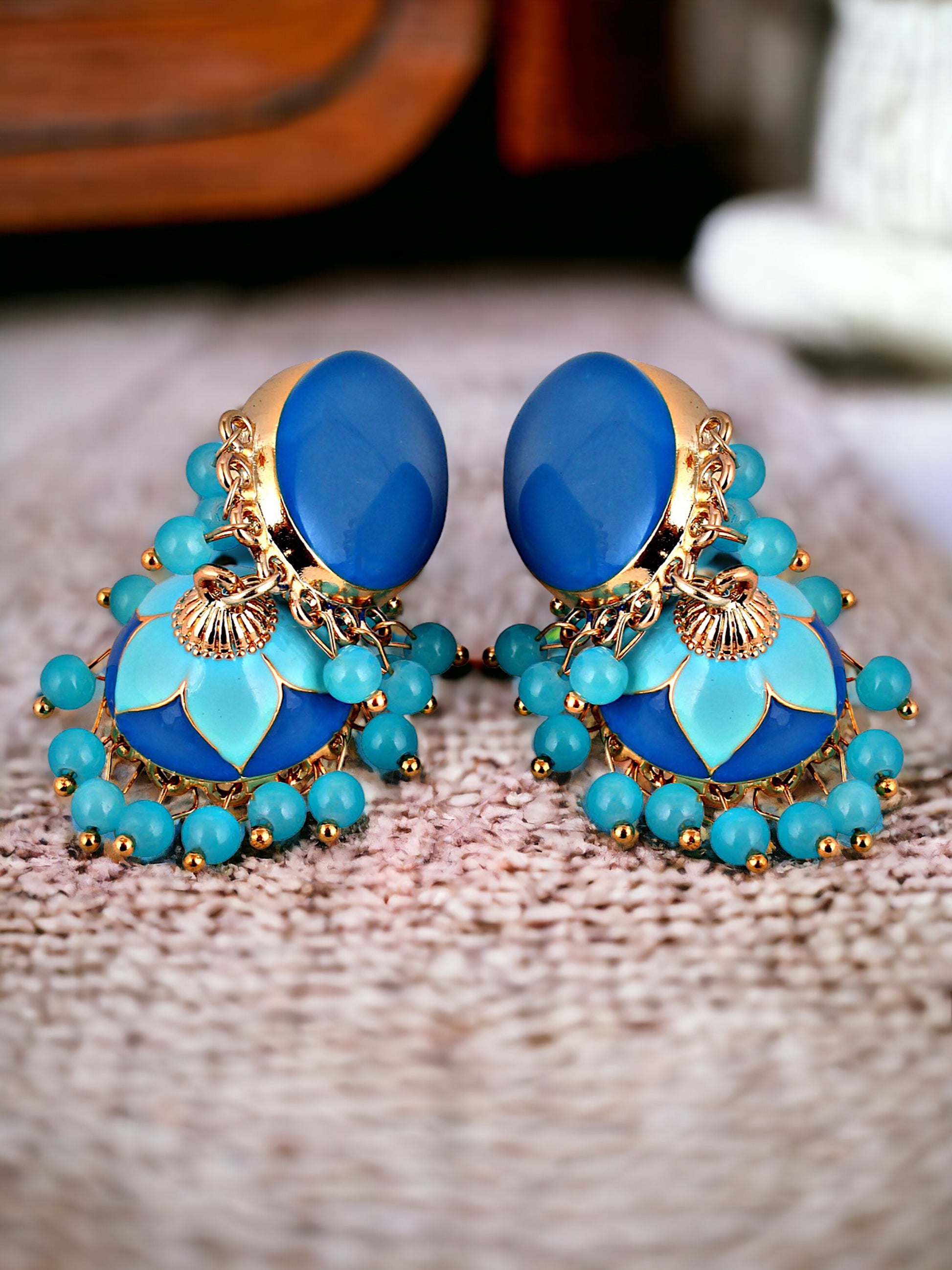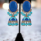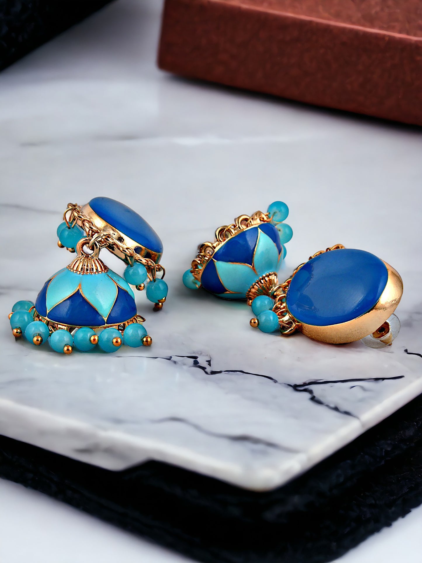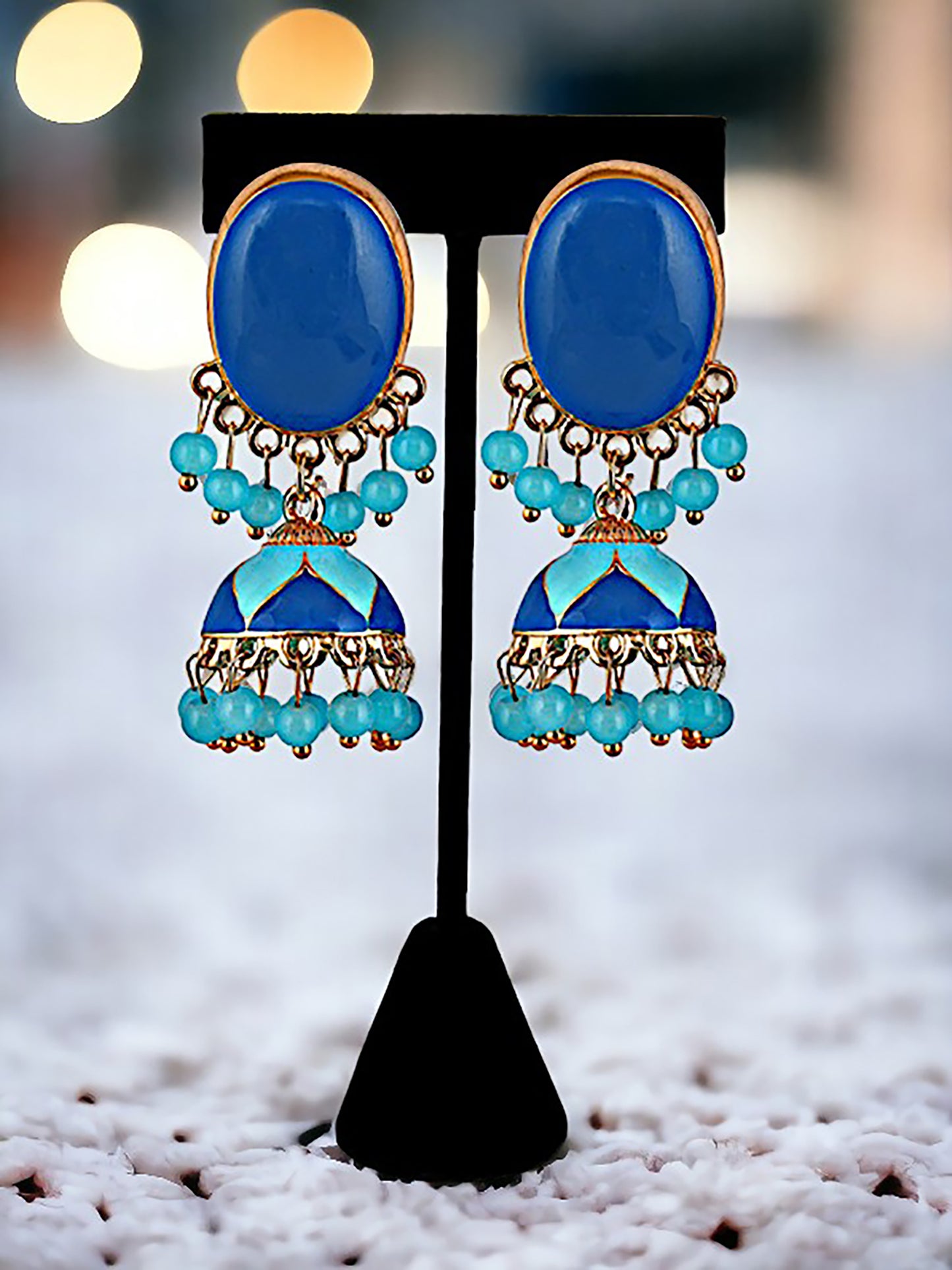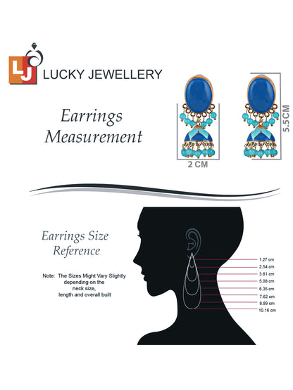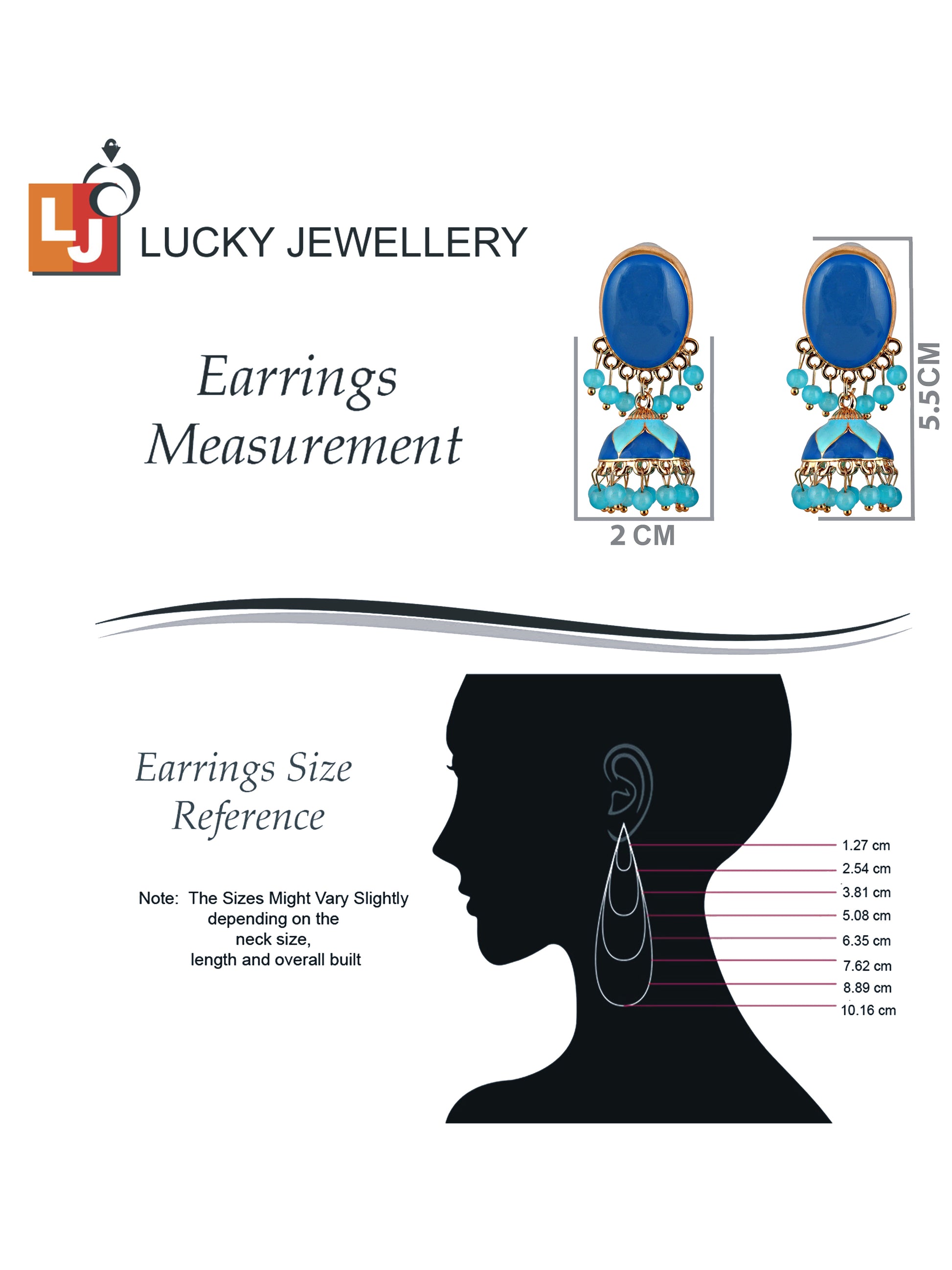 LUCKY JEWELLERY 18k Gold Plated Firoji And Blue Color Meenakari Jhumki Earring For Girls & Women Meenakari jhumki earrings are stunning and colorful earrings with a traditional touch. They're usually made of copper and are decorated with vibrant enamel designs. These designs can be anything from flowers to intricate patterns, all painted in bright colors like red, green, blue, and more. The jhumki style means they have a bell shape at the bottom, which adds a fun bounce when you wear them. These earrings are perfect for adding a pop of color and culture to any outfit, whether you're dressing up for a special occasion. They're a beautiful blend of tradition and style that's sure to catch everyone's eye!