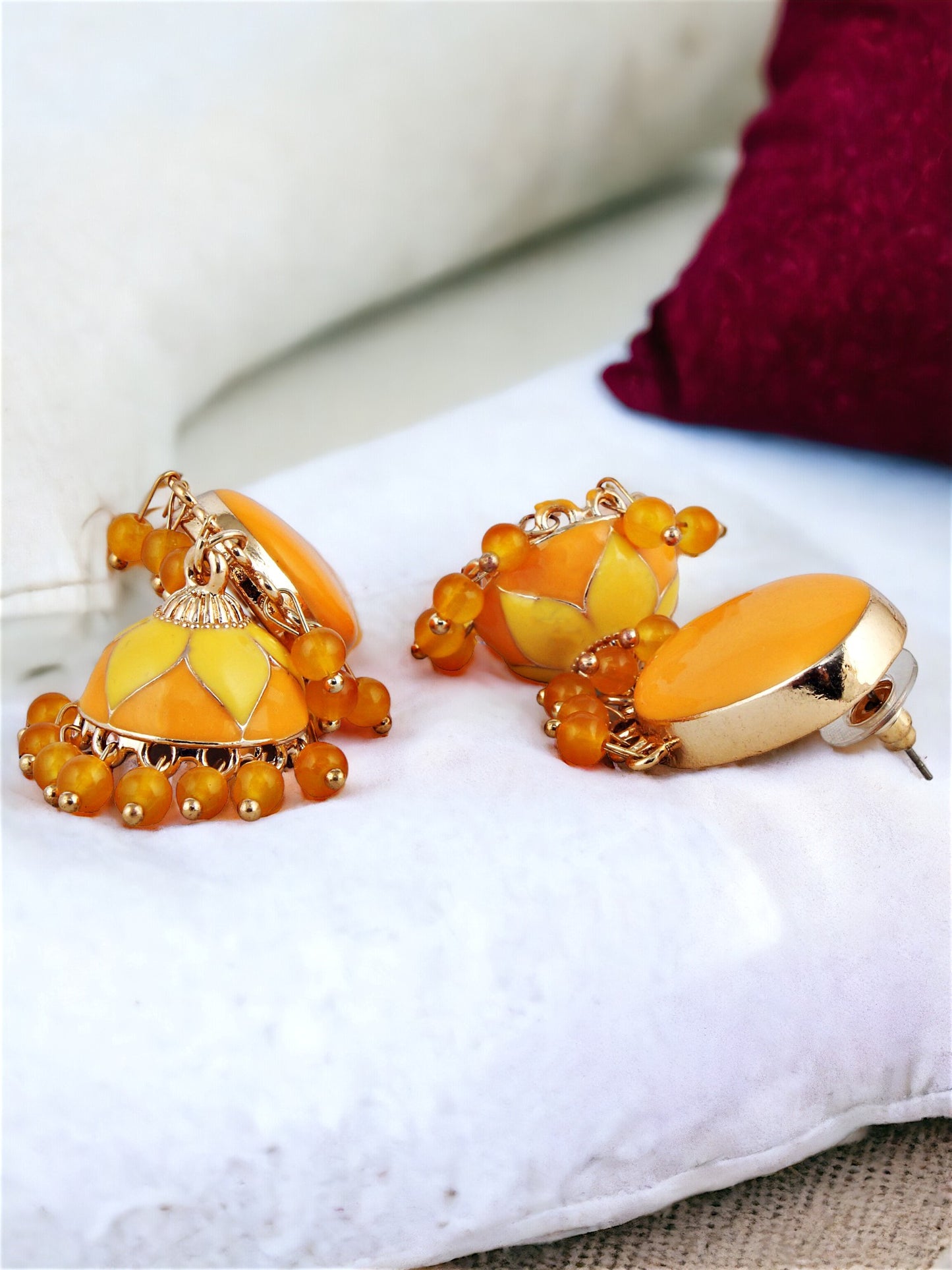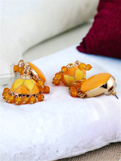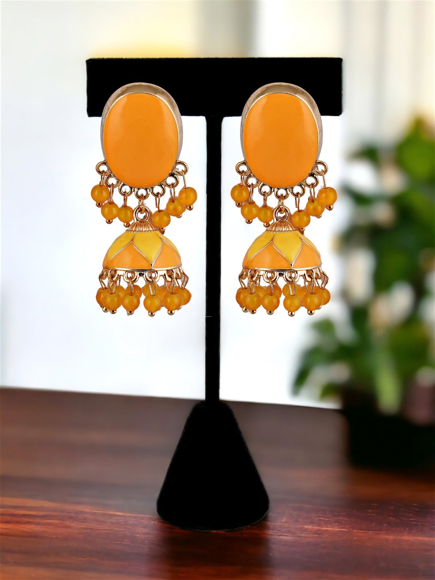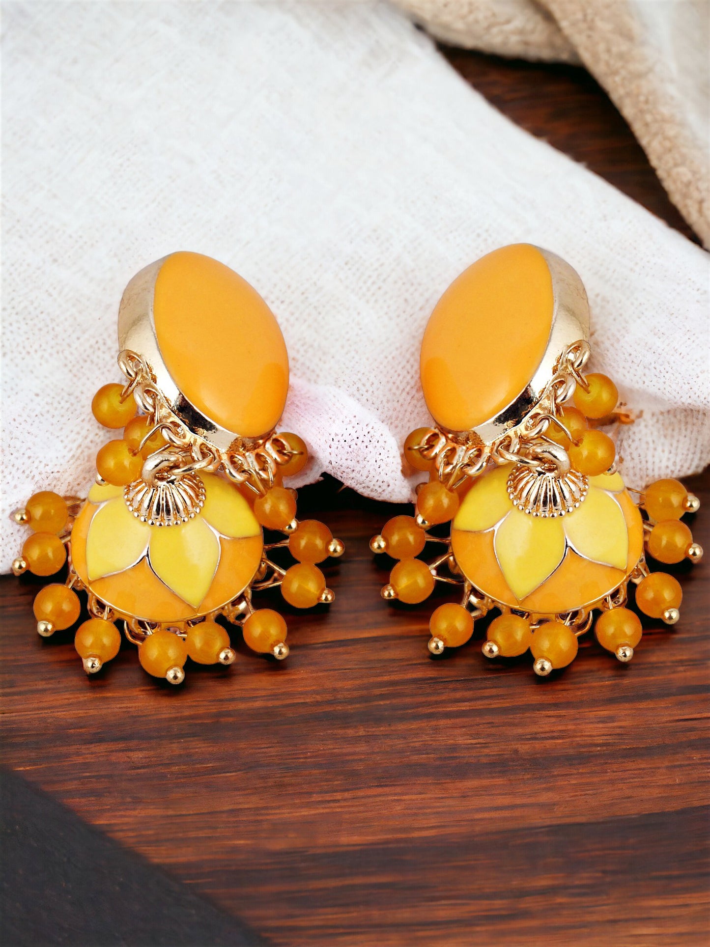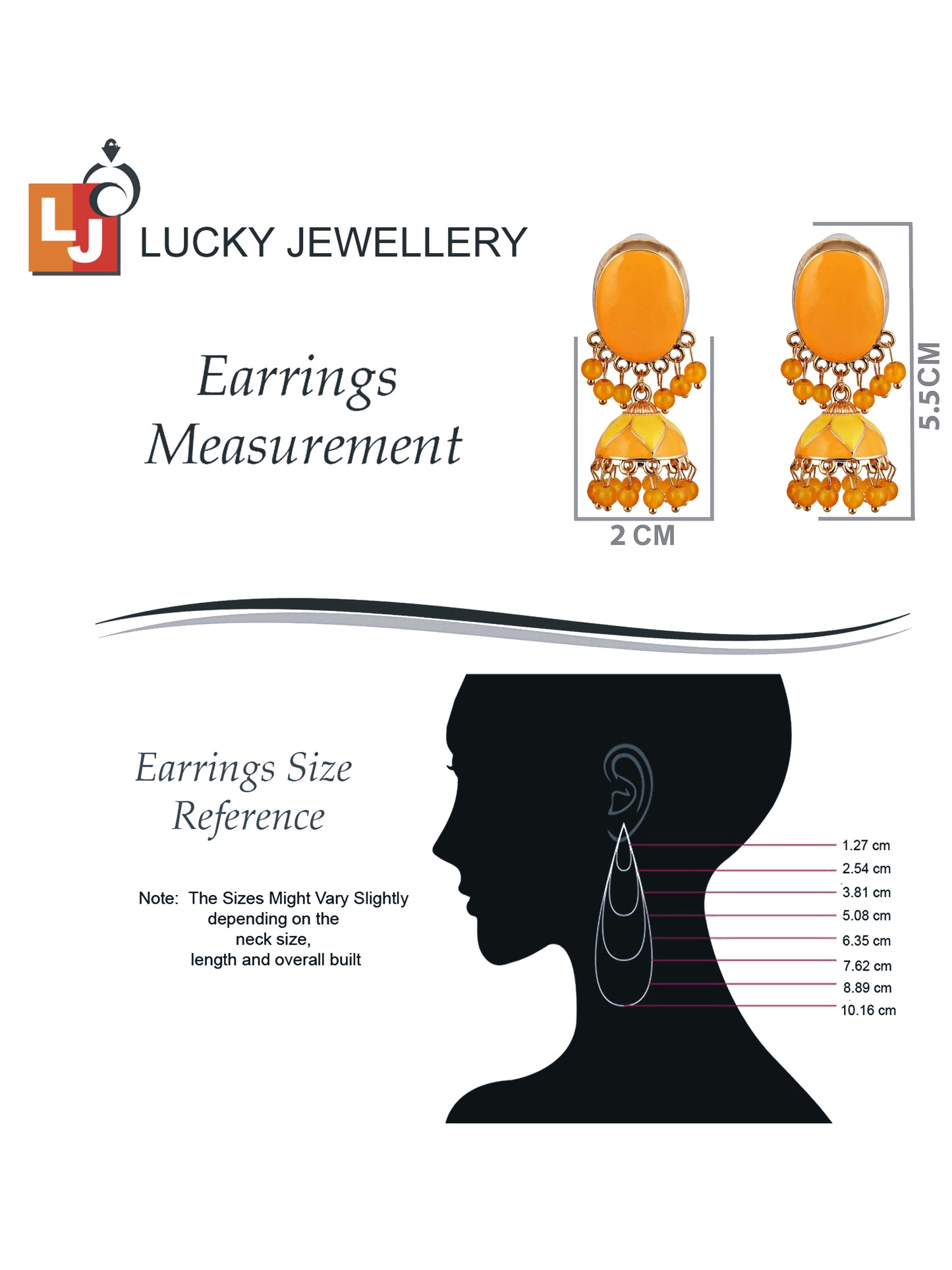 LUCKY JEWELLERY 18k Gold Plated Yellow Color Meenakari Jhumki Earring For Girls & Women Meenakari jhumki earrings are stunning and colorful earrings with a traditional touch. They're usually made of copper and are decorated with vibrant enamel designs. These designs can be anything from flowers to intricate patterns, all painted in bright colors like red, green, blue, and more. The jhumki style means they have a bell shape at the bottom, which adds a fun bounce when you wear them. These earrings are perfect for adding a pop of color and culture to any outfit, whether you're dressing up for a special occasion. They're a beautiful blend of tradition and style that's sure to catch everyone's eye!