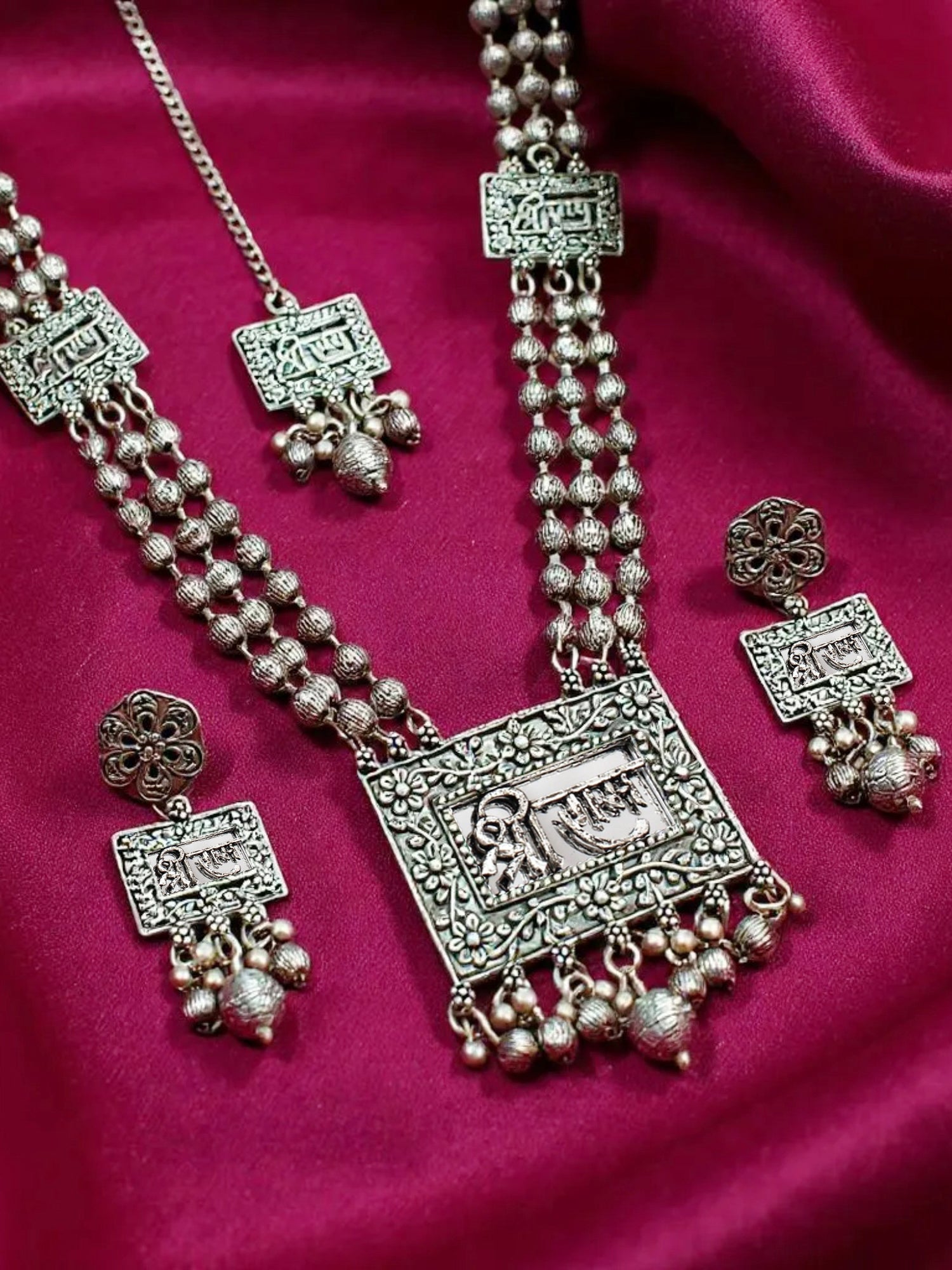 Elevate your traditional and boho style with the LUCKY JEWELLERY Oxidised Silver Temple Jewellery Long Necklace Set. Crafted meticulously with black metal and oxidised silver finish, this exquisite set features a beautifully detailed Shri Ram design that brings a divine and spiritual touch to your ensemble. Perfectly suited for women and girls, this long necklace set includes matching earrings and a maang tikka, creating a complete ethnic look for weddings, festivals, religious ceremonies, or everyday wear. The intricate temple jewellery craftsmanship reflects timeless Indian artistry blended with a trendy boho vibe, making it an ideal choice for those who love fusion fashion. Lightweight yet durable, this set pairs effortlessly with sarees, lehengas, and ethnic dresses, adding elegance and charm to your appearance. Whether you’re attending a special occasion or looking for a unique accessory to enhance your daily outfits, this Hare Krishna temple jewellery set is a must-have addition to your collection.