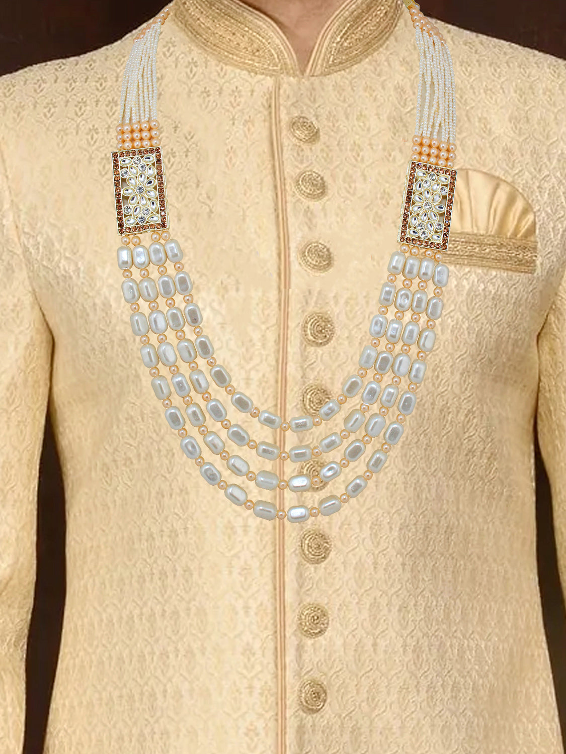 Enhance your wedding look with a stunning multi-layered necklace designed for grooms. This elegant Dulha Haar features long dulha haar with a regal combination beads and pearls, adding a royal charm to your sherwani or ethnic attire. Perfect for weddings, receptions, traditional ceremonies, and festive occasions, this groom necklace complements both classic and modern styles. Crafted with intricate detailing and alloy materials, it ensures a grand and majestic appearance. Lightweight and comfortable, it allows you to carry your look with confidence throughout the event.