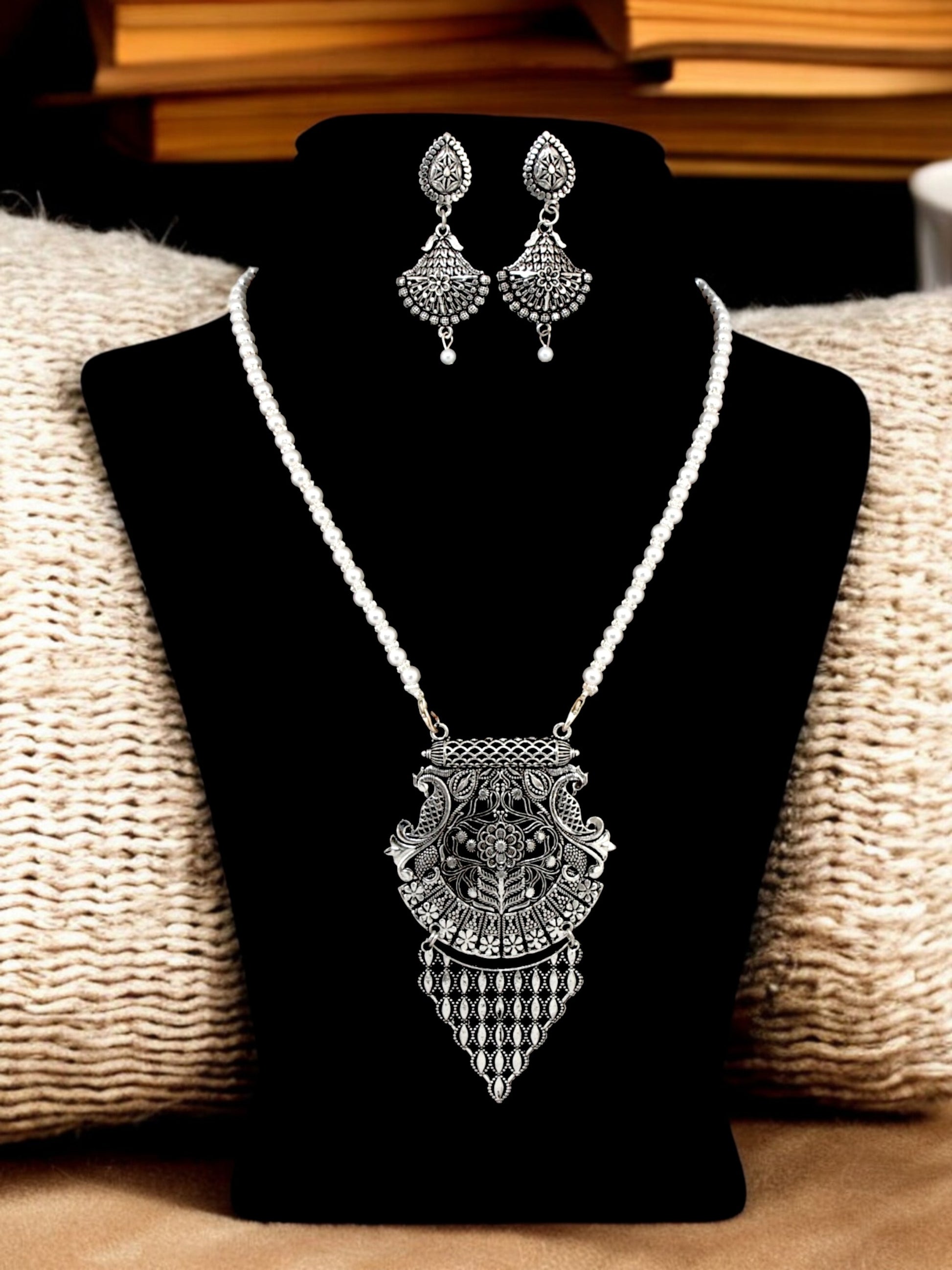 Make a style statement with this beautifully designed oxidized necklace set with a pearl chain and matching earrings. Crafted for women and girls who love traditional yet trendy jewelry, this set features intricate detailing and a stunning oxidized finish that enhances its antique charm. The elegant pearl-beaded chain adds a touch of sophistication, making it a perfect accessory for any occasion.